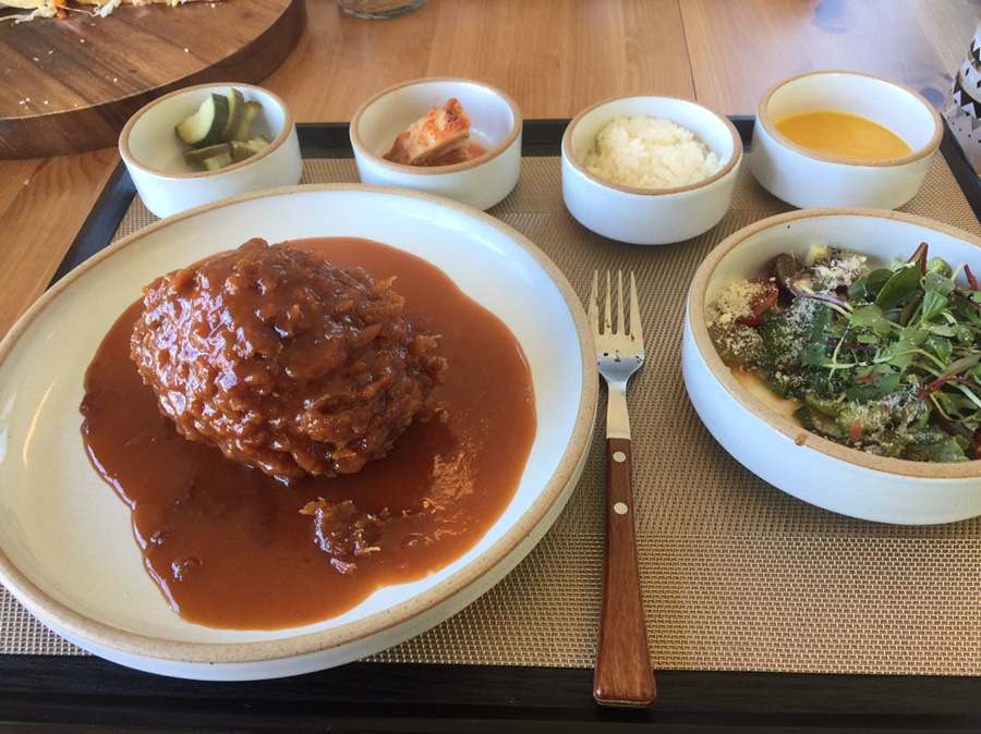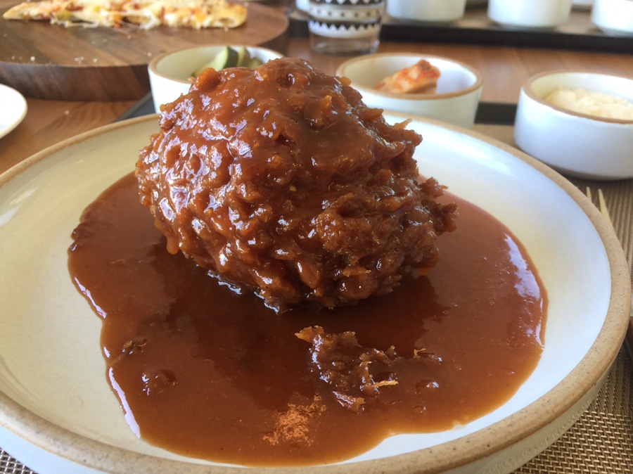 돈가스도 곧 이어서 나왔네요. 돈가스는 주먹밥 모양으로 둥근 모양이고 안에는 치즈와 피망으로 채워져 있습니다. 둥그런 돈가스 속 재료를 익히기 위해서 오래 조리를 해서 그런지 외부 고기는 조금 퍽퍽한 느낌이 들었네요. 치즈는 풍성하게 들어있어서 돈가스 고기보다 치즈에 중점 해서 만드신 거 같네요. 치즈만 들어있었으면 아이들이 잘 먹었을 거 같은데, 피망이 들어있어 아이들이 잘 먹지는 못했네요. 맛이 없지는 않은데... 그렇다고 특별하지도 않고 그냥 무난한 맛이었네요.