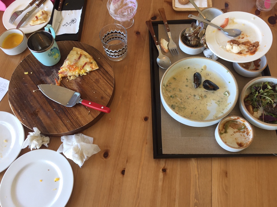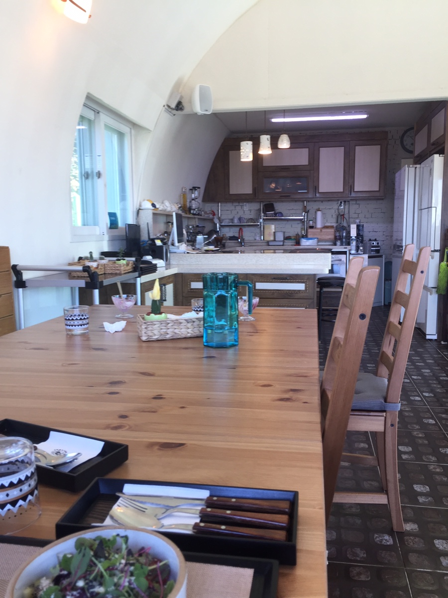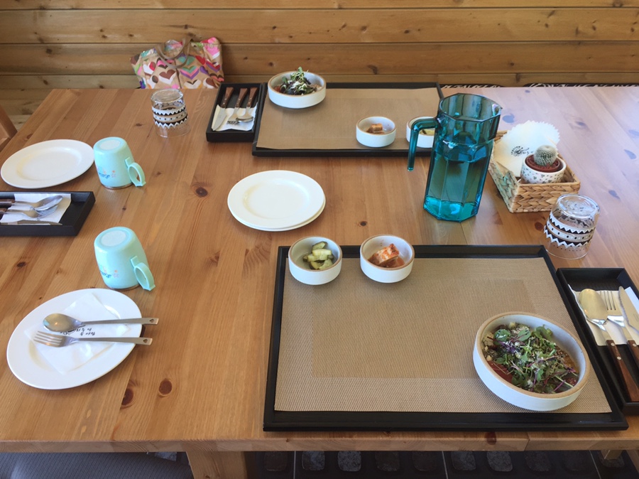 식당에 도착하면 아이들 식기류와 기본 반찬과 샐러드가 준비되어 있습니다. 어르신(할아버지, 할머니 나이 좀 있으심) 두 분이 요리와 서빙을 하고 있습니다. 아이들과 함께 먹을 밥이 들어있는 리조토 같은 걸 주문하고 싶었는데 좀 아쉬움이 있었지만, 피자와 돈가스가 있으니~ 식당에 2시경 도착하였는데 식당 내부에 테이블이 6개 정도 있었고, 두 테이블에서 손님이 식사를 하고 있었습니다.
