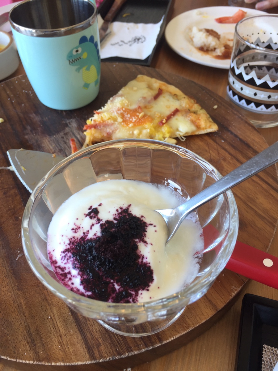 식사를 다 마치면 후식이 나와요. 후식은 요거트, 아이스크림이 나옵니다. 아이들은 아이스크림, 어른들은 요거트를 주문해서 먹었네요. 요거트에 복분자 가루를 살짝 뿌려서 나오고요.