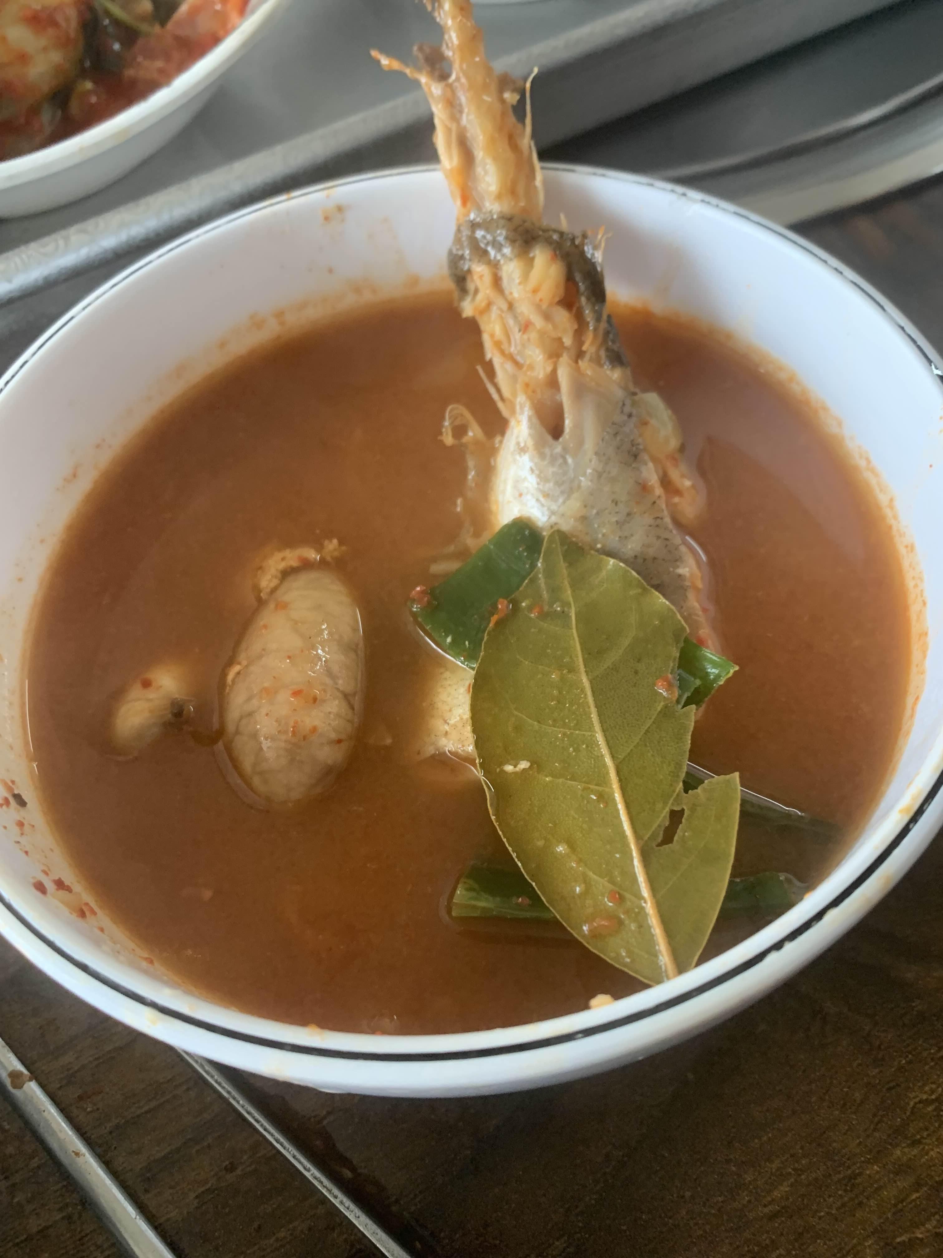 튼실한 동태의 살코기를 뒤로하고 국물을 맛보았습니다. 국물이 개운하기보다는 텁텁한, 국물인데... 이게 무슨 맛일까?라는 생각이 들더군요. 국물의 요리저리 저어보니.... 동태찌개에서 보기 힘든 월계수 잎이 들어 있더군요.