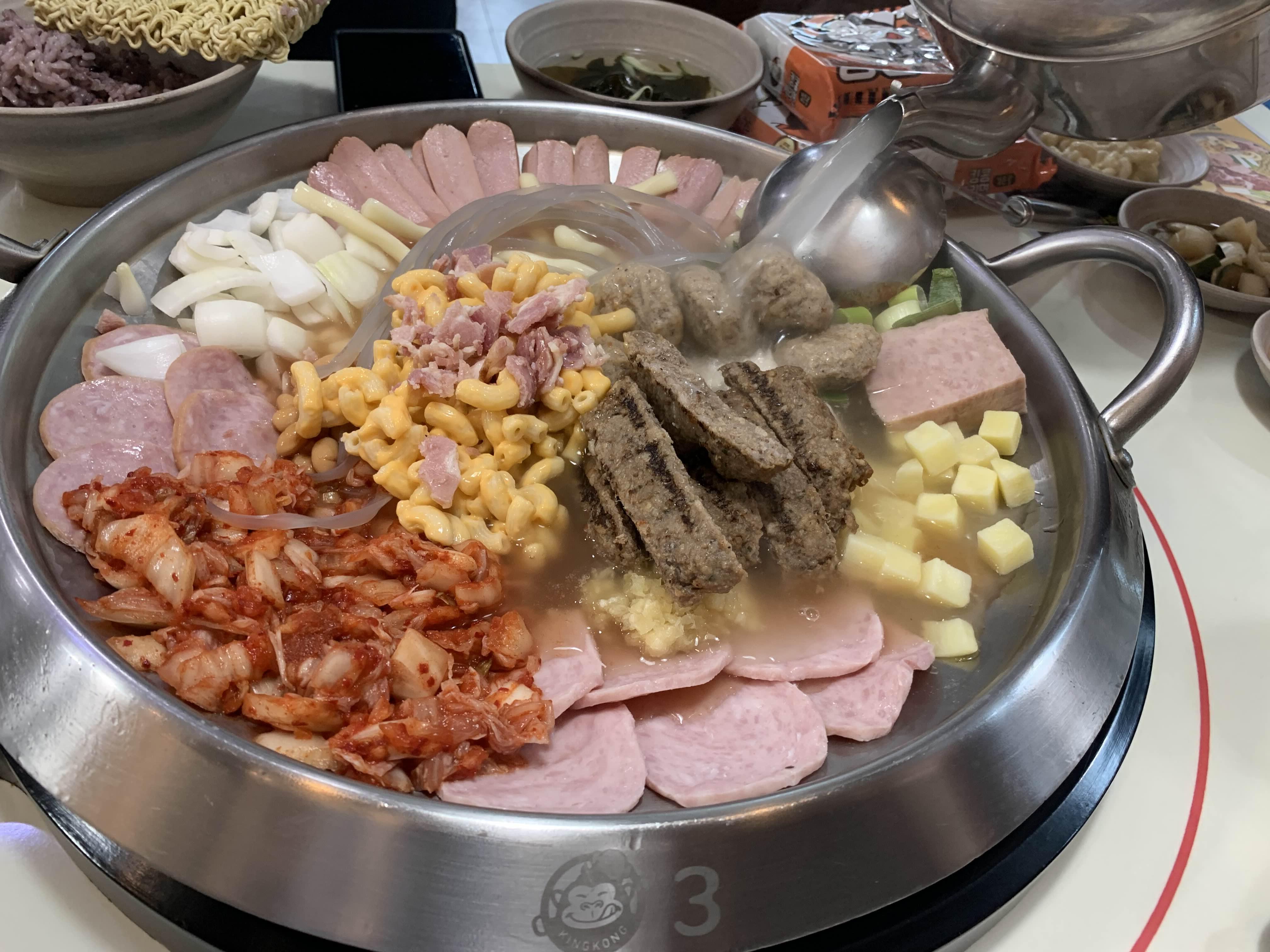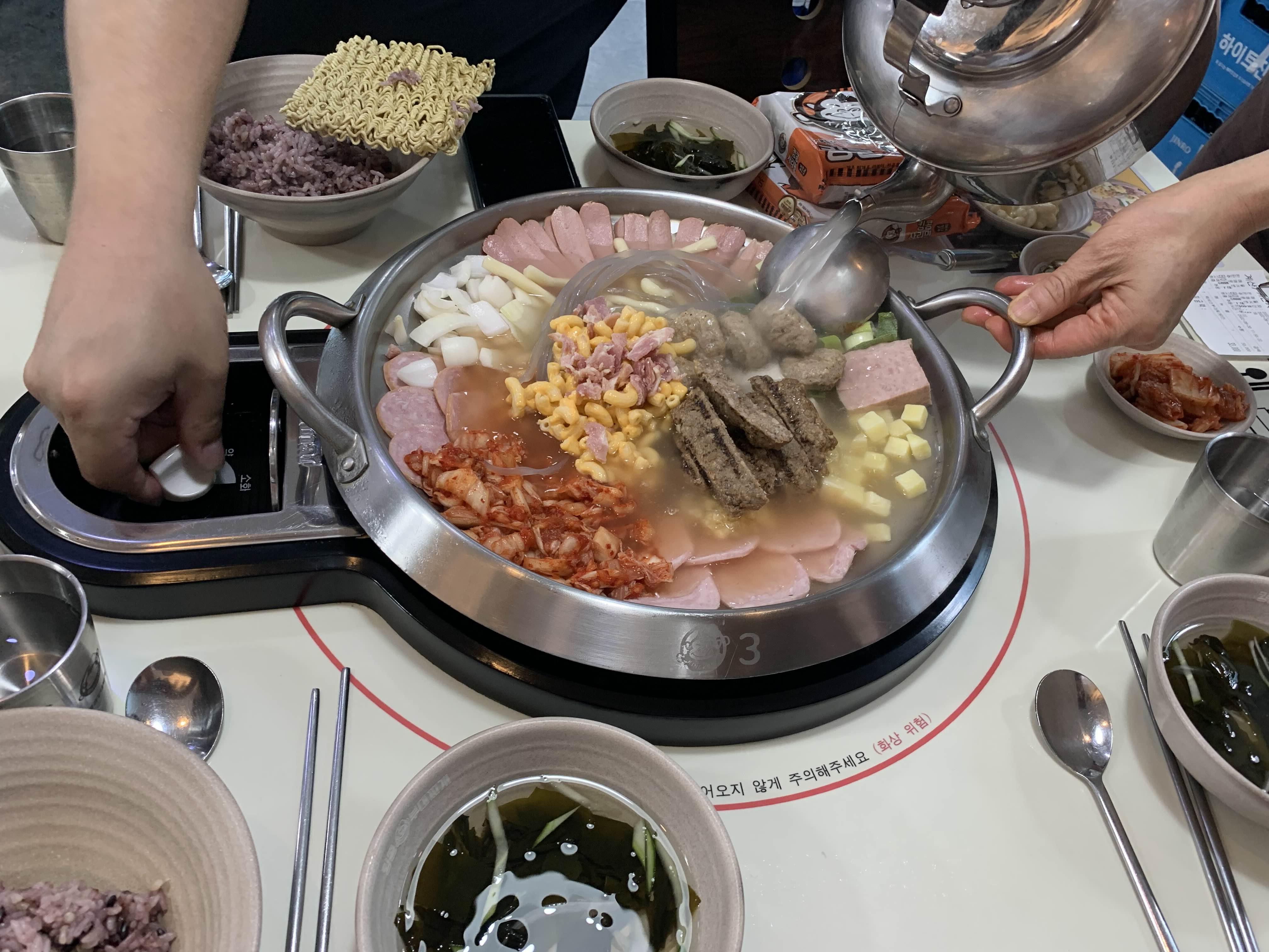 부대찌개에 라면이 빠지면 안 되겠죠? 그래서 3인분 부대찌개에 라면 2개를 넣어보았습니다. 라면 2개가 좀 많아 보이기는 하나.... 라면 빠진 부대찌개는 생각하기 힘든 비주얼이라!!! 라면을 넣어 사리를 건저 먹고 그 후 육수를 추가하여 햄의 진득한 국물을 우려서 먹는 게 부대찌개의 진리겠죠!!