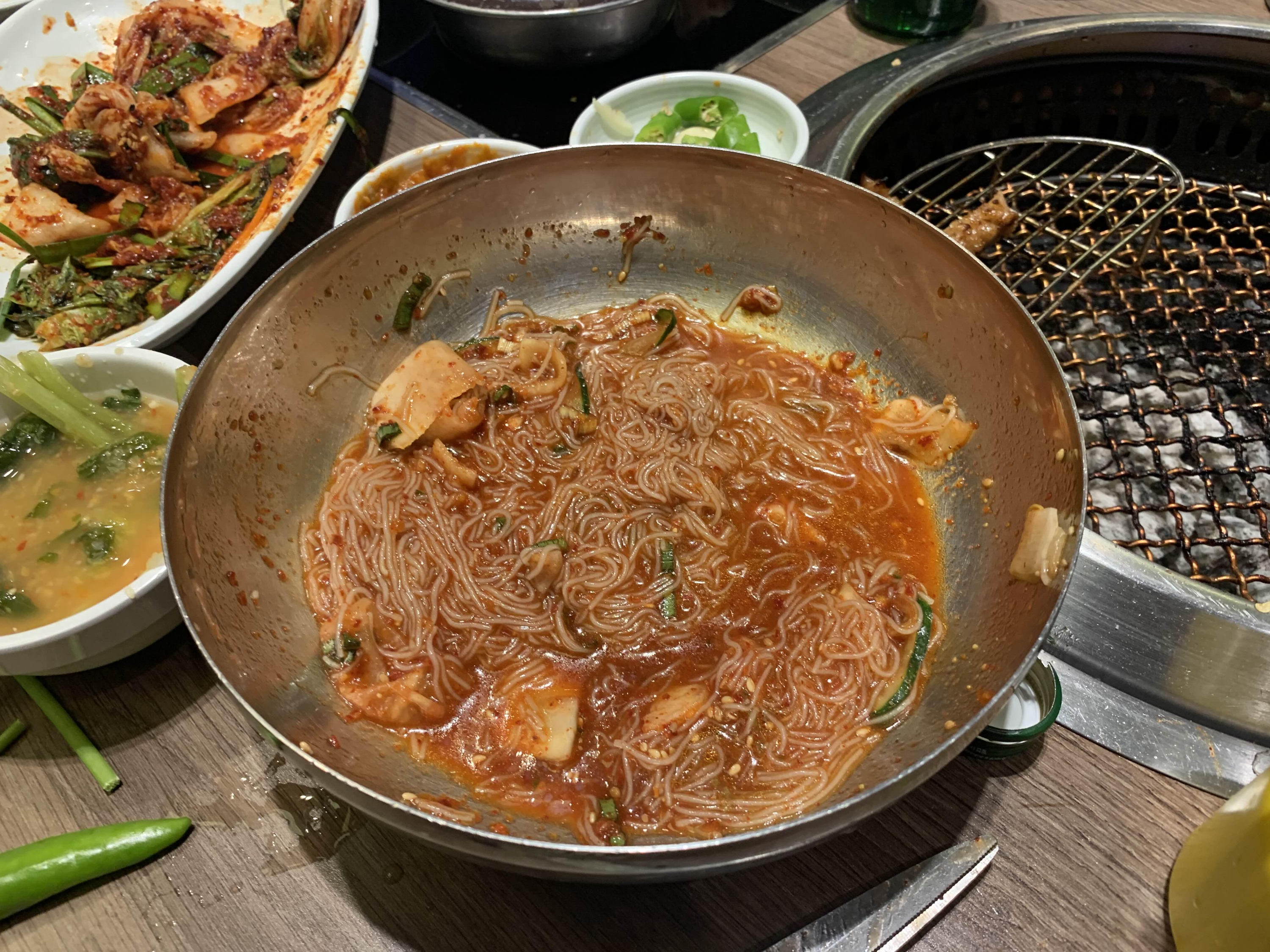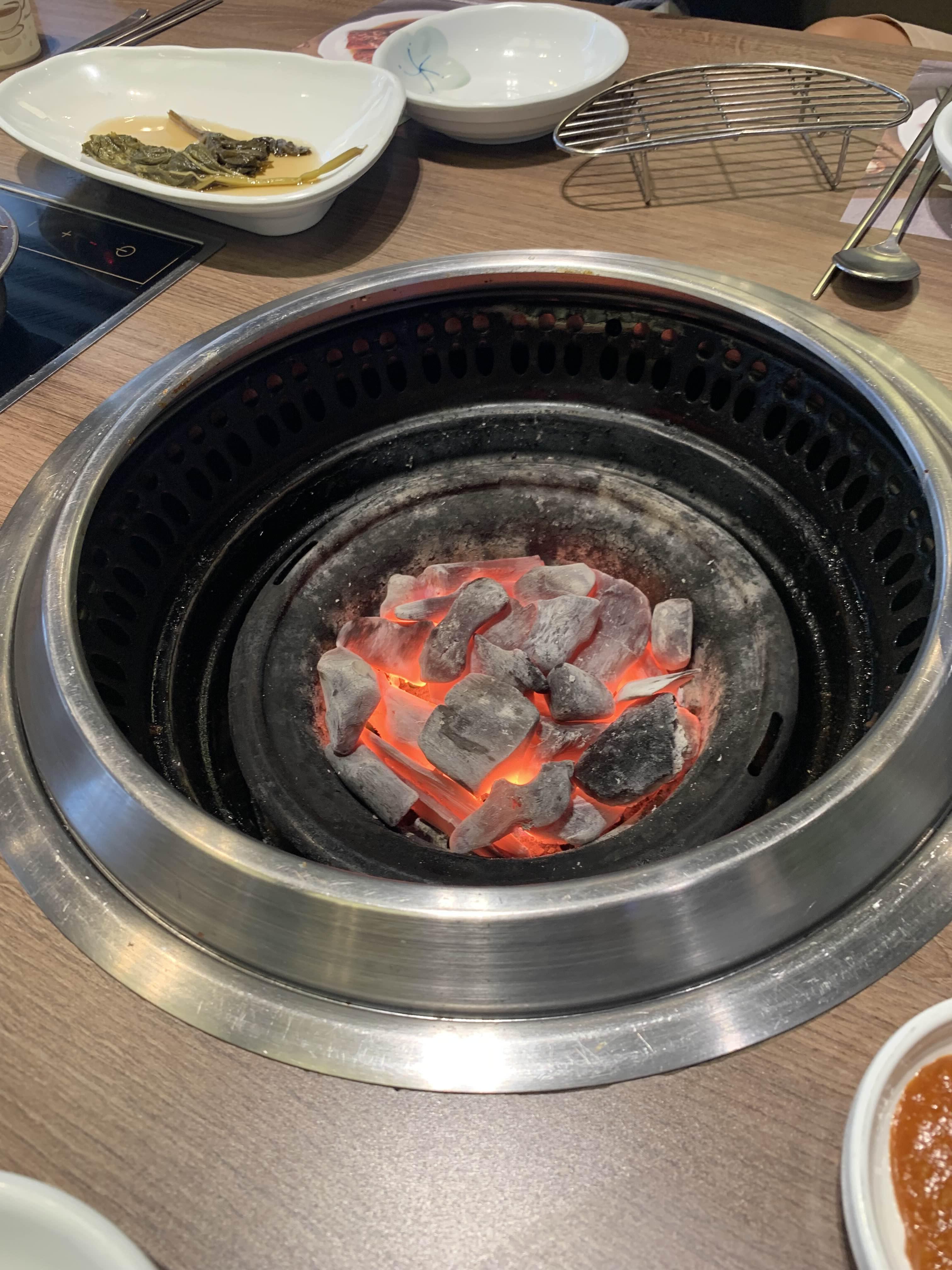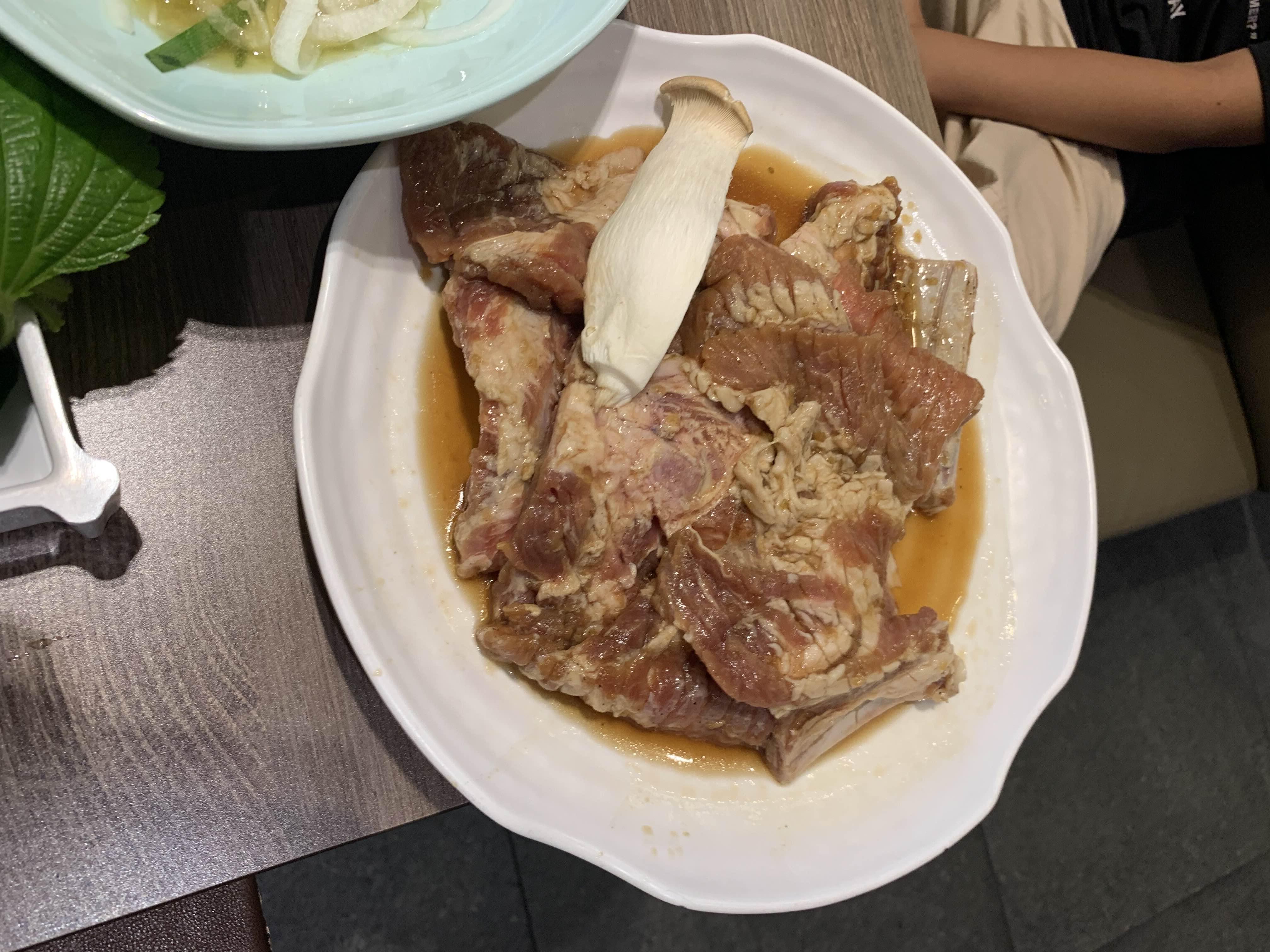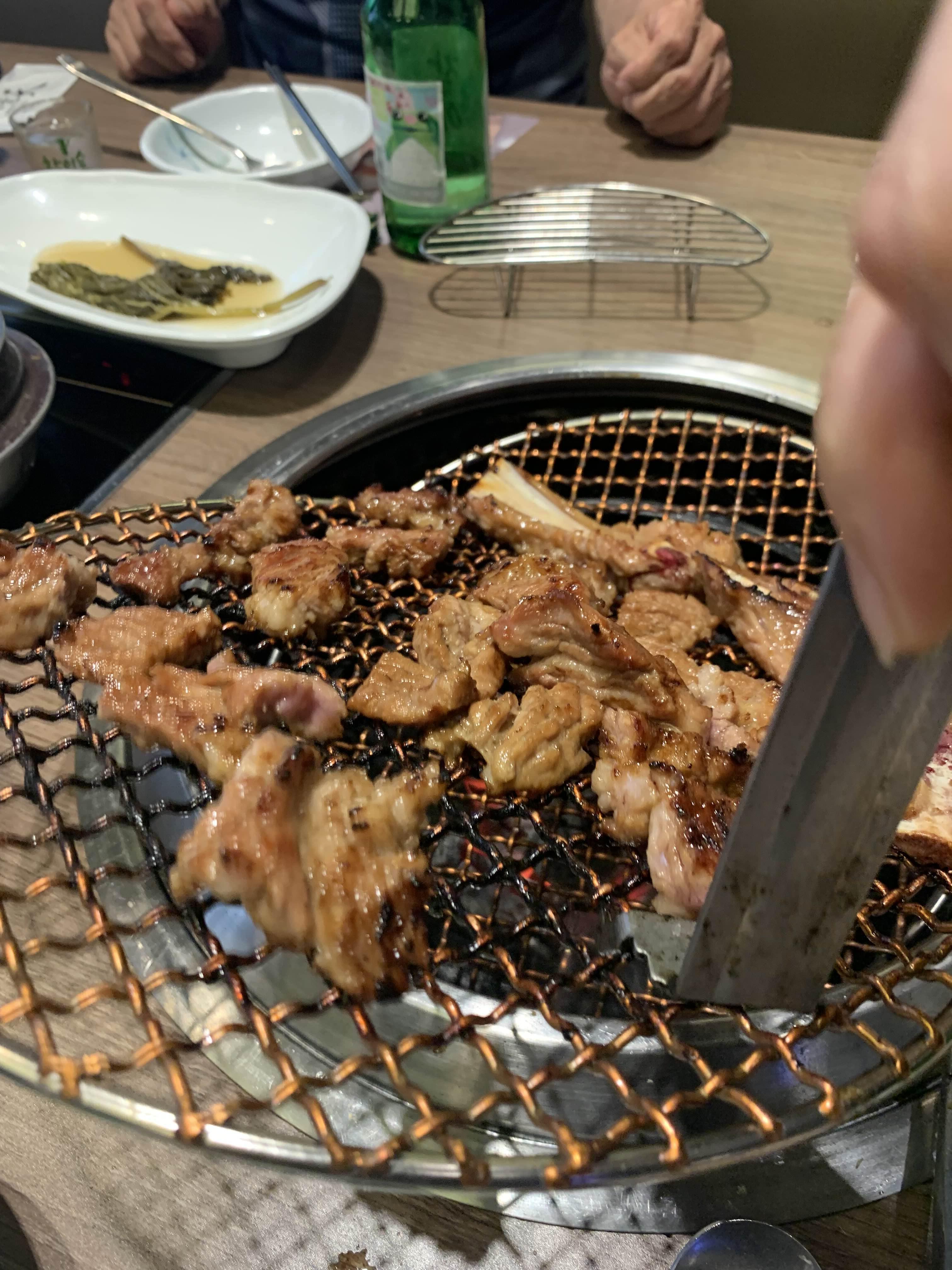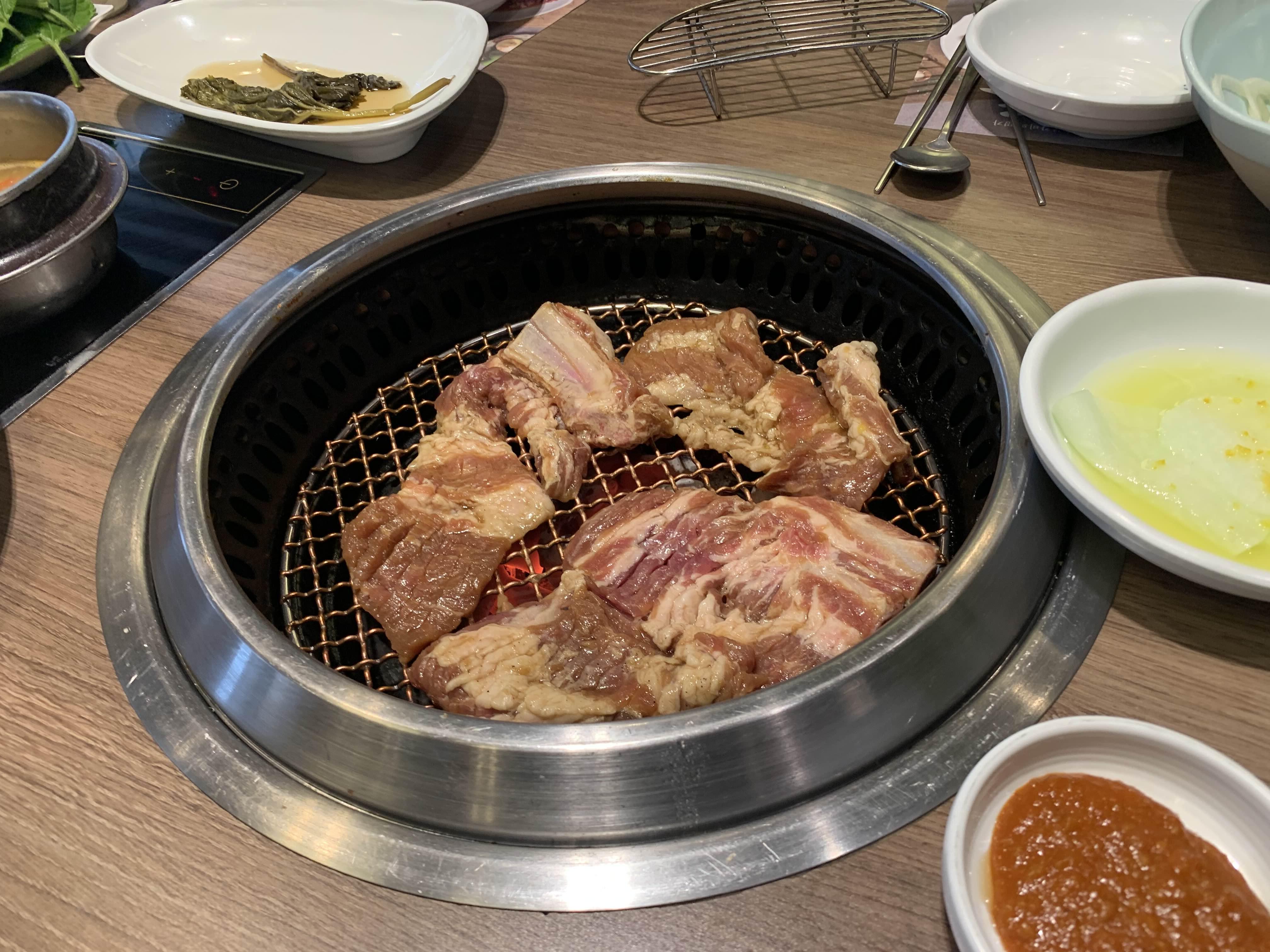 고기를 맛나게 구워주고 나면 불판이 까맣게 변하겠죠? 그래서 불판 교체!! 다 익은 고기극 고기 그릇에 올려주고, 갈비뼈는 잘 안 있는 부분이라 불판 위에서 살짝 더 구워줍니다.
