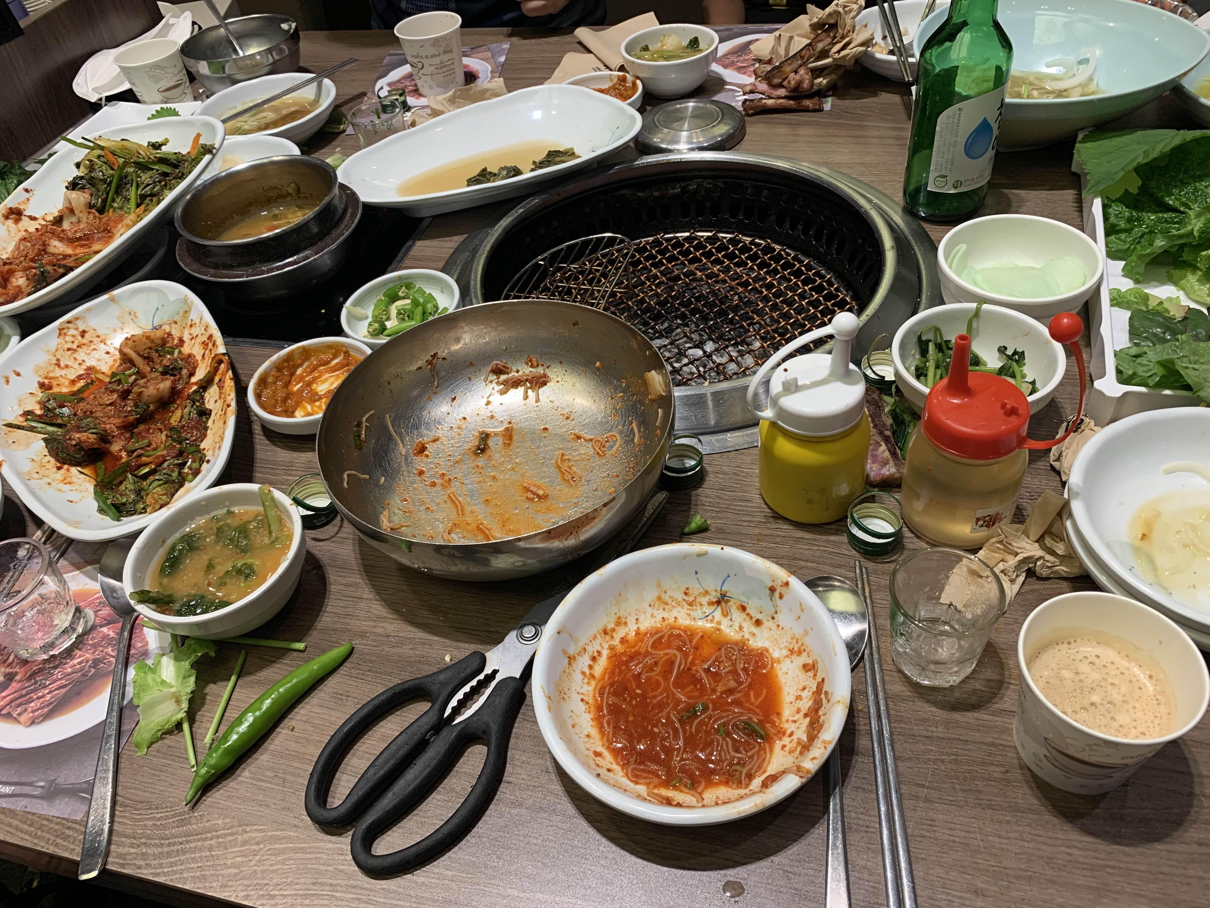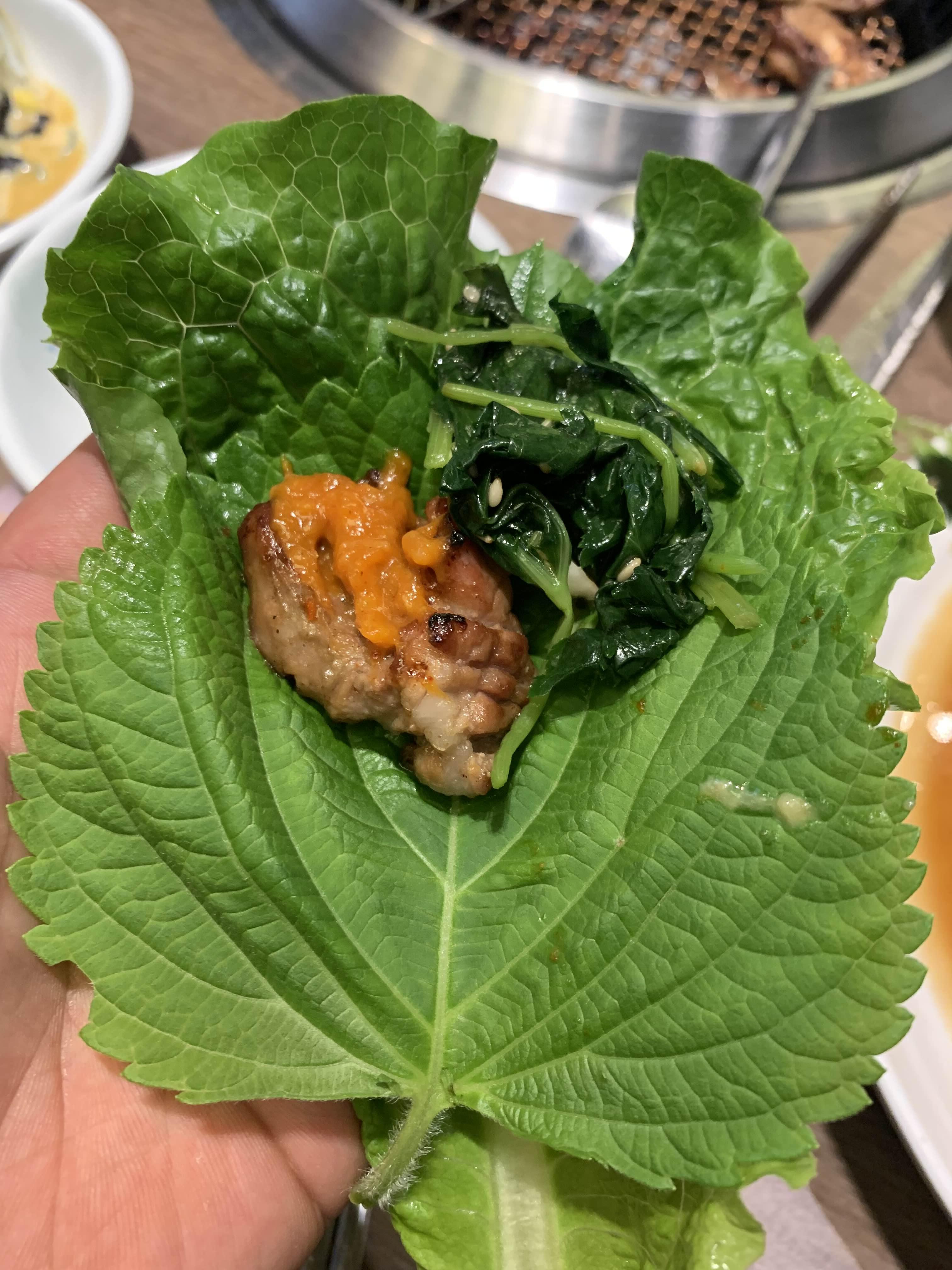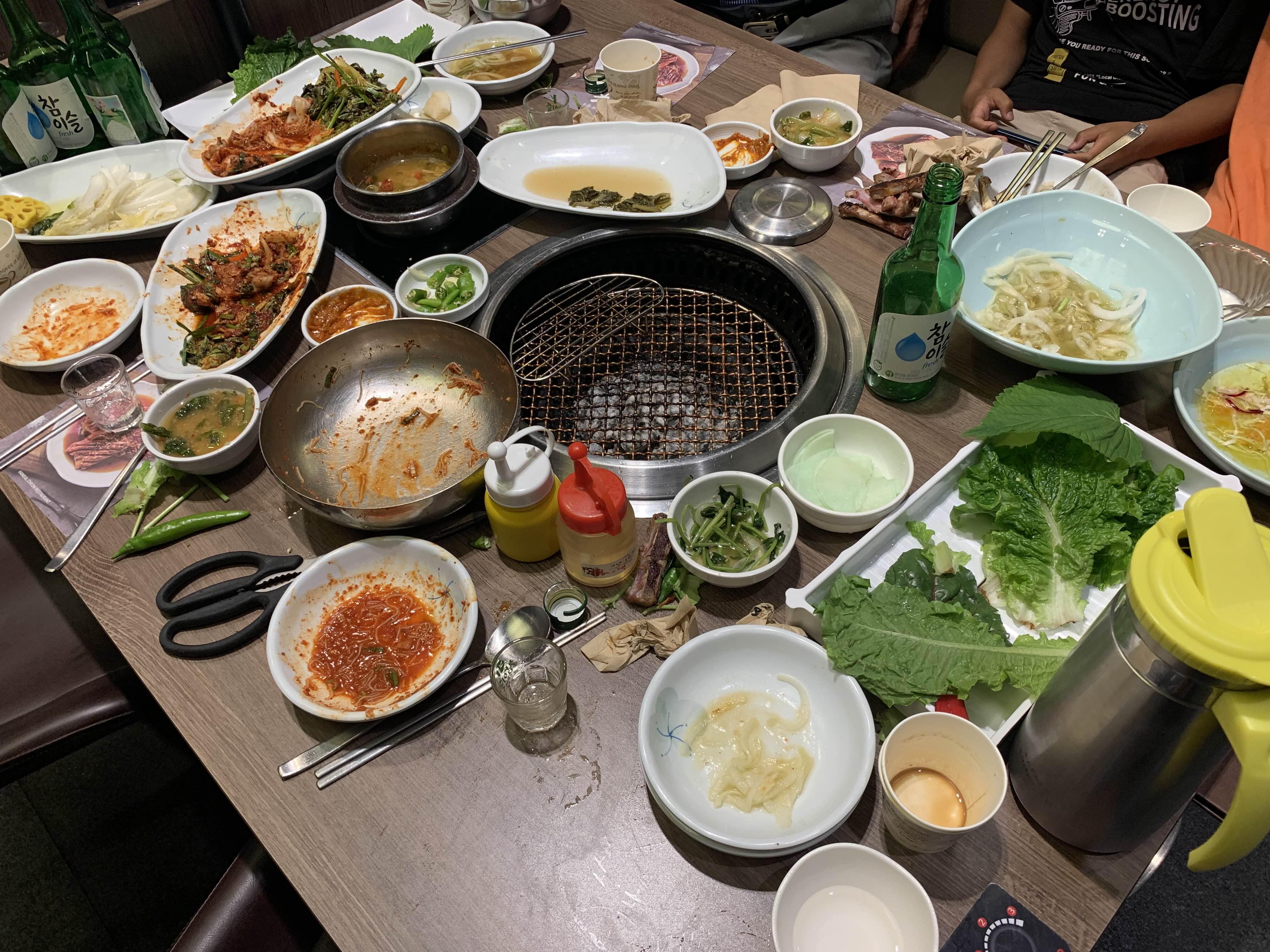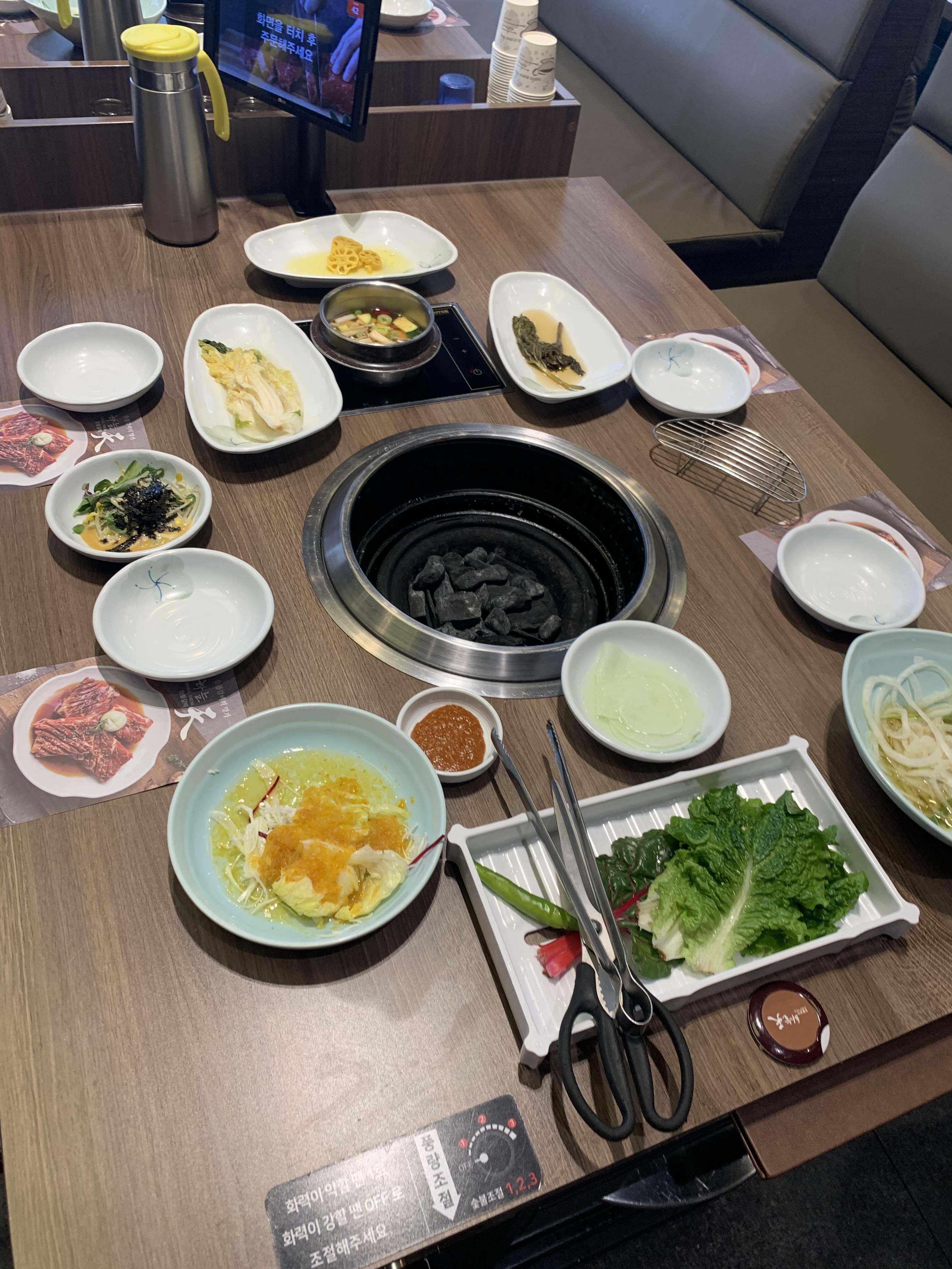 고기는 뭐니 뭐니 해도 쌈채소와 싸서 먹어야 맛나겠죠? 더욱이 고기는 밥과 함께 싸 먹는 게 최고!! 거기에 배추김치를 넣어주면 금상첨화!!! 셀프바에 마련된 김치가 꽤 맛나더군요. 셀프바에 여러 가지 반찬, 쌈채소가 준비되어서 가져가 먹어서 좋은데..... 셀프바에서 가져다가 상차림을 내가 직접 하니.... 정신이 없더군요.ㅠㅠ