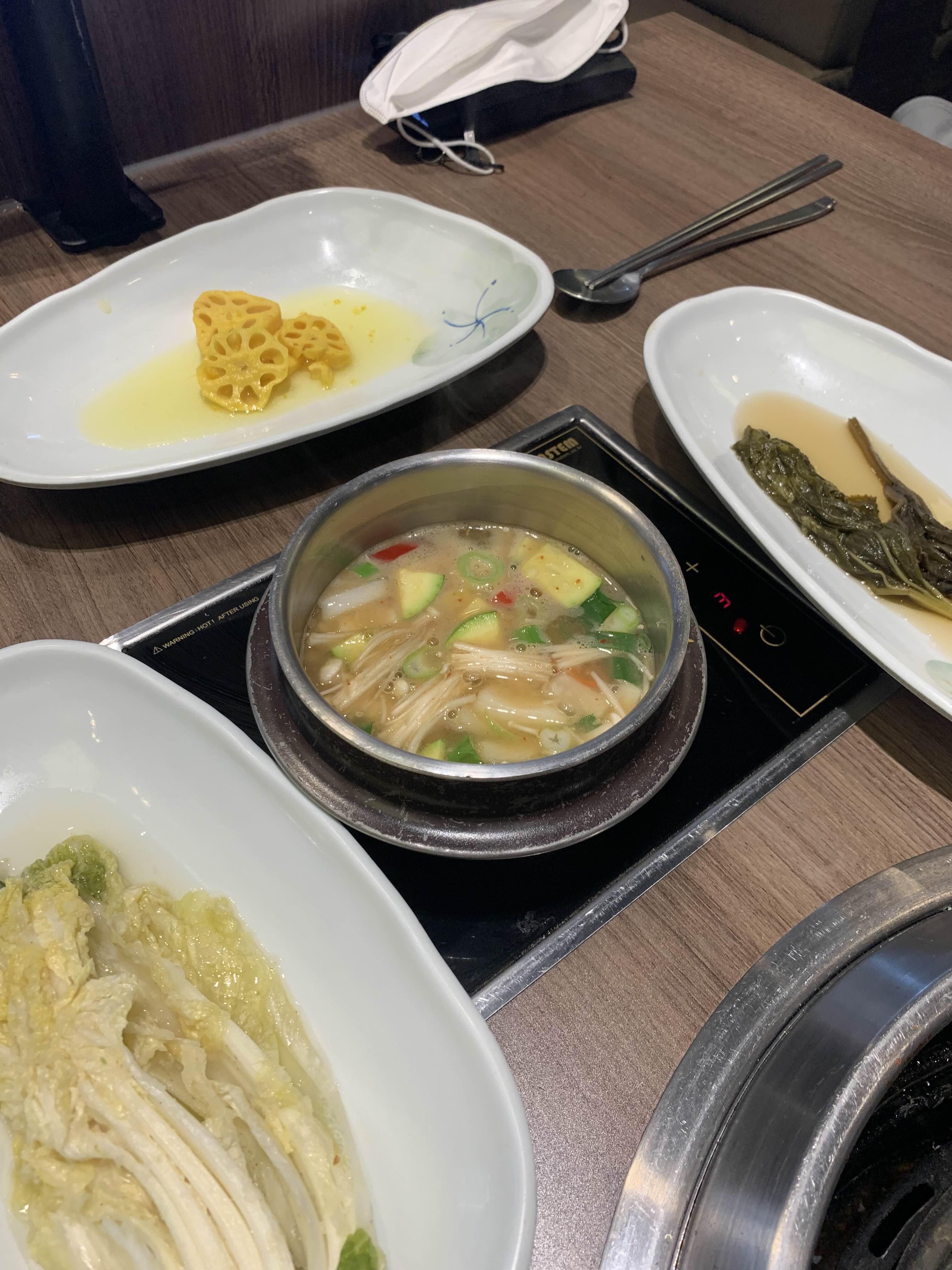 기본 세팅된 쌈채소는 많이 빈약하게 상차림 되더군요. 아무래도 셀프바에 쌈채소가 준비되다 보니.... 약간의 음식만 테이블에 준비되어 있더군요. 돼지갈비는 1인분에 16,000원으로.... 최근 물가를 고려해도 약간 비싸게 느껴지는 가격대를 형성하고 있더군요. 근데? 중량이 얼마나 되지?ㅎㅎ 기본 세팅으로 나오는 된장찌개!!
