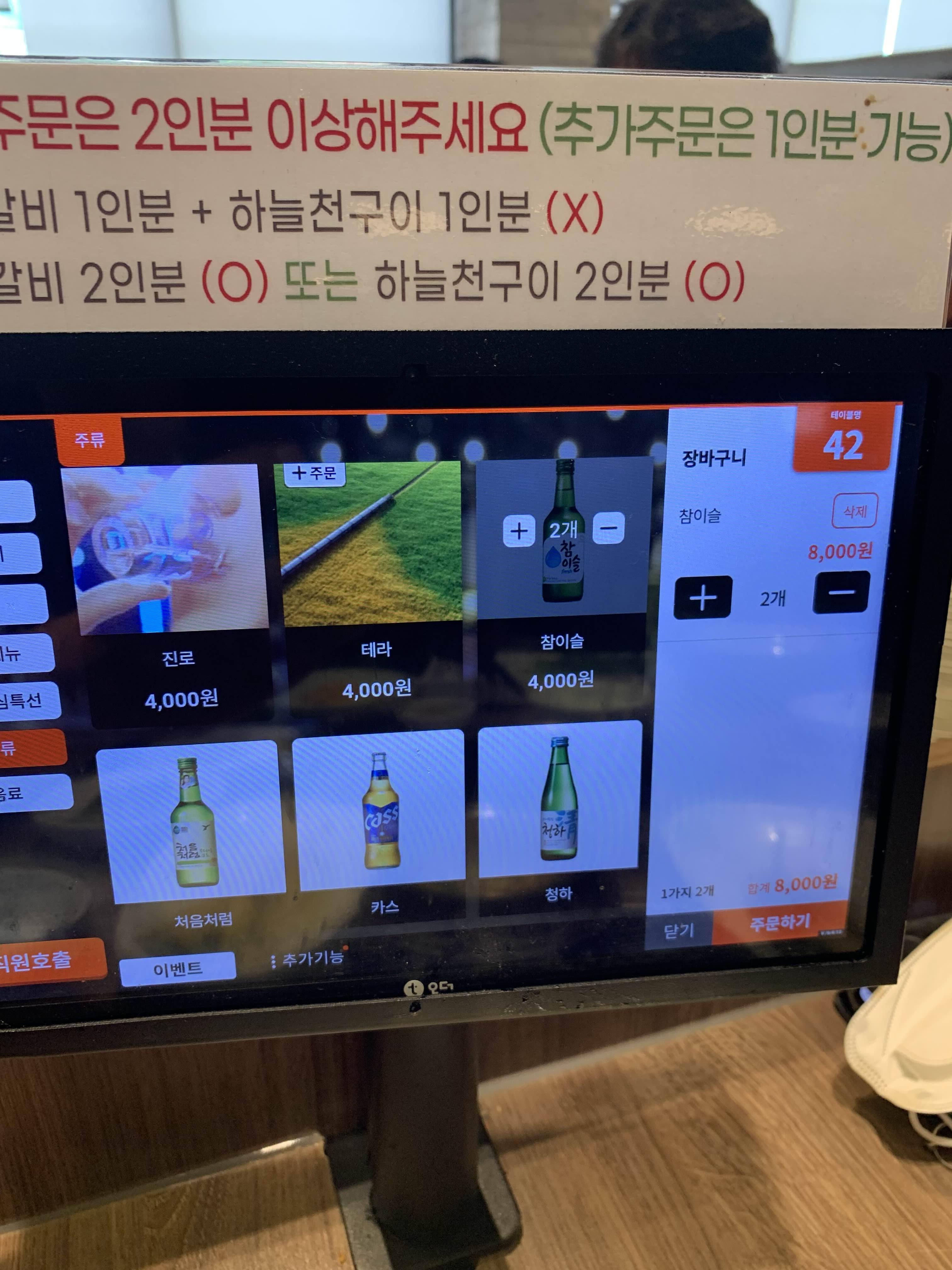 돼지갈비 전문점이라 돼지갈비를 주문하고 음료로 소주를 주문해 보았습니다. 서빙하는 로봇이 가져다주는 줄 알았는데, 고기는 서빙하시는 분들이 가져다주시더군요.