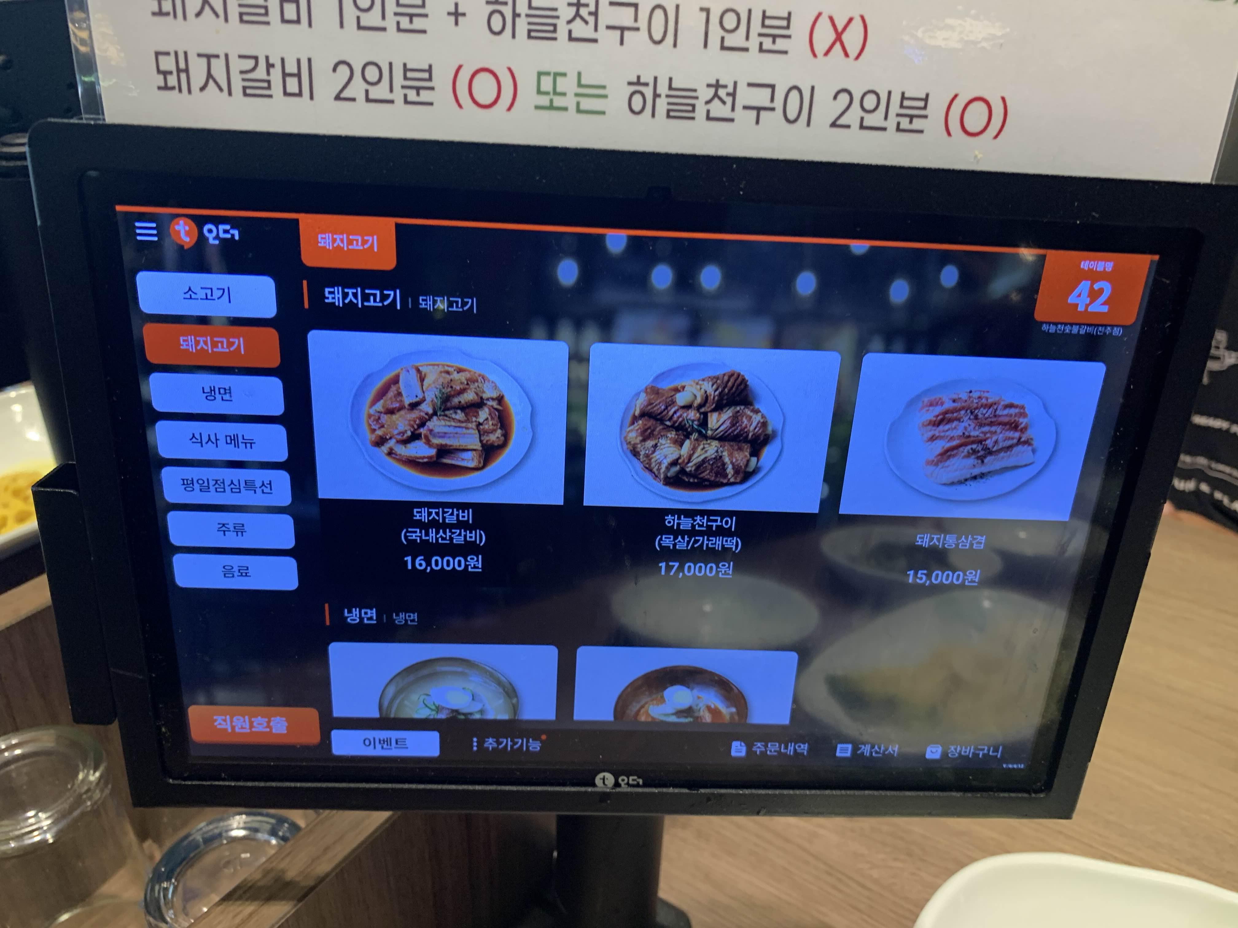 그리고 식사메뉴로 냉면, 갈비탕, 육회비빔밥이 있는데..... 돼지갈비 먹고 후식 냉면이 9,000원ㅠㅠ 갈비탕 또는 육회비빔밥이 있는데... 후식은 좀 약하다는 느낌이..ㅠㅠ 얼큰한 된장찌개나 김치찌개가 있으면 딱 좋은데..