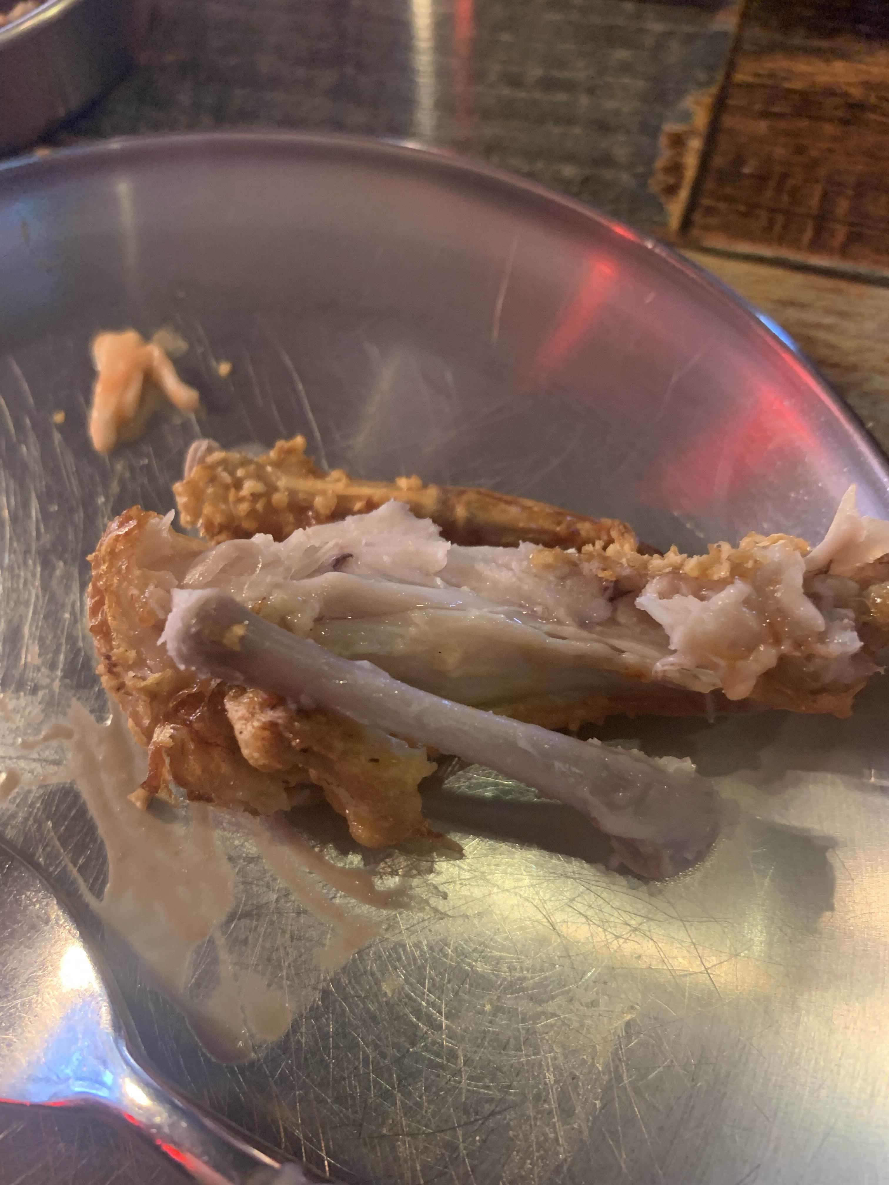 치킨이 나오고 맛보는데.... 치킨 향이 상당히 구수하더군요. 치킨 부위 중 가장 좋아하는 부위는 날개 부분!! 살코기가 가장 부드러워서~ㅎㅎ 가장 먼저 먹는 부위인데... 살코기도 부드럽고 치킨의 뼈!!! 검은색이 아닌 싱싱한 하얀 뼈가 보이더군요.