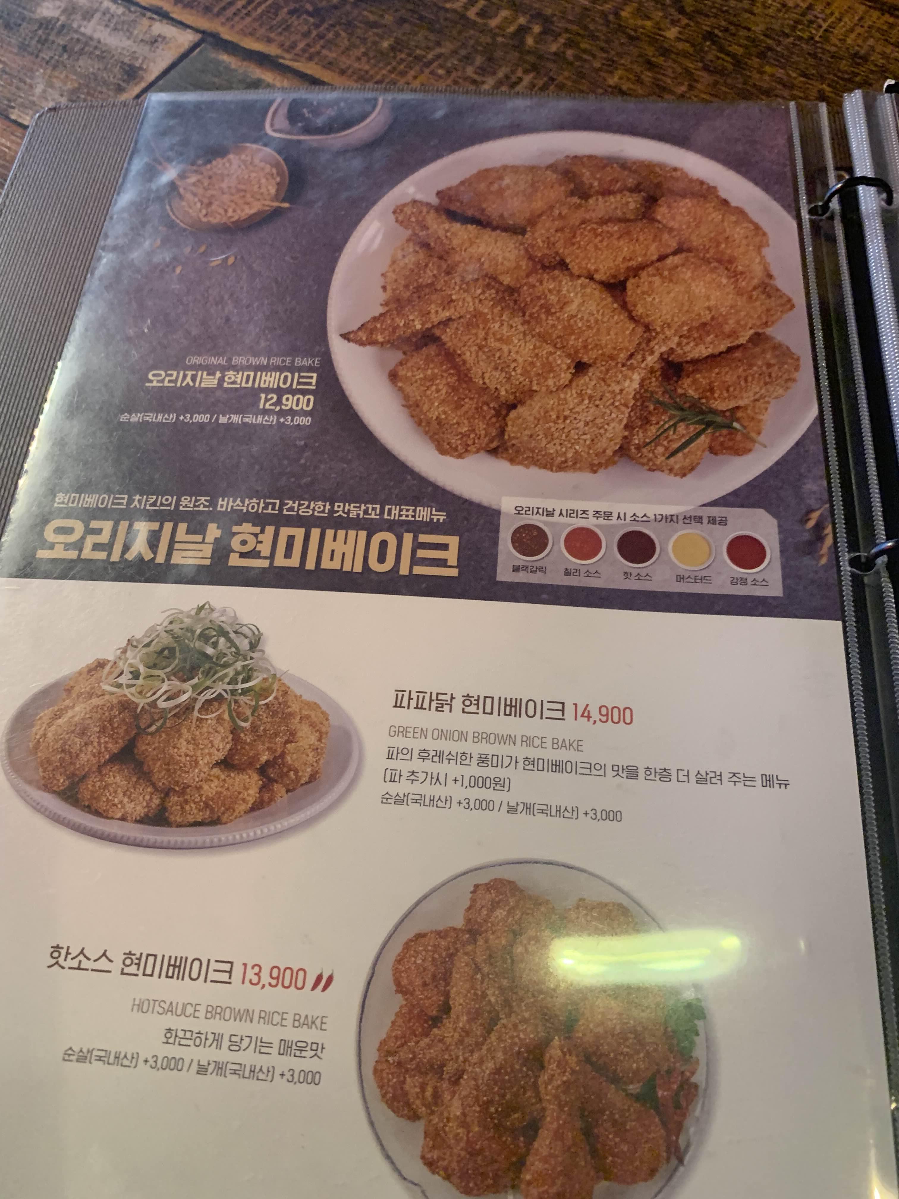 매장 앞에 안내문구와 매장 내 메뉴판의 가격이 약간 다르더군요. 매장 입구 안내문은 포장 가격이고, 홀 식사는 약간 다르게 책정되더군요. 식당에서 가장 대표 메뉴로 보이는 오리지널 현미베이크는 포장 가격이 10,900원, 홀에서 먹는 가격은 12,900원으로 2천 원 정도 차이가 나더군요. 2,000원 정도 비싸다고 해도.... 치킨 한 마리에 12,900원이면 가성비로는 좋은 가격대를 형성하고 있더군요.