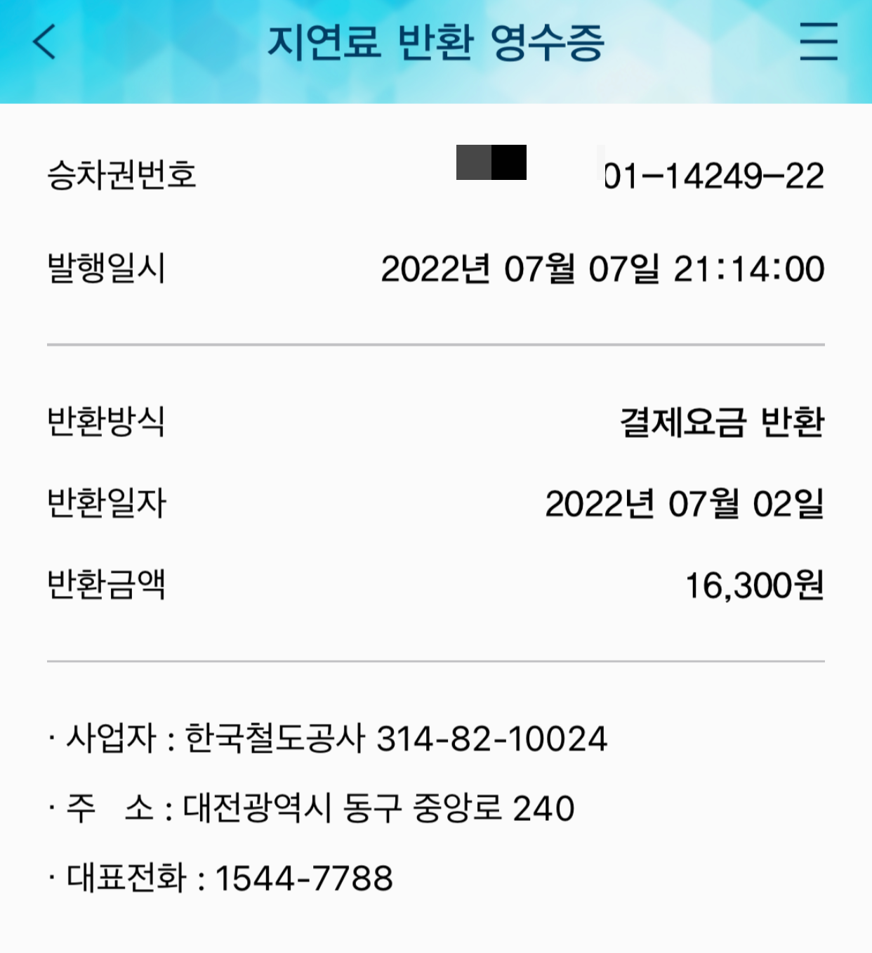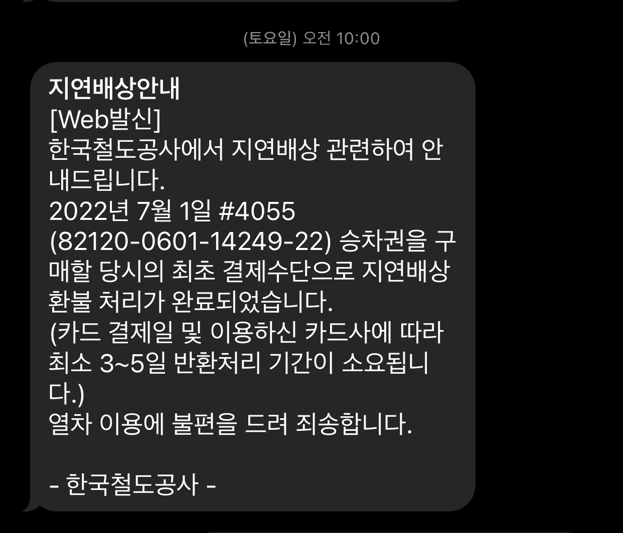 이연 할인증이 발권되어 있어야 하는데.... 이런, 할인증이 없더군요. 그리고 이상한 문자 하나 "지연 배상 안내" 지연 배상이 할인권이 아닌 환불처리가 완료되었다고 하더군요. 엥? 무슨 환불처리, 내 승차권은 그대로인데? 승차권을 확인해보니 50% 환불이 되었다는 메시지가 보이더군요.