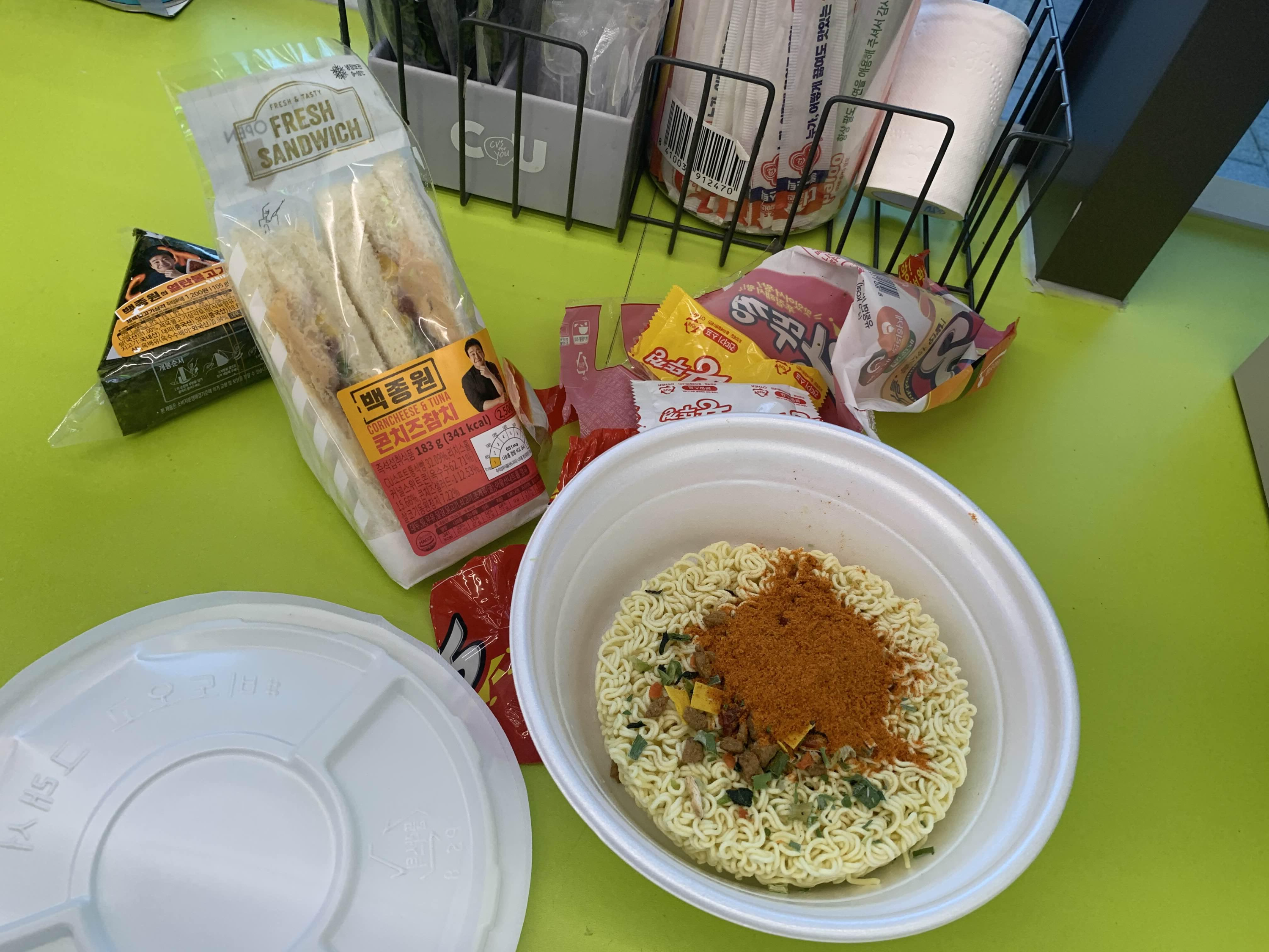 삼각김밥에 라면이나 하나 먹을 겸 편의점에 방문했는데... 매장에 온수가 없어 라면을 드실 수 없다는 안내문이 보이더군요. ㅠㅠ 허걱, 그래서 다른 음식 아라도 먹으려 했으나.... 컵라면이 당기는 날에는 라면을 먹어줘야겠죠! 그래서 역사 밖으로 향했습니다.