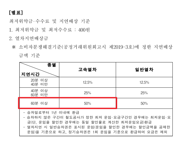 환불 관련 자료를 찾아보니 "여객운송약관"이 있고, 그 약관의 별표에 지연 배상 기준이 명시되어 있더군요. 고속열차는 60분 이상 지연 시 50% 환불을 기준을 정하였네요.