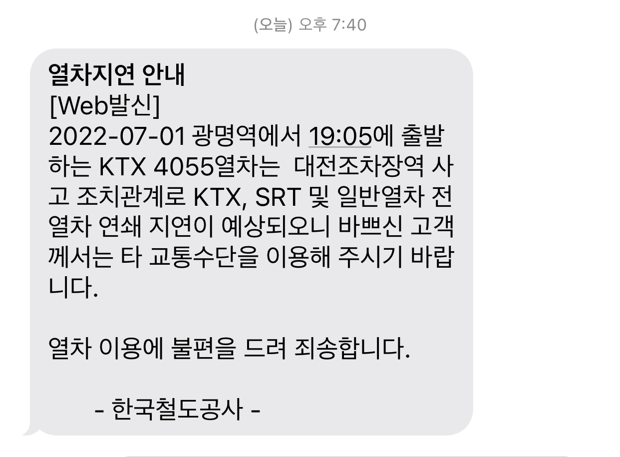 열차는 대략 50분 정도 지연되어 도착하더군요. 열차를 기다리며 열차 지연 안내문이 발송되었는데.... 열차가 연쇄 지연이 예상되오니 타 교통수단을 이용!!! 허걱, 광명에서 타 교통수단을 이용하기란 쉽지가 않겠죠.