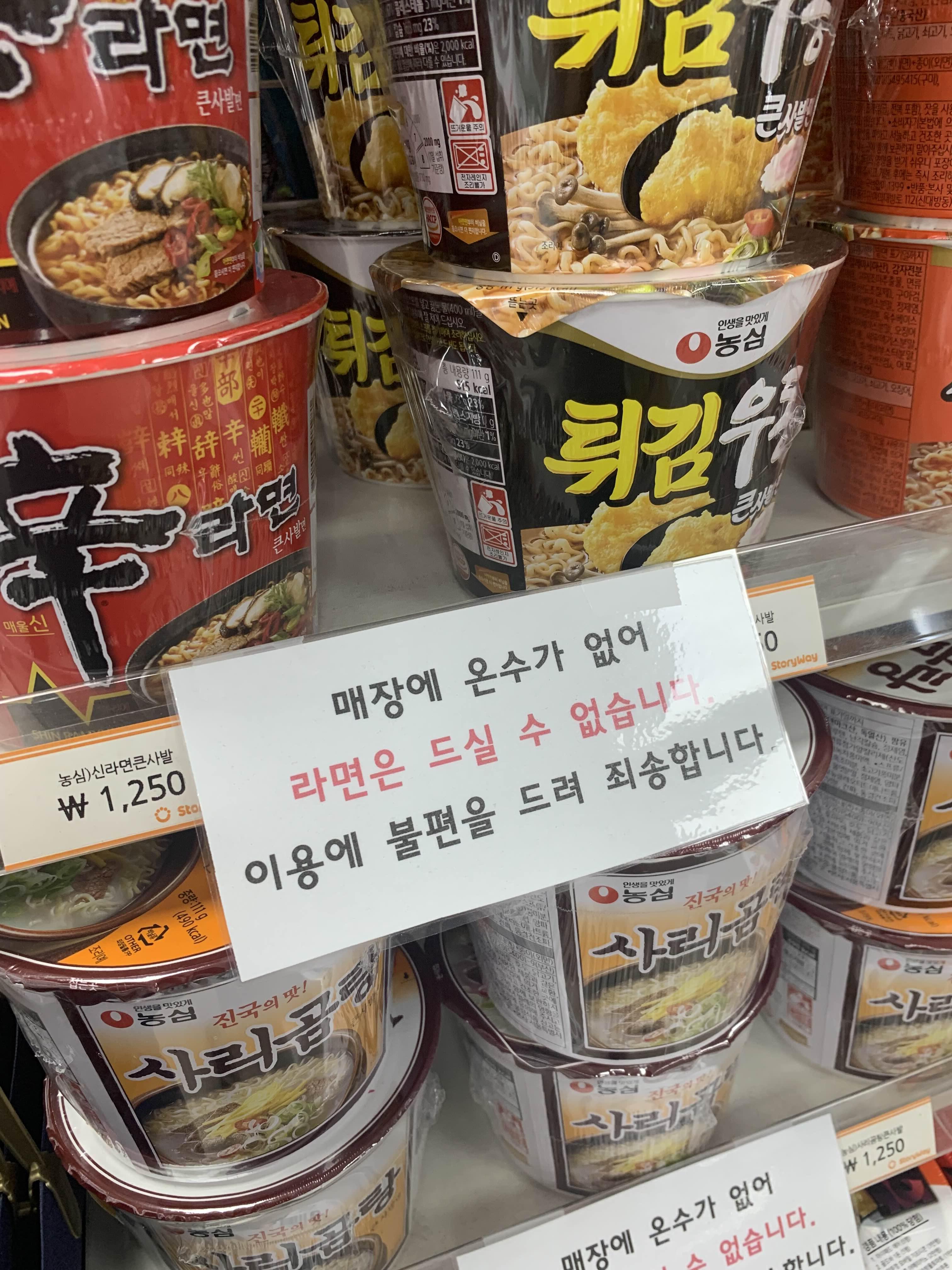 삼각김밥에 라면이나 하나 먹을 겸 편의점에 방문했는데... 매장에 온수가 없어 라면을 드실 수 없다는 안내문이 보이더군요. ㅠㅠ 허걱, 그래서 다른 음식 아라도 먹으려 했으나.... 컵라면이 당기는 날에는 라면을 먹어줘야겠죠! 그래서 역사 밖으로 향했습니다.