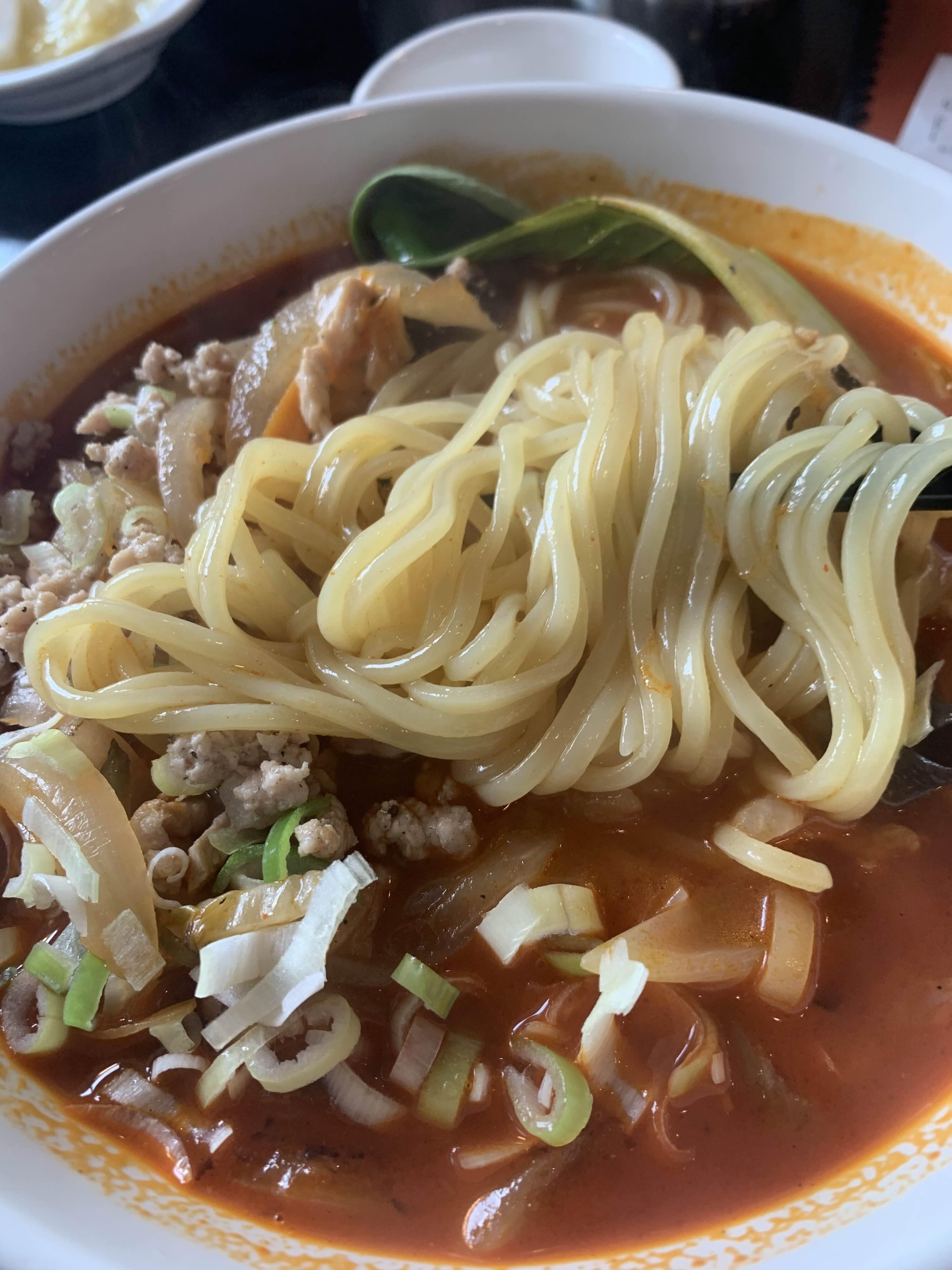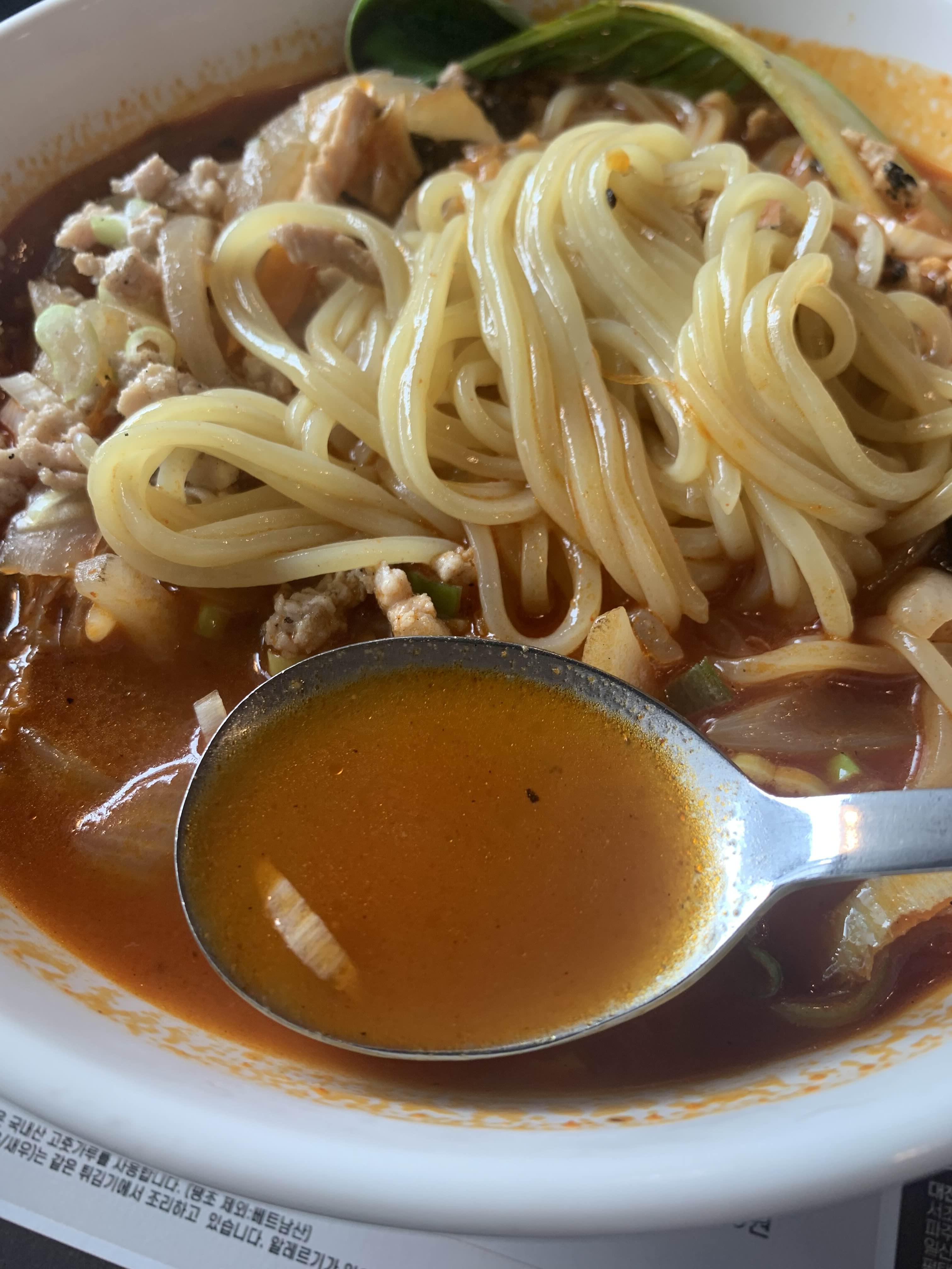 짬뽕의 면발은 얇은 면발로 담백한 국물과 잘 어울리더군요. 국물이 불맛도 나고, 구수한 기름 향? 이 나면서 담백한 맛이 올라오더군요. 건더기로는 해물이 없고, 간고 기와 짬뽕 안쪽에 기다란 고기가 있더군요.