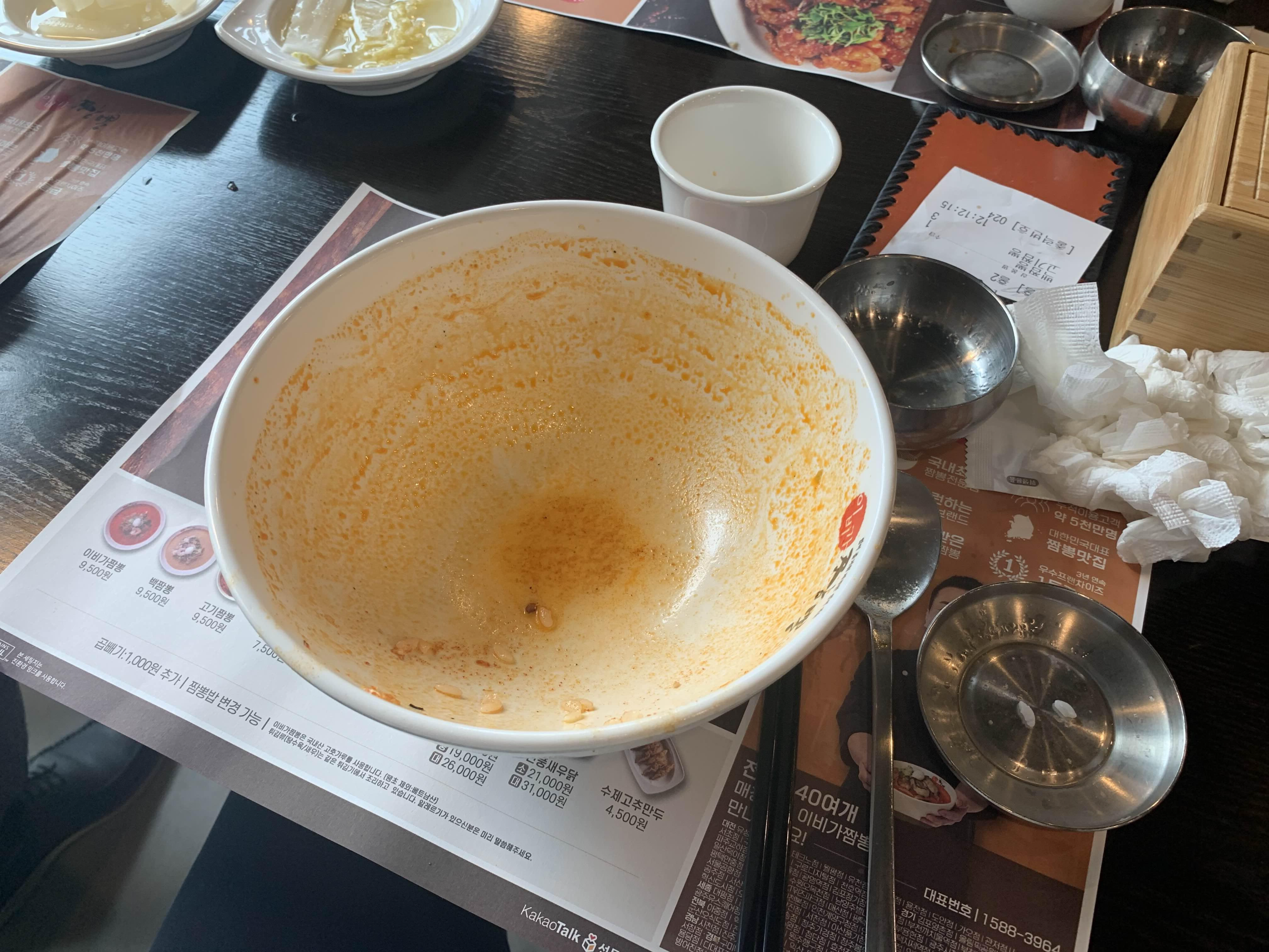 어느 순간 짬뽕 바닥이 드러났습니다. 면발, 국물, 공깃밥까지 완벽한 한 끼를 먹었습니다. 다만, 가격이 좀 비싸다는 게... 최근 물가가 많이 올라서.ㅠㅠㅠ 점심식사 가격이 평균 8,537원이니.... 너무 많이 오르긴 했네요. 7,000원 메뉴만 만나도 엄청 저렴하게 느낄 정도니...