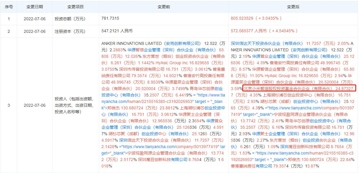 Weibo 뉴스에 따르면 Tianyancha 데이터에 따르면 7월 6일 Huayuan Zhixin Semiconductor(Shenzhen) Co., Ltd. 는 새로운 주주인 Beijing Xiaomi Zhizao Equity Investment Fund Partnership(Limited Partnership)을 추가하여 산업 및 상업 변화를 겪었습니다.