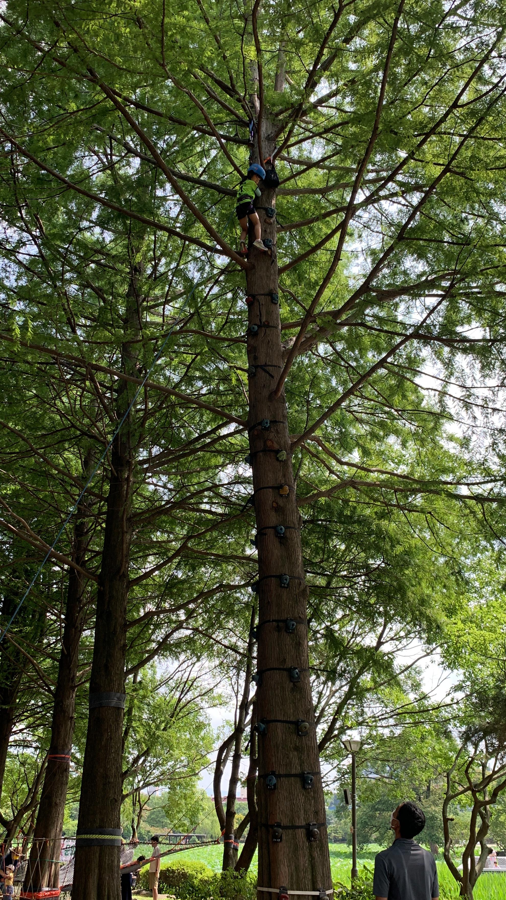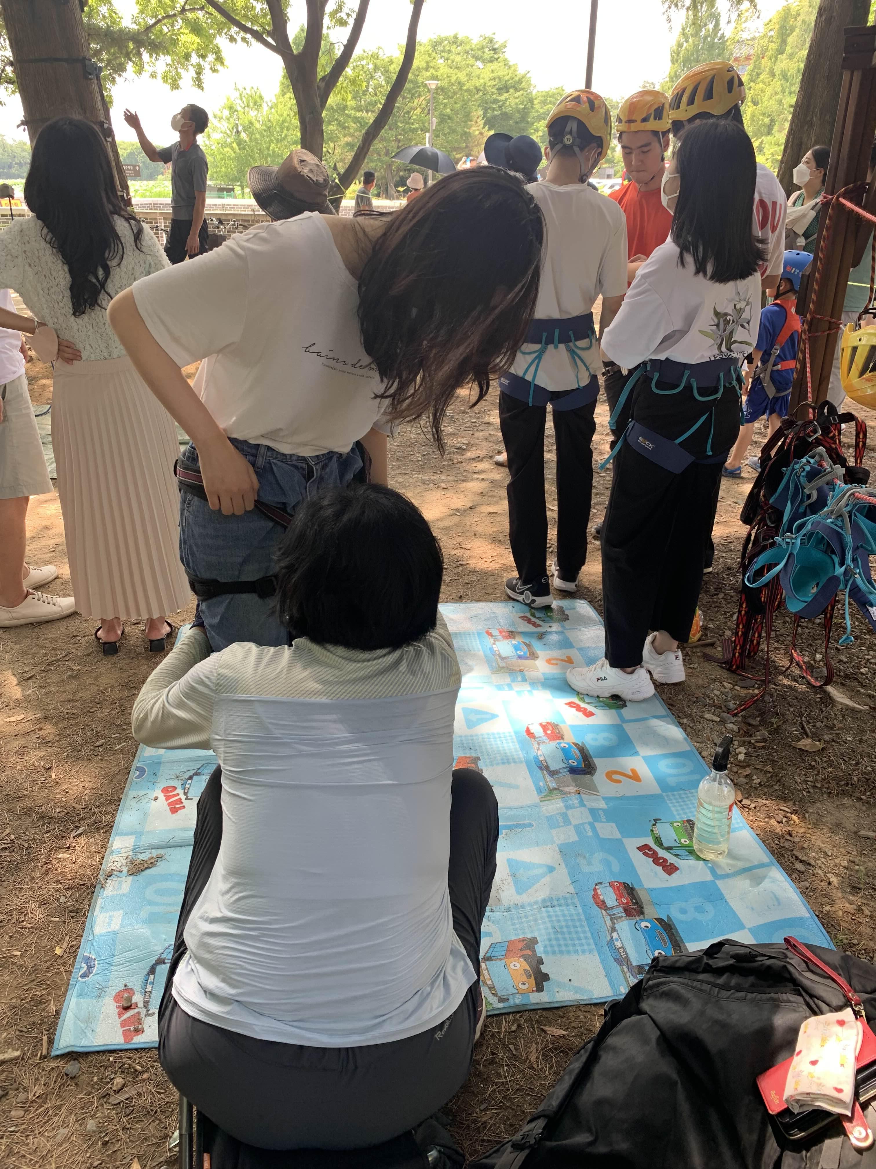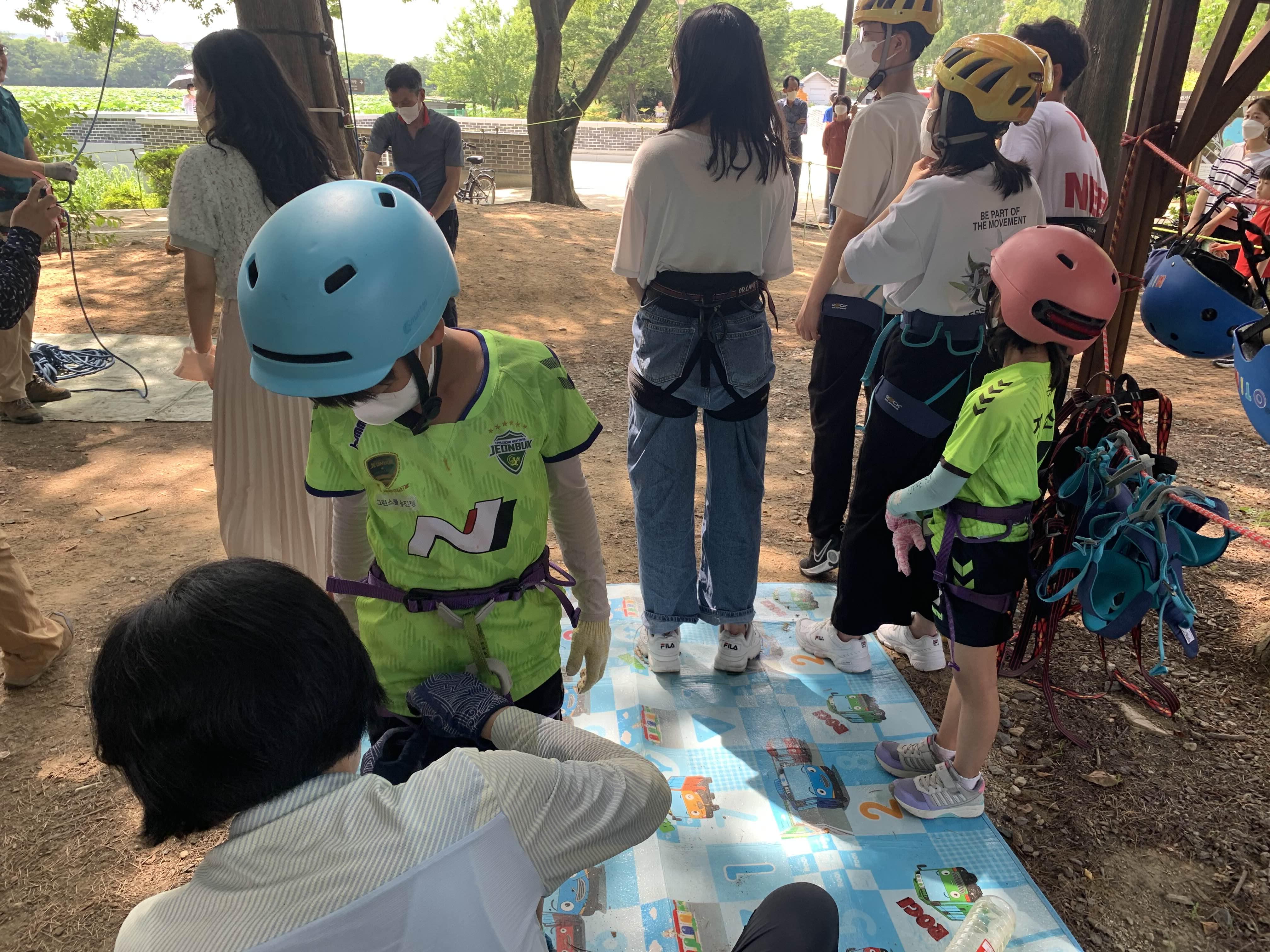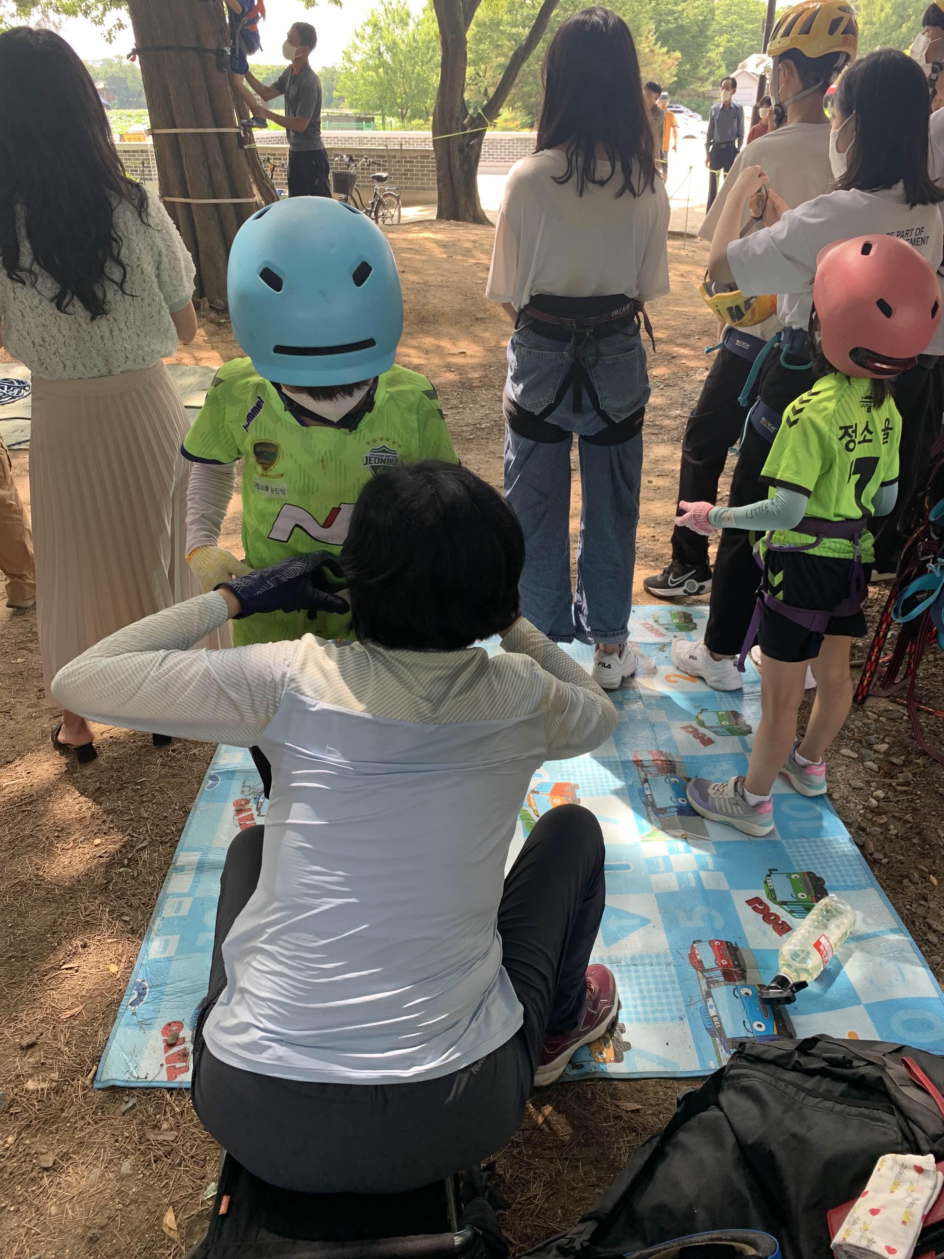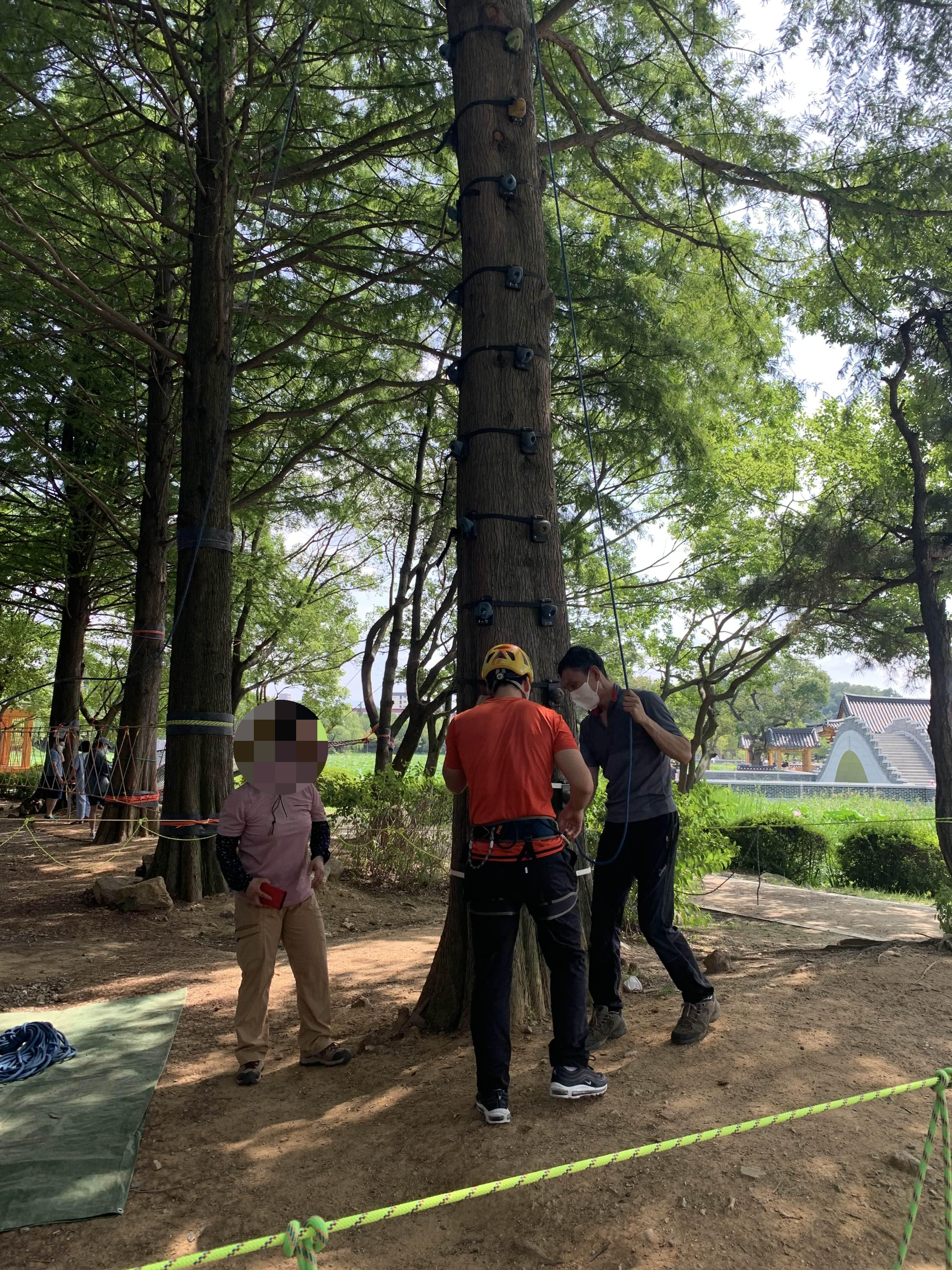 아이들 앞에는 대학생쯤 보이는 성인이 체험을 준비하고 있었다. 성인도 나무를 끝가지 올라가는데.... 다리가 후들거리는 모습이 보였다, 무섭기는 무서운가 보다.