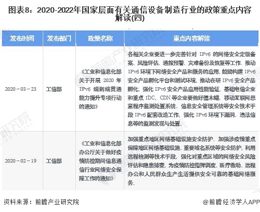 최근 몇 년 동안 국무원, 국가 발전 및 개혁위원회, 산업 정보 기술부 및 기타 부서는 5G 네트워크 건설, 터미널 IPv6 업그레이드 및 변환을 포함하여 통신 장비 제조 산업을 지원하고 규제하는 발전 정책을 연속적으로 발표했습니다. 2020년 6월부터 2022년 6월까지 "이중 기가비트" 네트워크 인프라 및 산업 인터넷 건설 및 기타 콘텐츠에 대해 우리나라 통신 장비 제조 산업에 대한 관련 정책 개발 계획을 요약하면 다음과 같습니다.