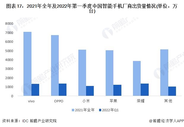 2022년 1분기 OPPO, Honor, vivo, Apple 및 Xiaomi의 시장 점유율은 각각 18.5%, 18.2%, 17.9%, 16.7% 및 14.9%였으며 기타 제조업체의 총 시장 점유율은 13.7%였습니다.
