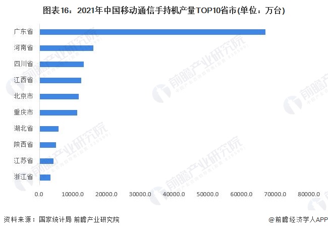 경제가 발달한 지역은 인구 기반이 상대적으로 많기 때문에 이동통신 장비에 대한 수요도 상대적으로 크며, 현재 우리나라의 이동통신 단말기 생산은 주로 동남부의 경제발전 지역에 집중되어 있습니다. 2021년 한 해 동안 광둥 성 이동통신 단말기 생산량은 전국 최대 규모로 6억 6965만 4000대로 전국 통신 단말기 총생산량의 약 40.30%를 차지한다. 허난성, 쓰촨 성, 베이징, 장시성, 충칭시, 후베이성, 산시성, 장쑤성, 저장성이 포함된다. 그러나 이들 도시의 통신 단말기 생산량이 더 분명함을 알 수 있는데, 예를 들어 10위인 난징의 통신 단말기 생산량은 3214만 5000대로 광둥 성과 거의 21배 차이가 난다.
