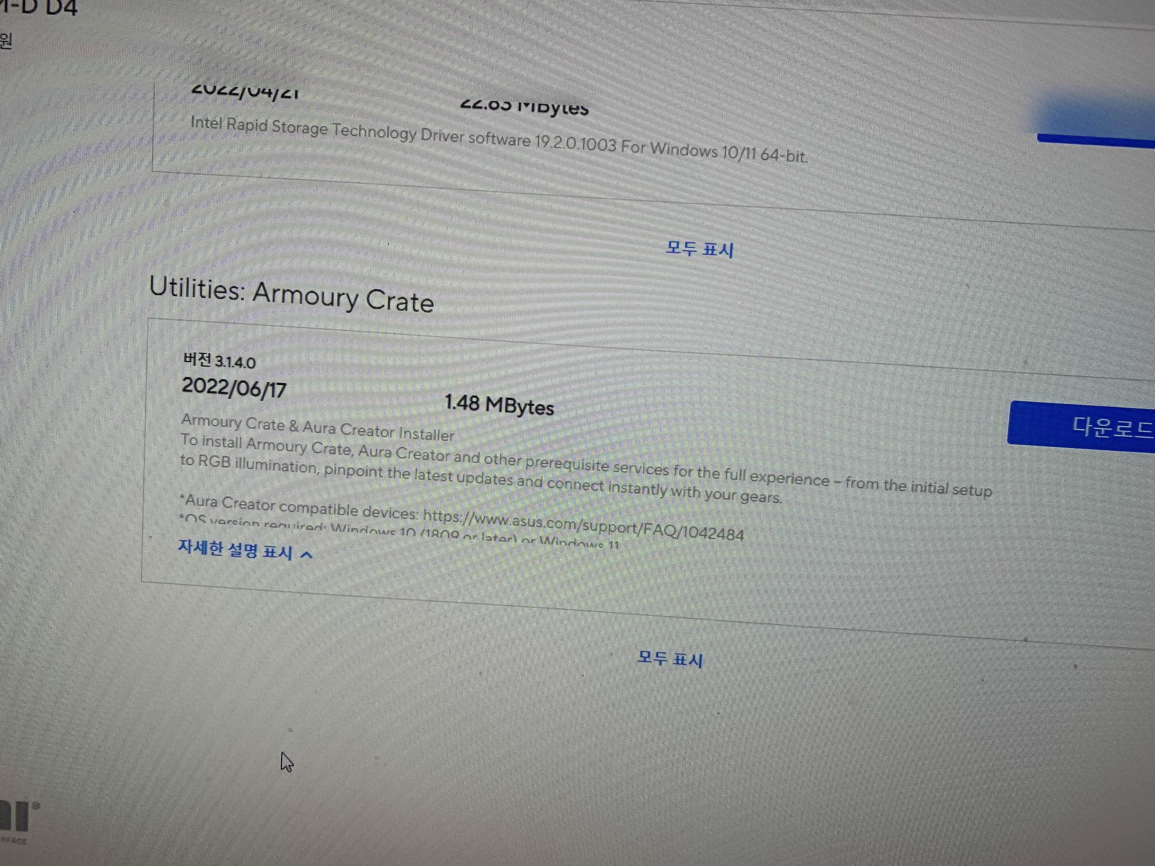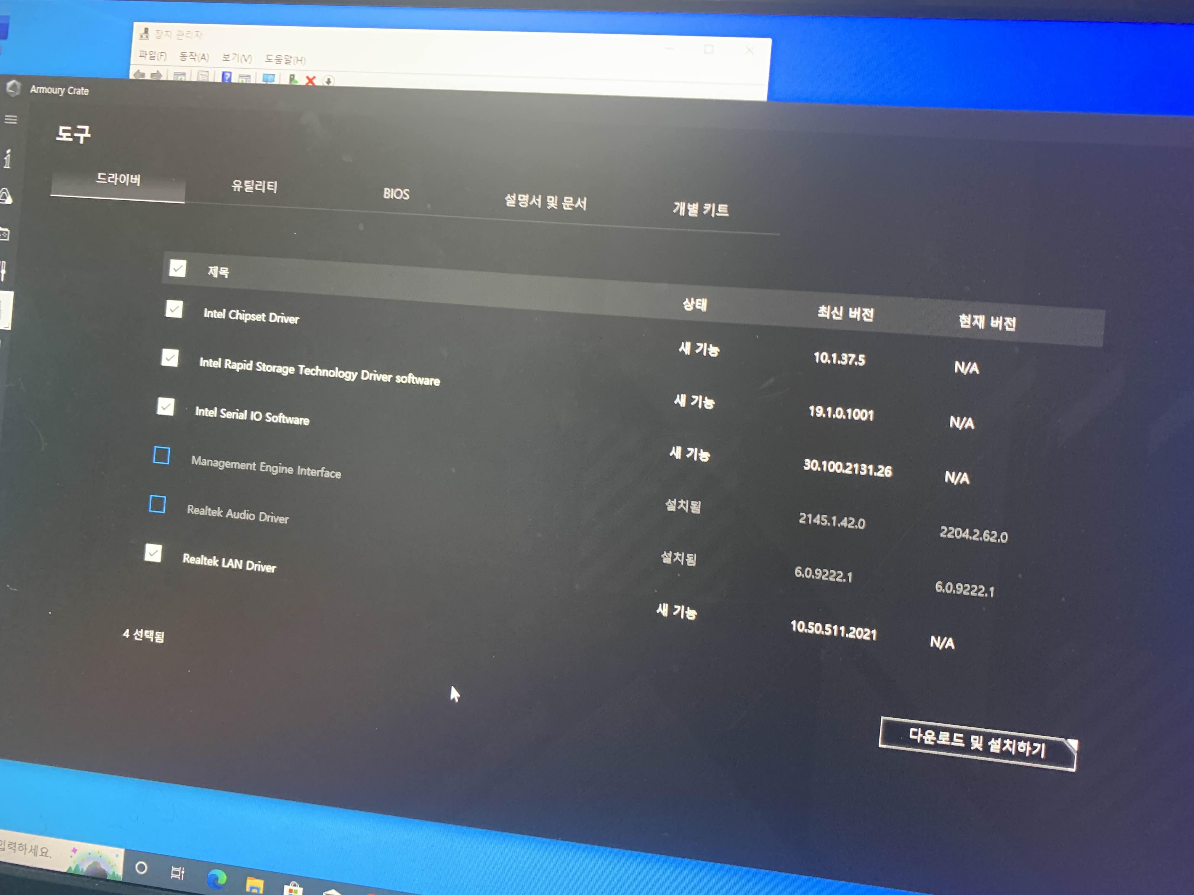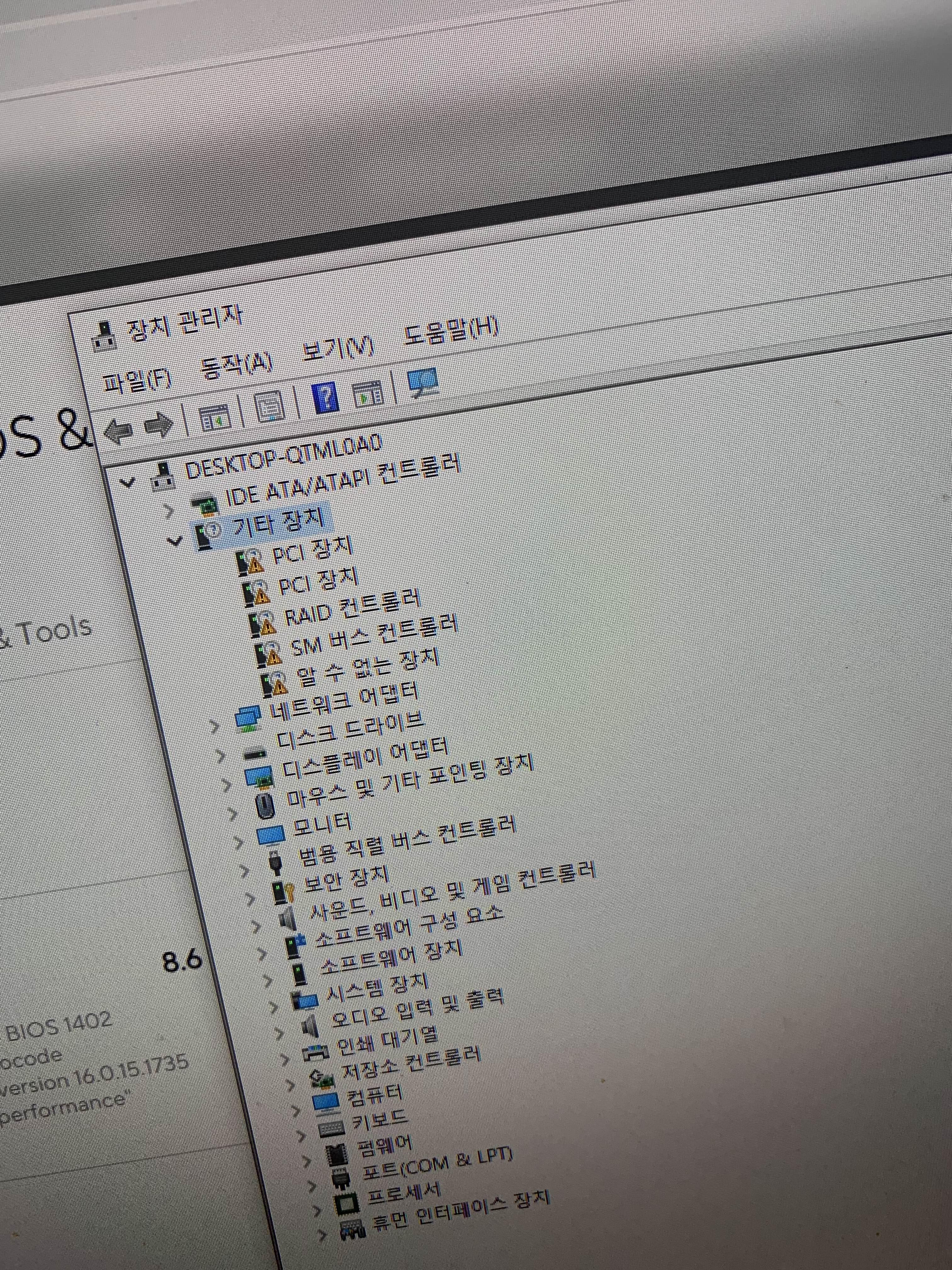 윈도 설치도 USB 메모리를 이용하여 설치 완료!!! 그 이후 제어판에서 장치 관리자에 들어가 봅니다. 장치 관리자에 몇 가지 항목에서 느낌표 오류 메시지나 보이더군요. PCI장치, RAID 컨트롤러, SM버스 컨트롤러는.... 대부분 메인보드의 소켓의 장치라.... 메인보드 제품에 들어있는 CD용 바이오스 업데이트를 설치해주면 해결됩니다. 그러나, 최근 컴퓨터에는 CD드라이버가 없죠.ㅋㅋㅋ 인터넷을 통해서 다운로드!!!