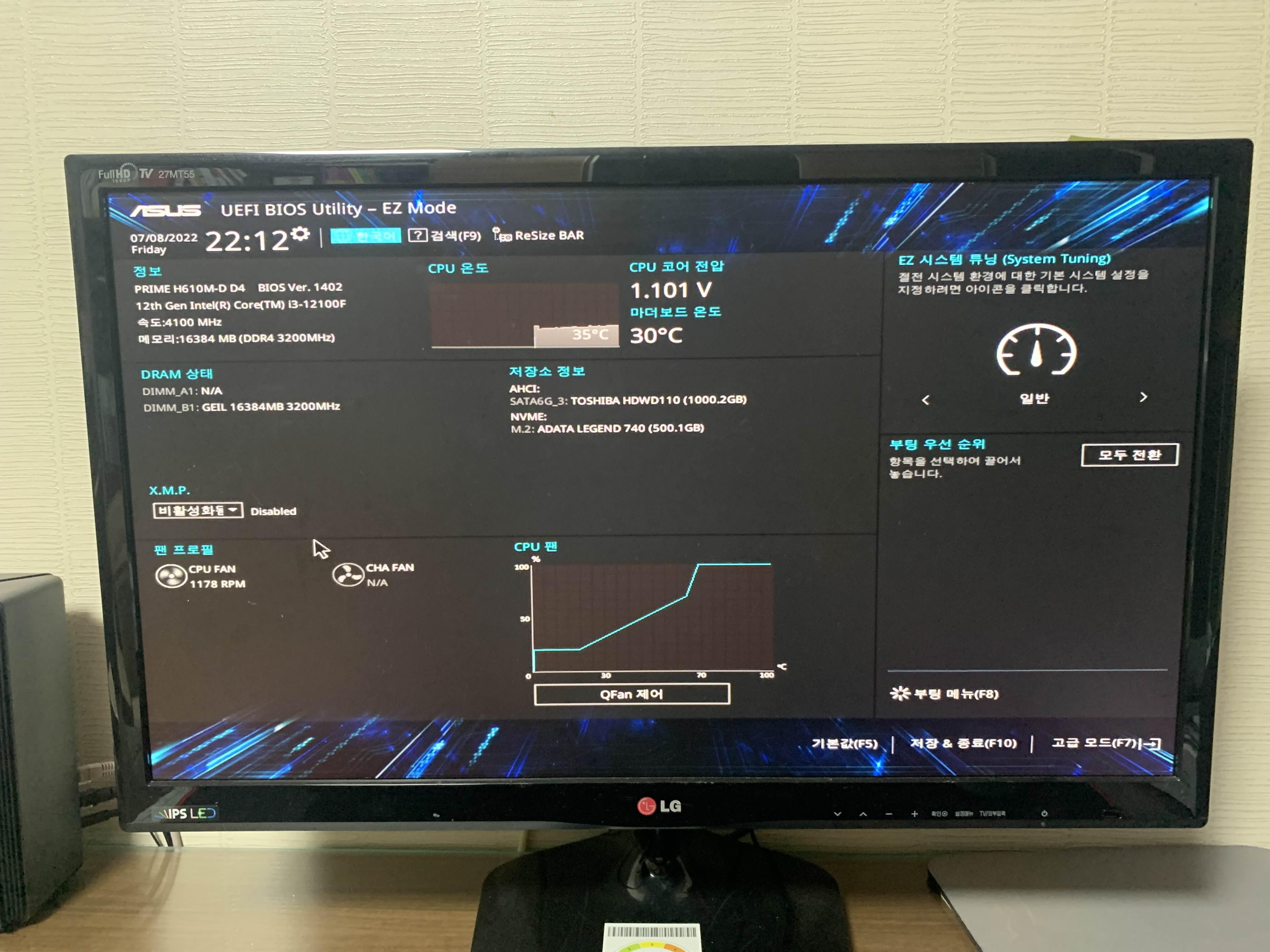 ASUS 메인보드는 그런 버튼 없이 운영체제가 설치되지 않은 상태에서 컴퓨터를 부팅하니.... 바이오스 유틸리티 모드로 들어가더군요. 한참을 부팅 순서 변경을 찾아보아도.... 안 보여서, 설치용 OS USB 메모리 카드를 꼽아주고 재부팅하니... 윈도 설치 화면으로 넘어가더군요.ㅎㅎ