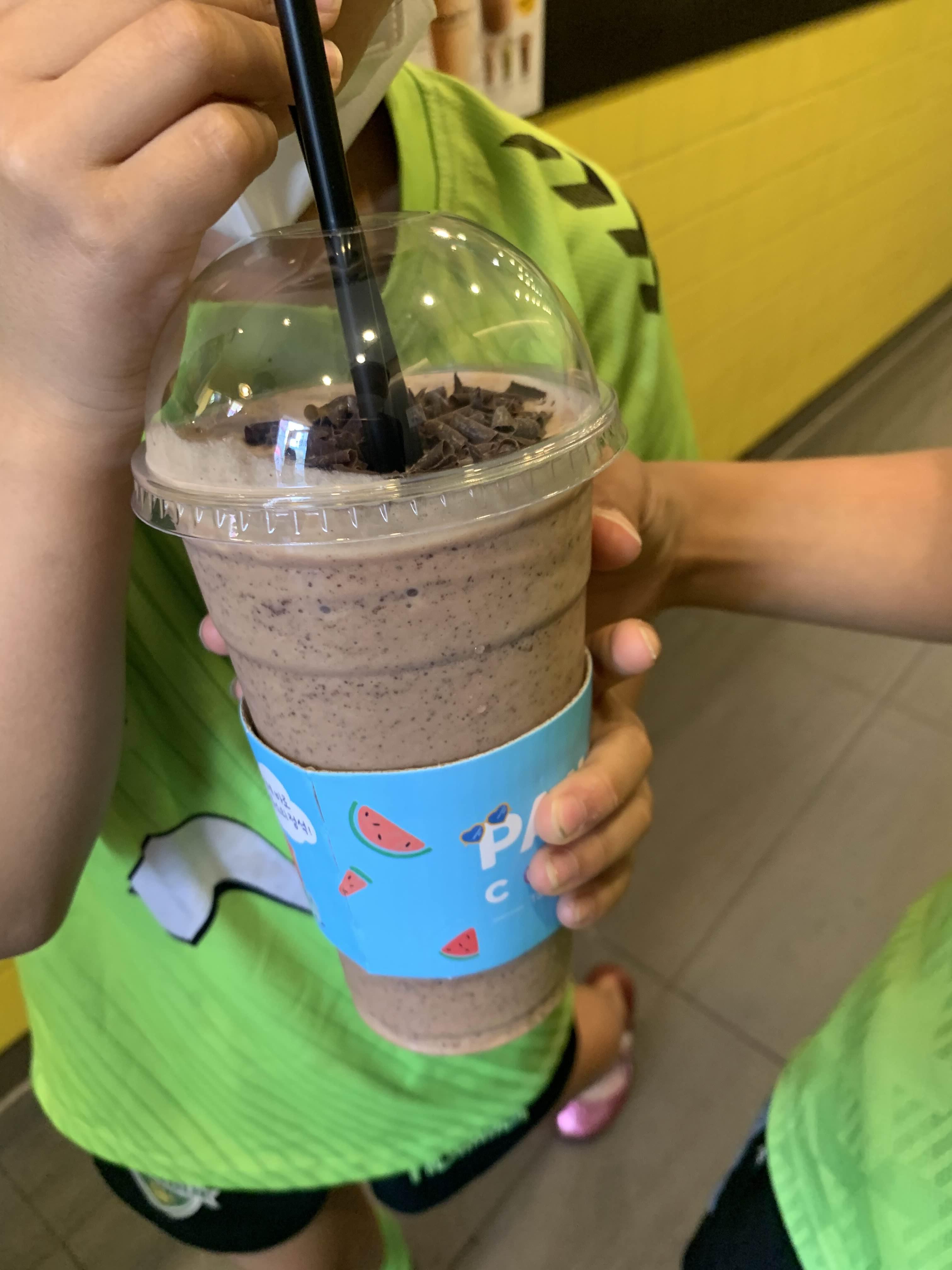 아이들이 좋아하는 딸기 바나나 또는 초코 바나나.... 각각 1개씩 먹어도 좋지만, 비용도 비용이지만... 차가운 주스를 너무 많이 마시면 배탈 나서... 1개 주문하여 2명이 나누어 먹게 했습니다.ㅎㅎ 초코 바나나 3,800원!!! 양이 상당히 많은데... 반절 정도 용량에 반절 가격에 판매하면... 2개 사서 각각 먹어도 좋겠는데.ㅎㅎ