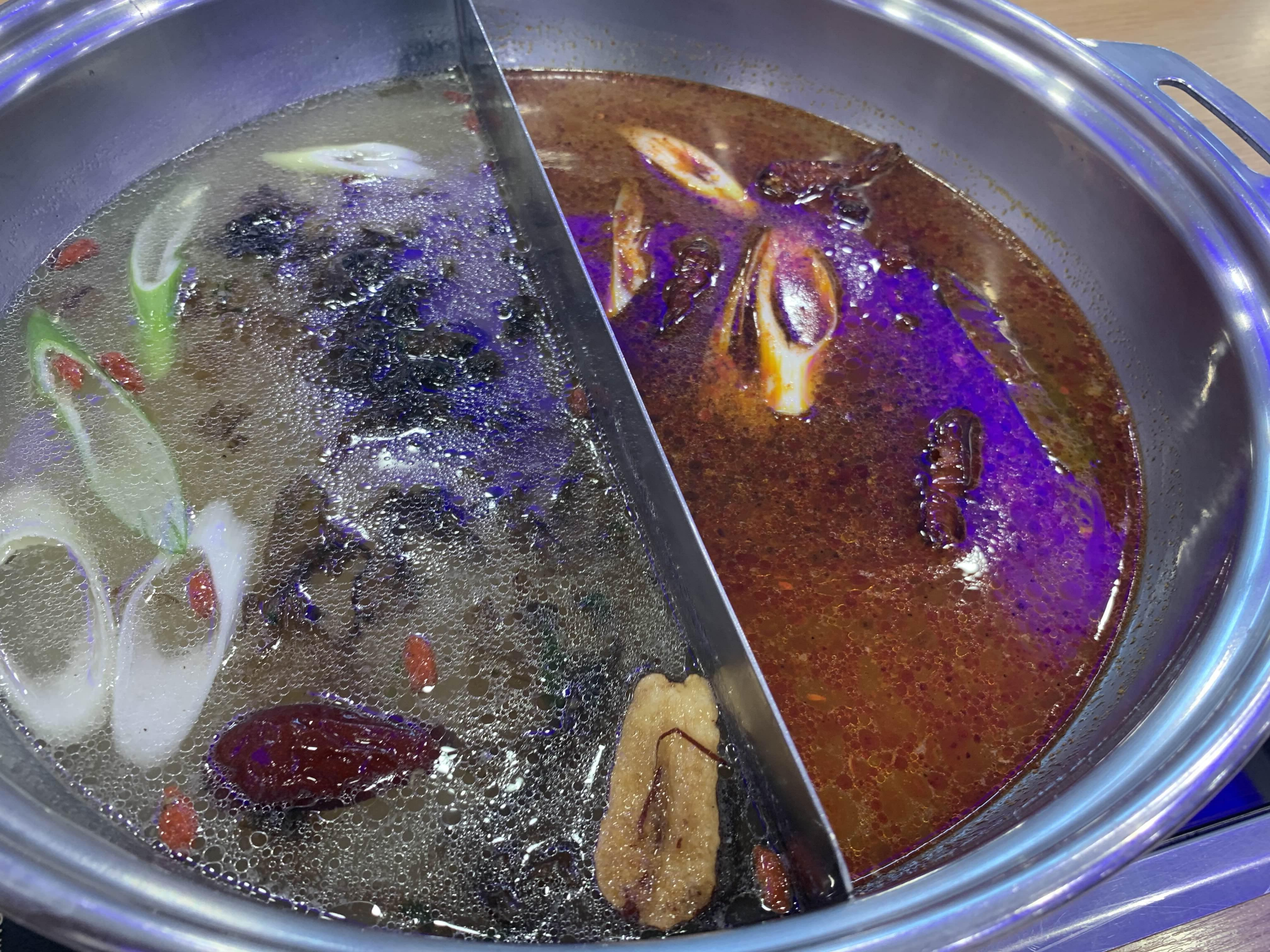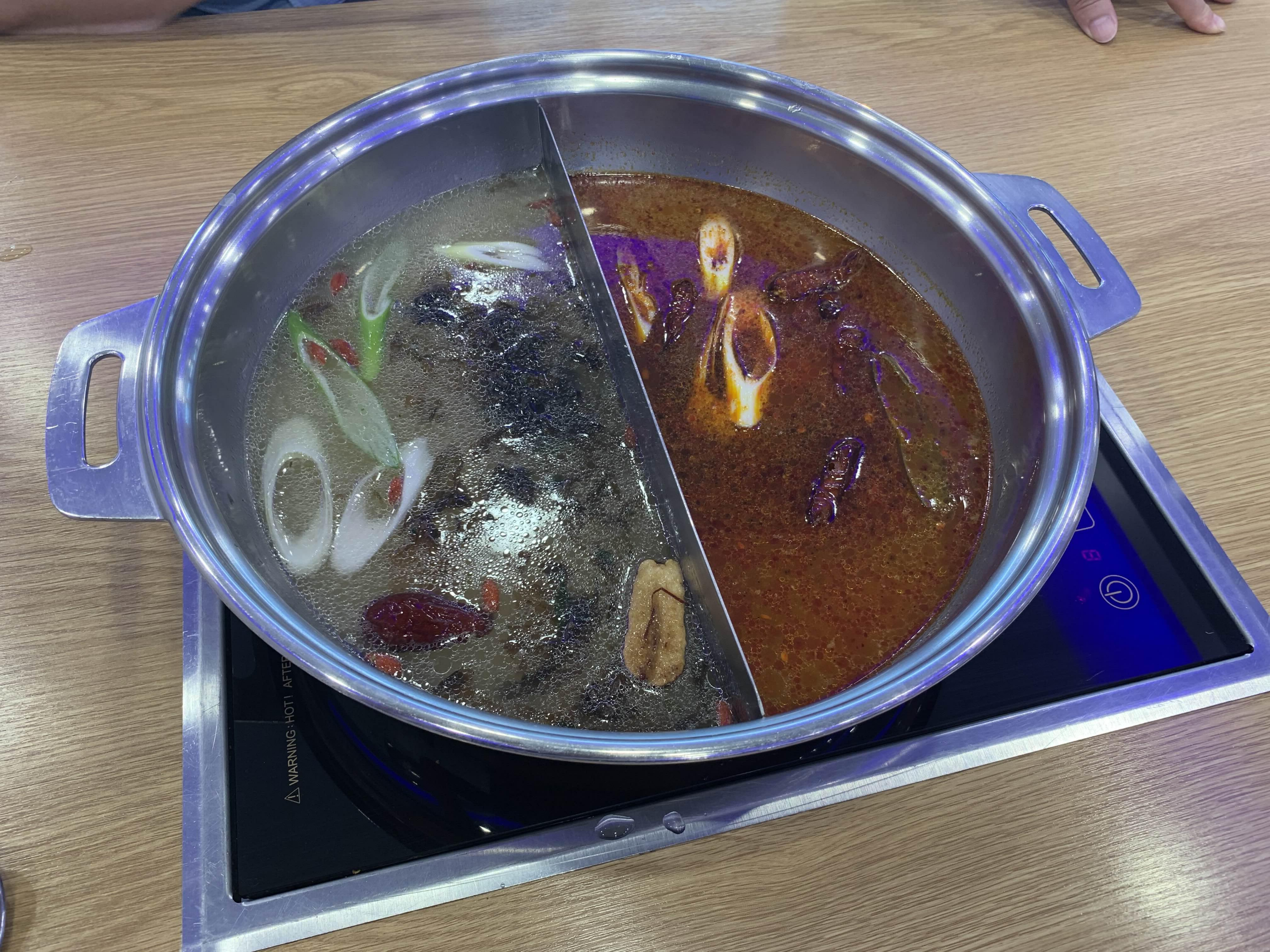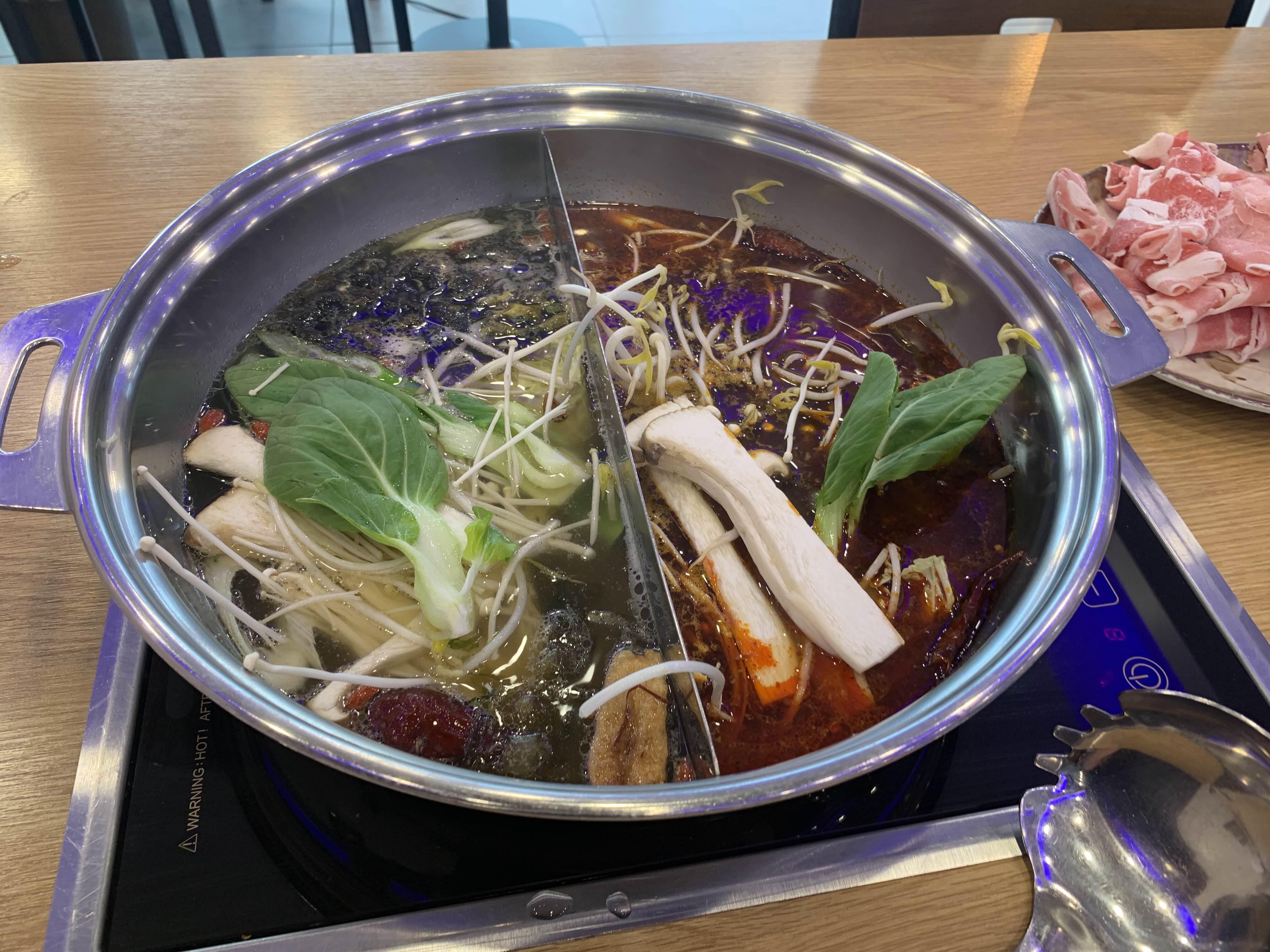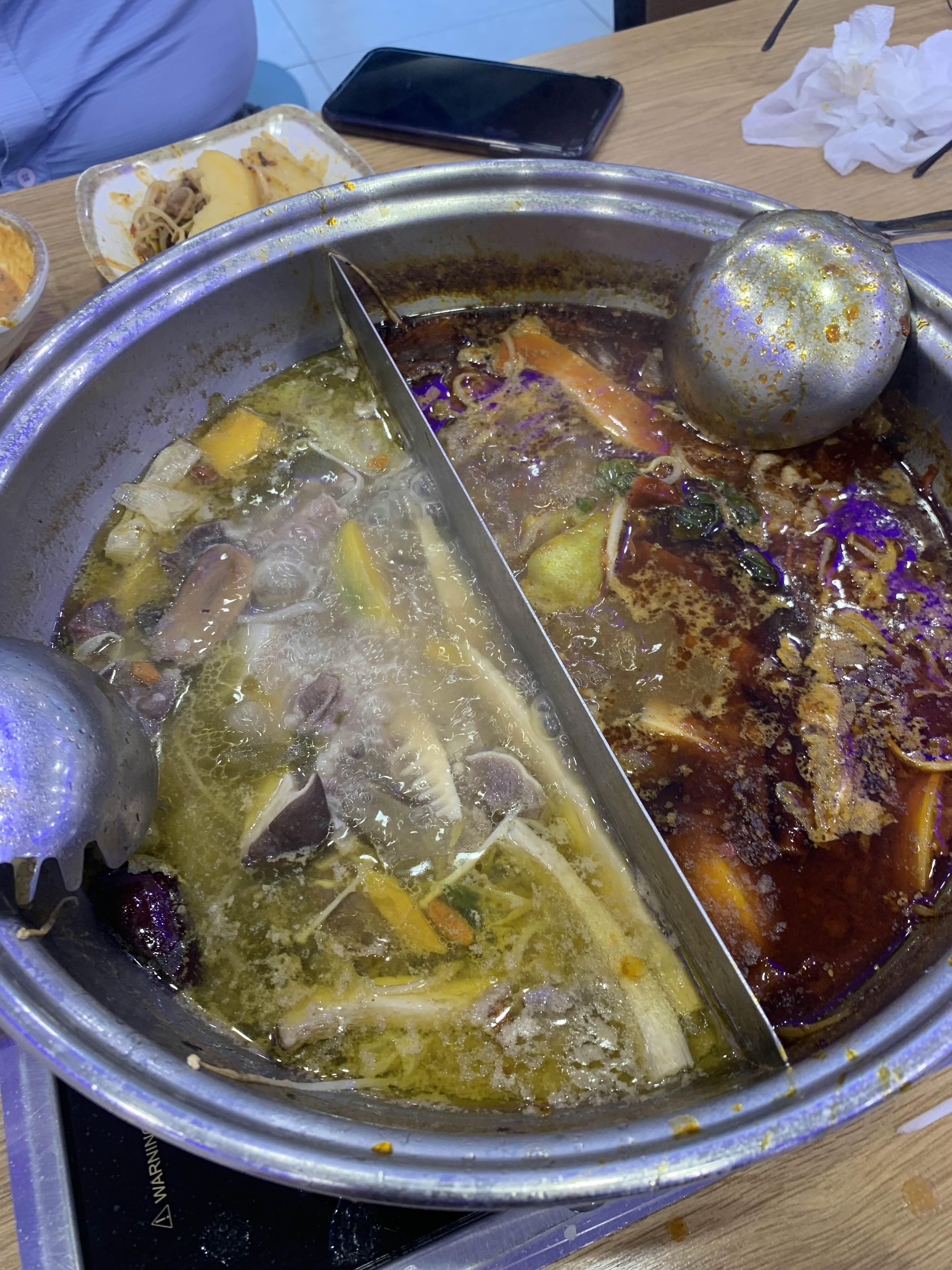 오늘은 훠궈를 맛보기 위해 방문한 식당이라 훠궈를 주문했습니다. 주문하고 잠시 후 반반 짜장/짬뽕 그릇 비슷한 그릇에 육수가 나옵니다. 국물이 끊기 전 각각 맛을 보는데, 하나는 곰탕국물? 그리고 다른 하나는 매콤한 식은 국물 맛이 나더군요.