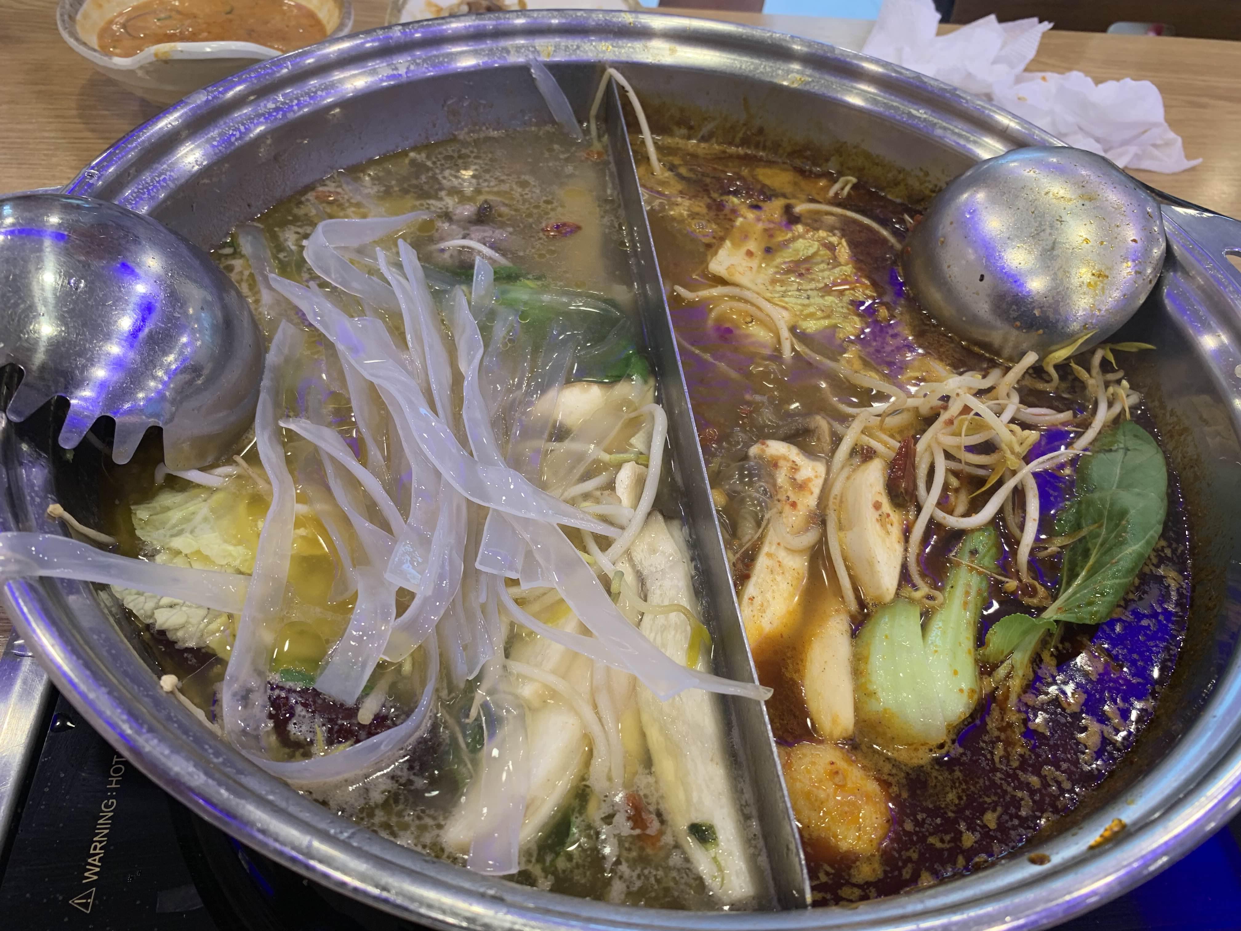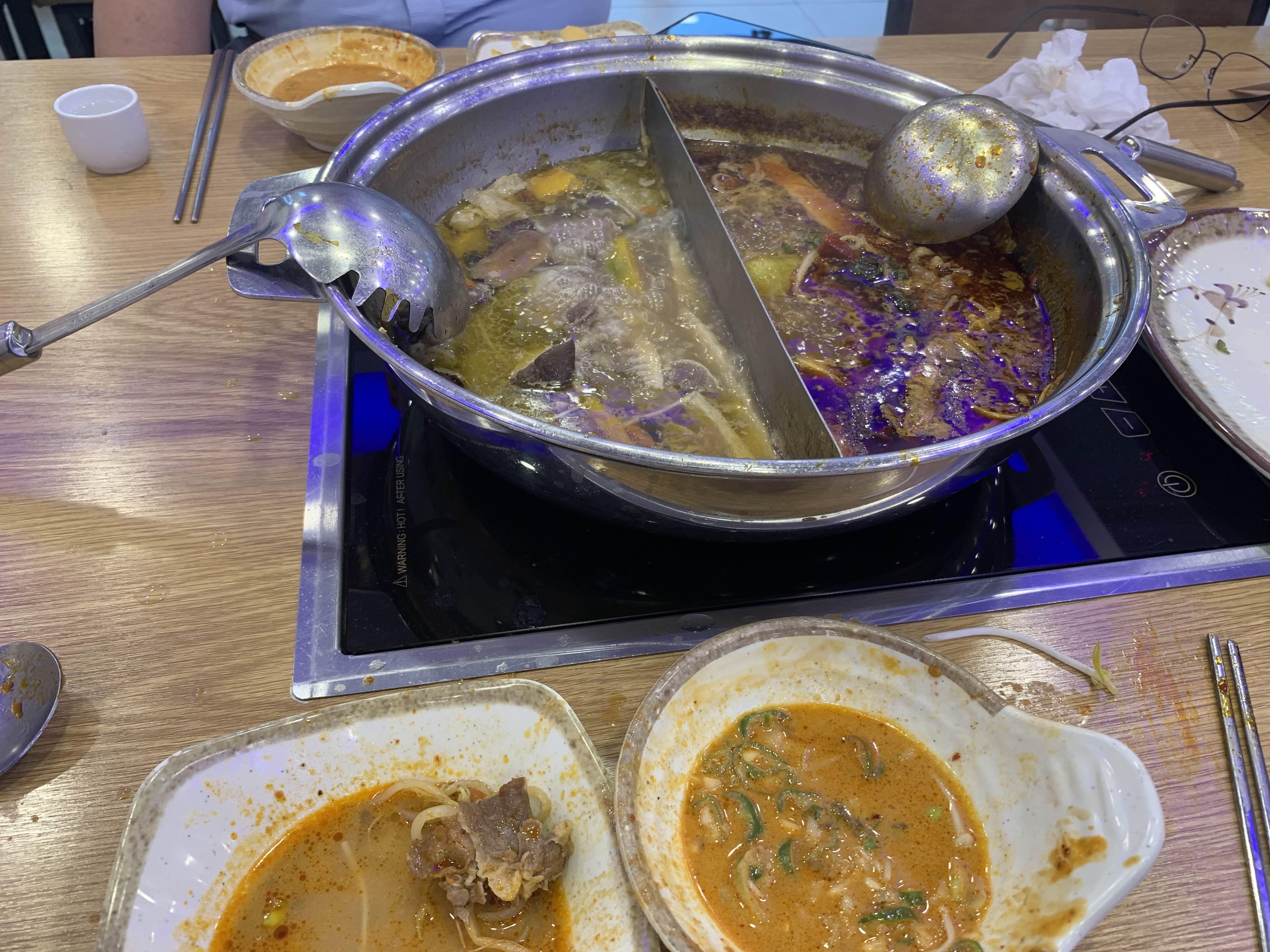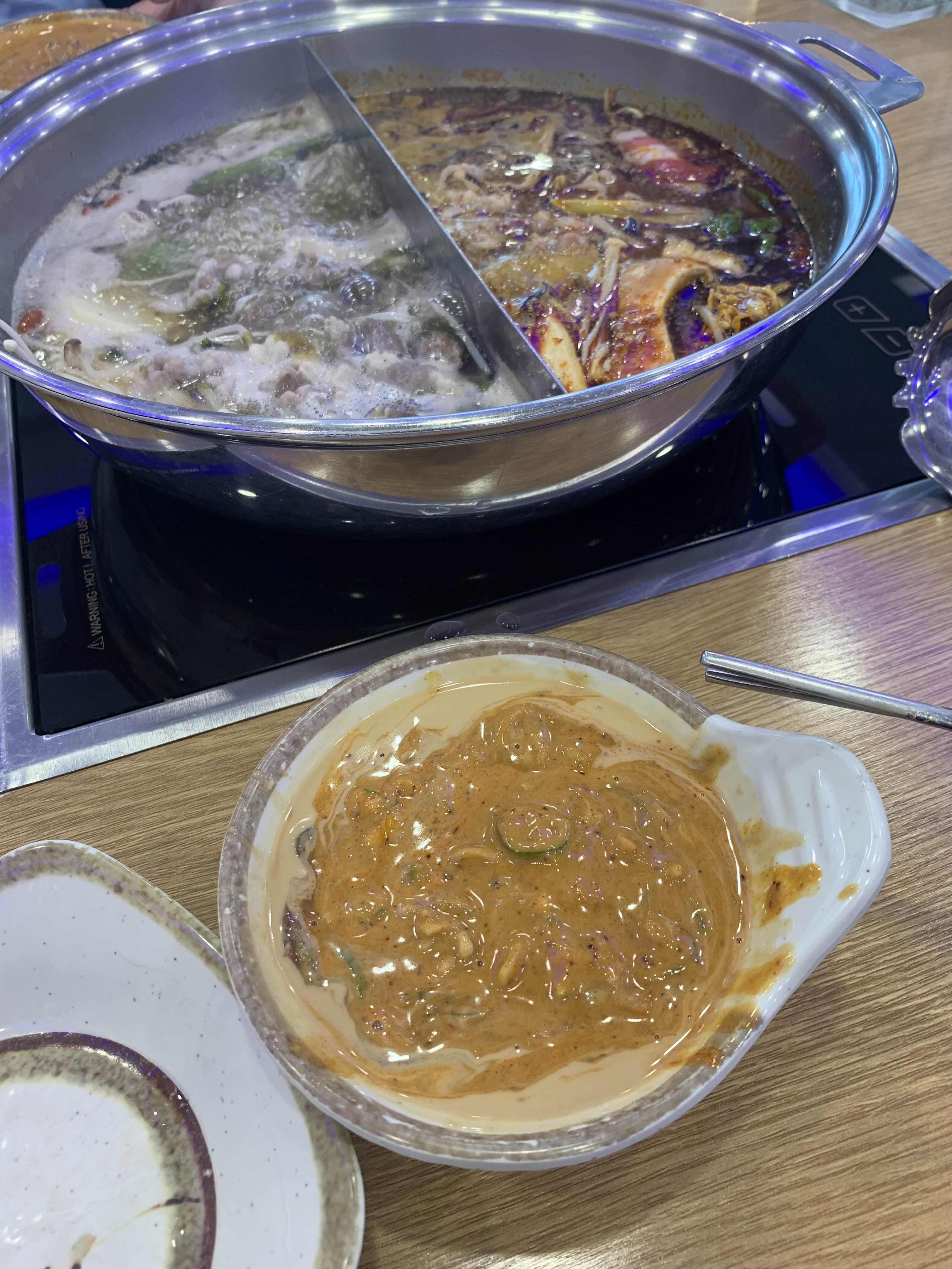 오늘은 훠궈를 맛보기 위해 방문한 식당이라 훠궈를 주문했습니다. 주문하고 잠시 후 반반 짜장/짬뽕 그릇 비슷한 그릇에 육수가 나옵니다. 국물이 끊기 전 각각 맛을 보는데, 하나는 곰탕국물? 그리고 다른 하나는 매콤한 식은 국물 맛이 나더군요.