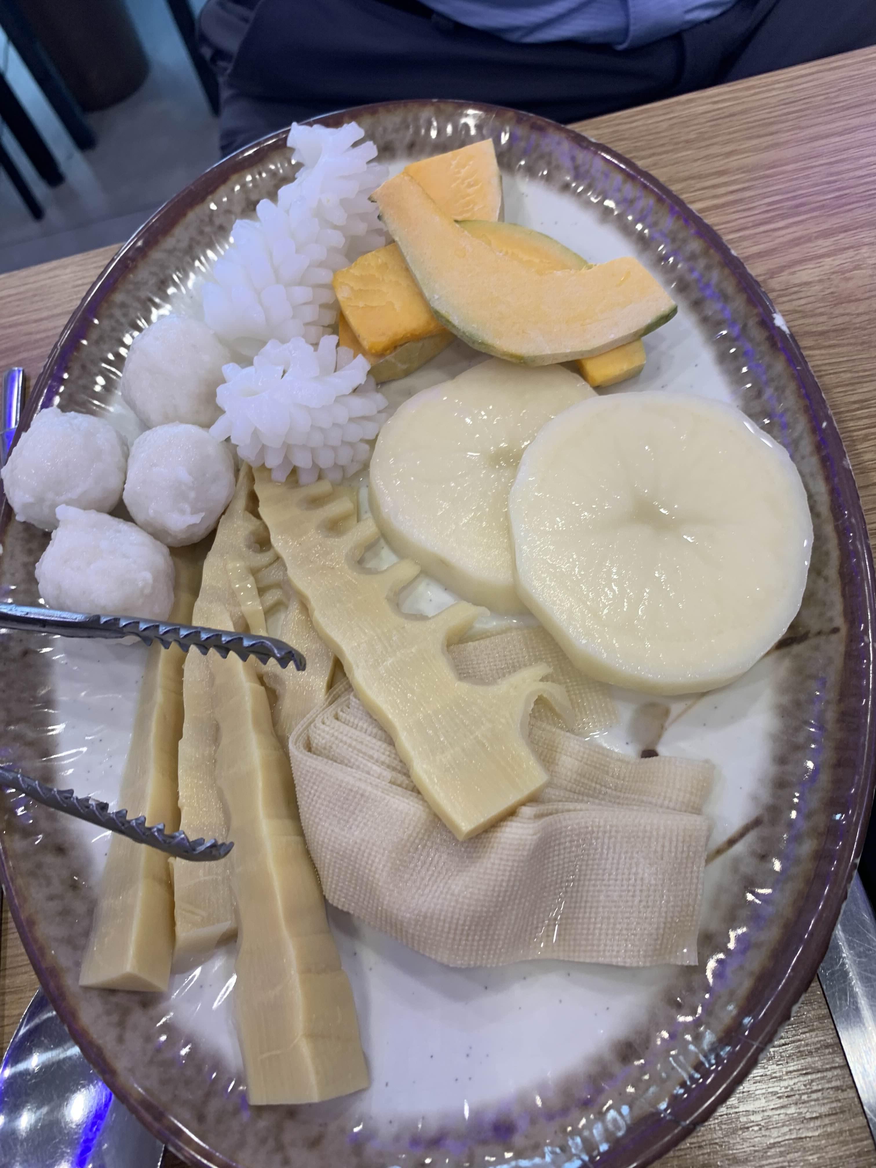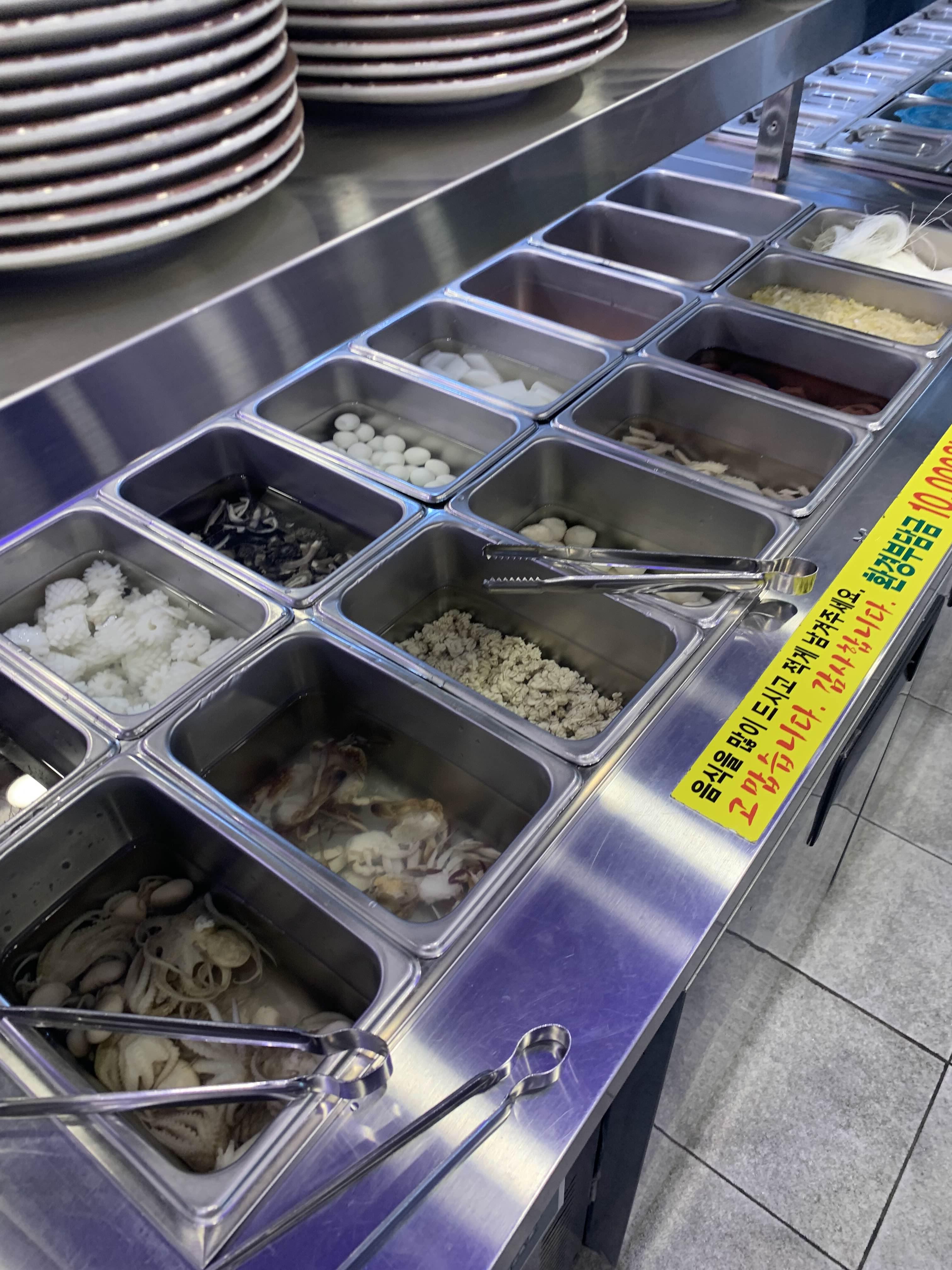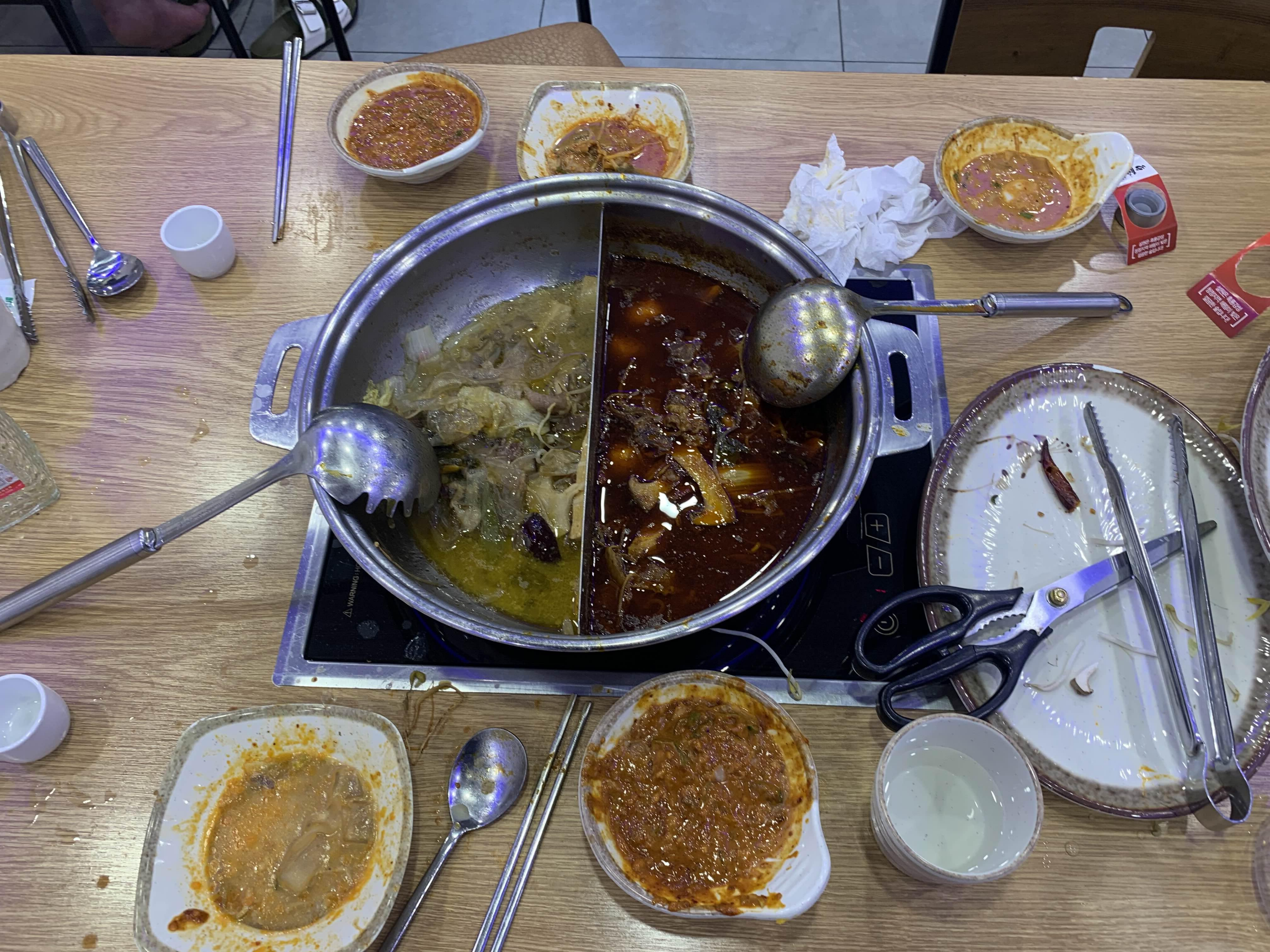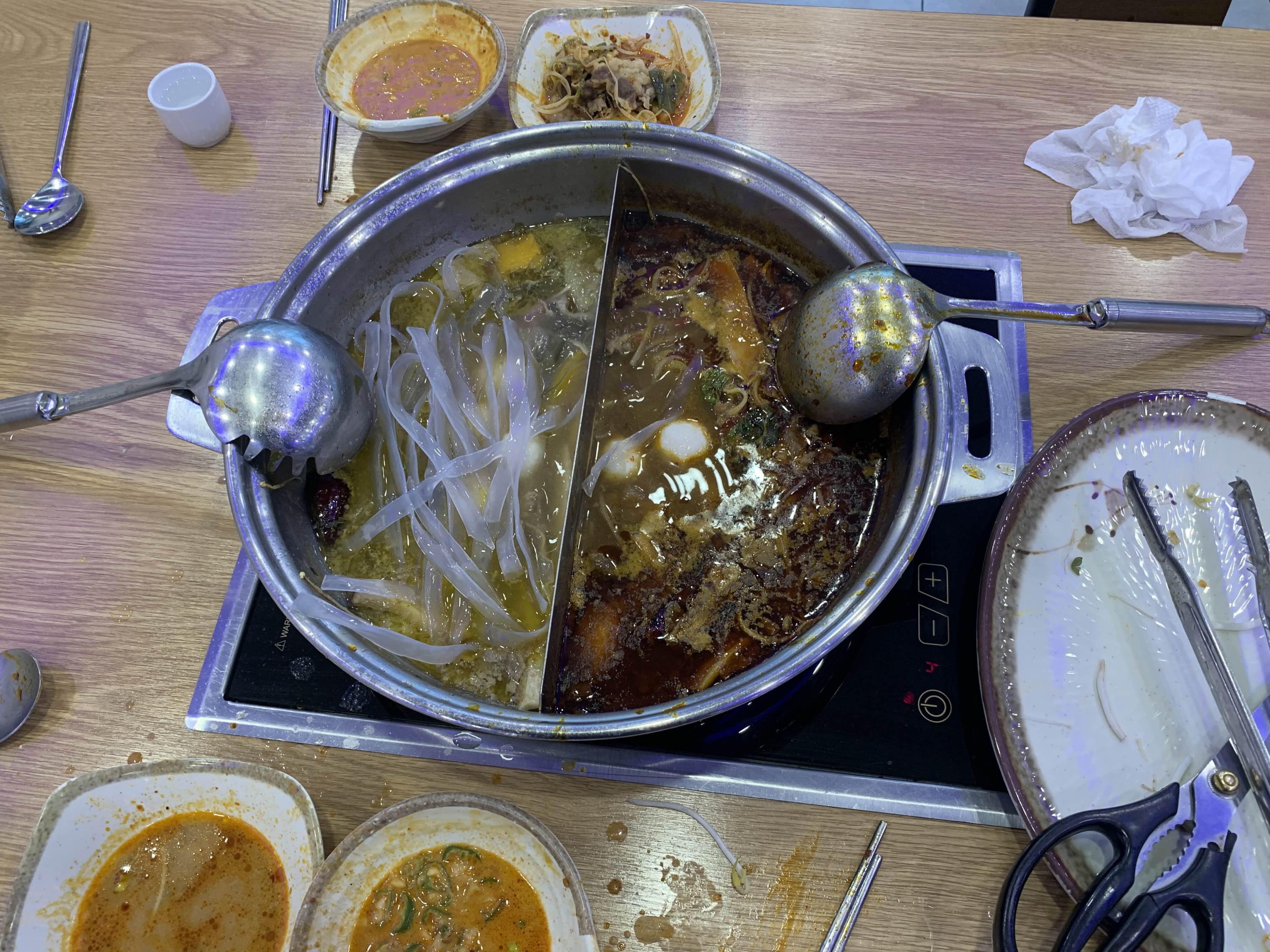 오늘은 훠궈를 맛보기 위해 방문한 식당이라 훠궈를 주문했습니다. 주문하고 잠시 후 반반 짜장/짬뽕 그릇 비슷한 그릇에 육수가 나옵니다. 국물이 끊기 전 각각 맛을 보는데, 하나는 곰탕국물? 그리고 다른 하나는 매콤한 식은 국물 맛이 나더군요.