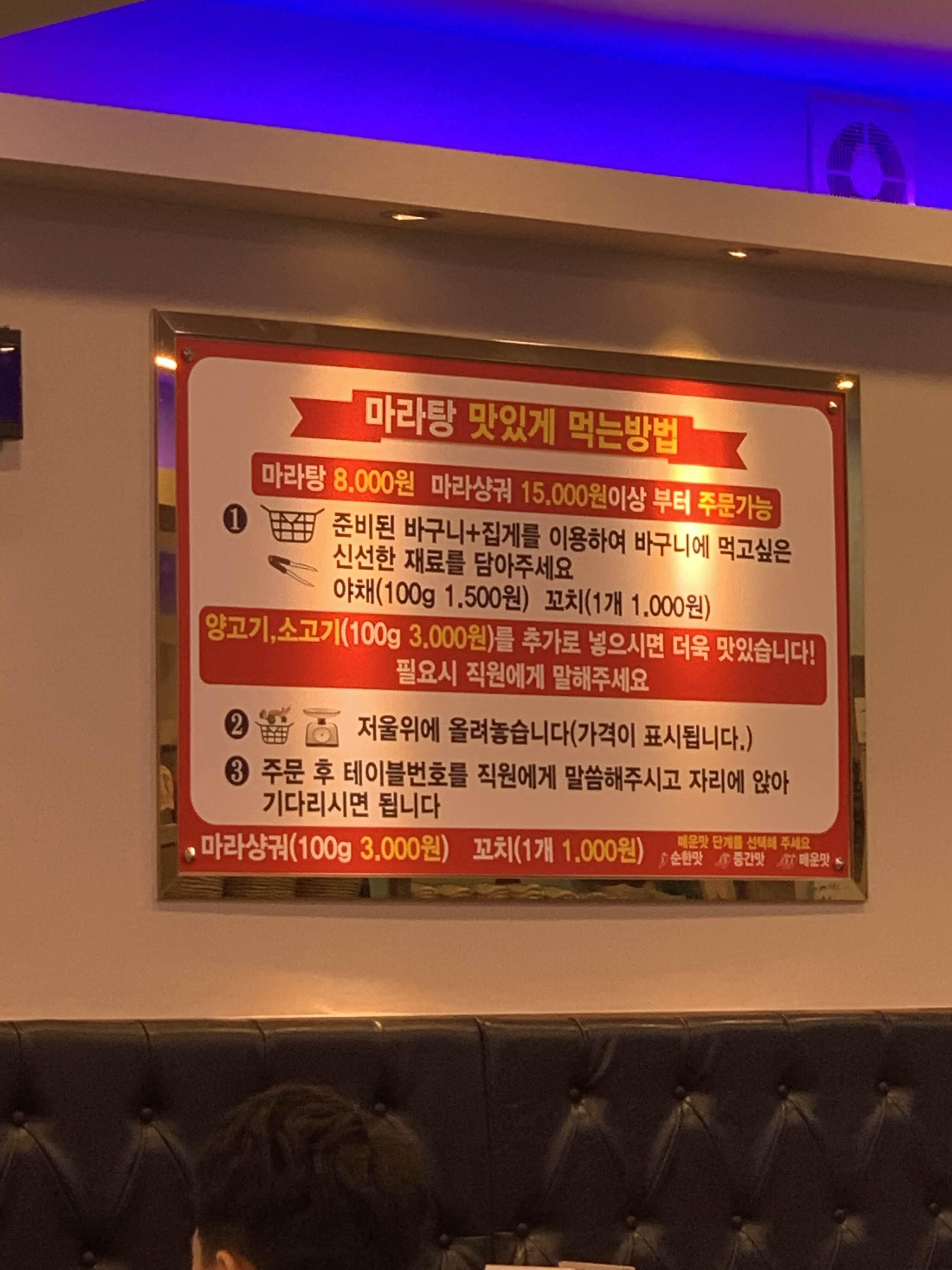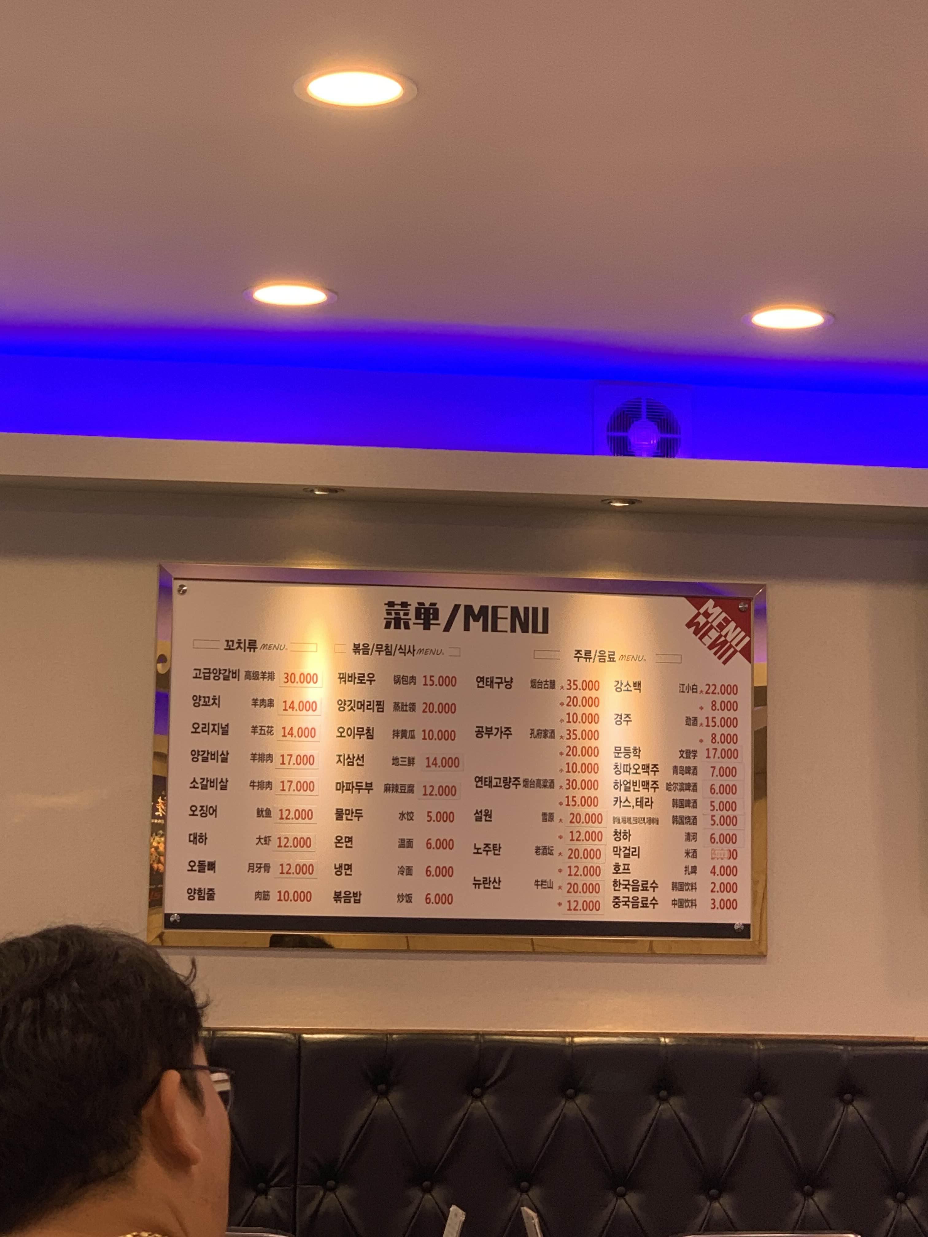 방문한 식당에는 테이블이 2개의 종류로 나누어져 있더군요. 하나는 양꼬치를 굽는 테이블과 다른 하나는 훠궈를 맛보는 테이블로!!! 일단, 양꼬치 테이블의 메뉴판 사진! ㅎㅎ 아래 사진은 훠궈 가격표! 성인 2만 원 소인 1만 원~