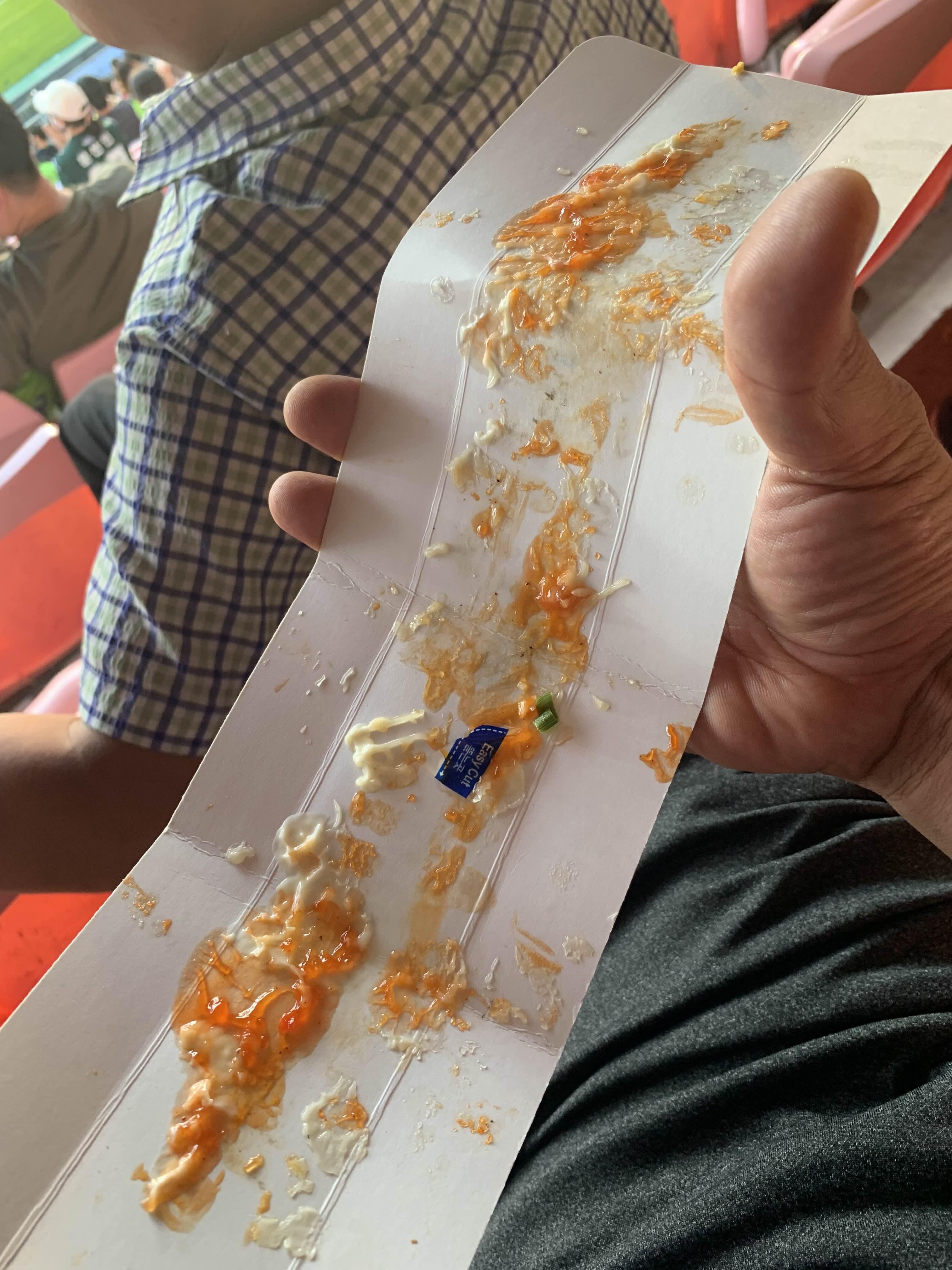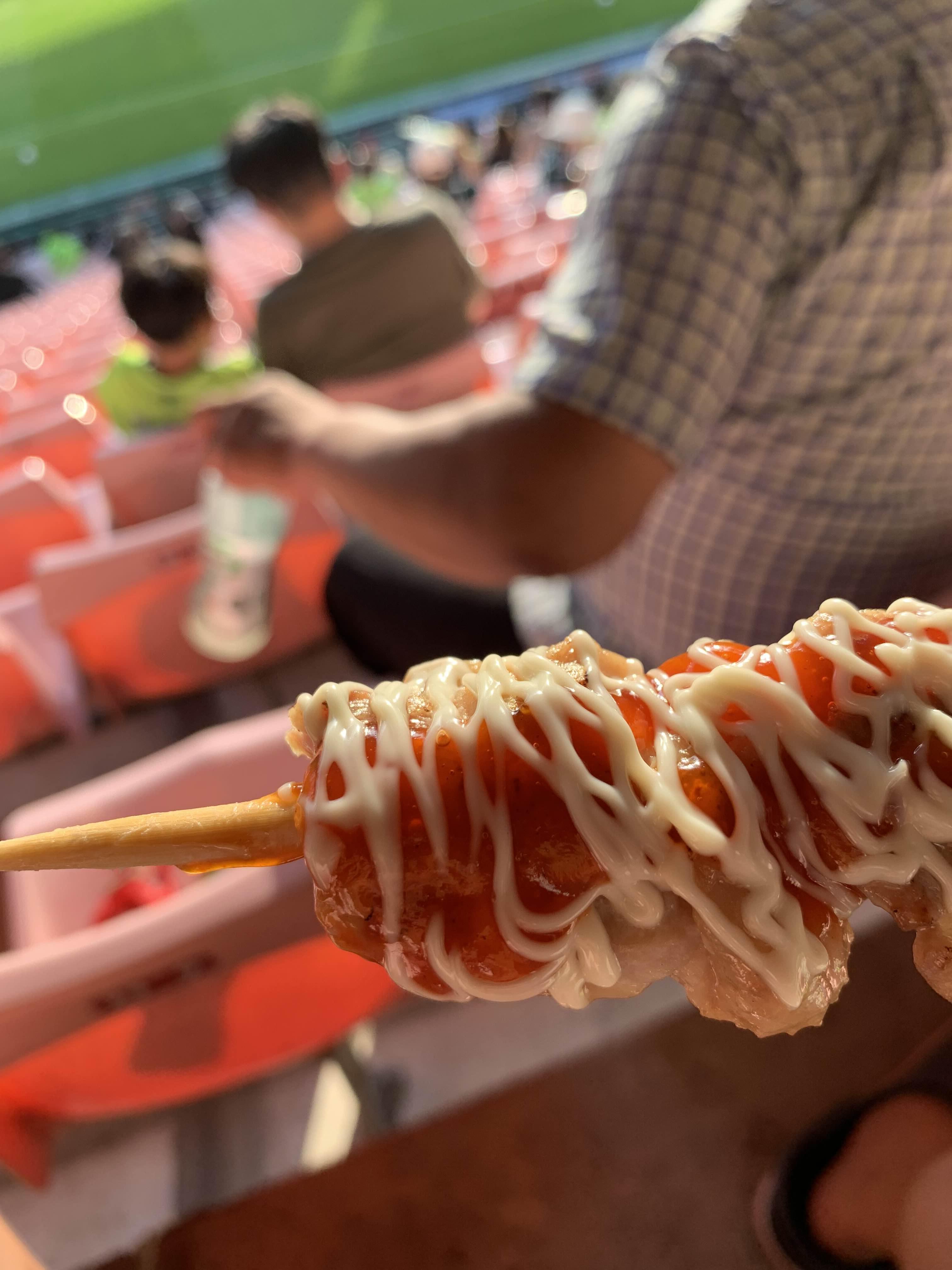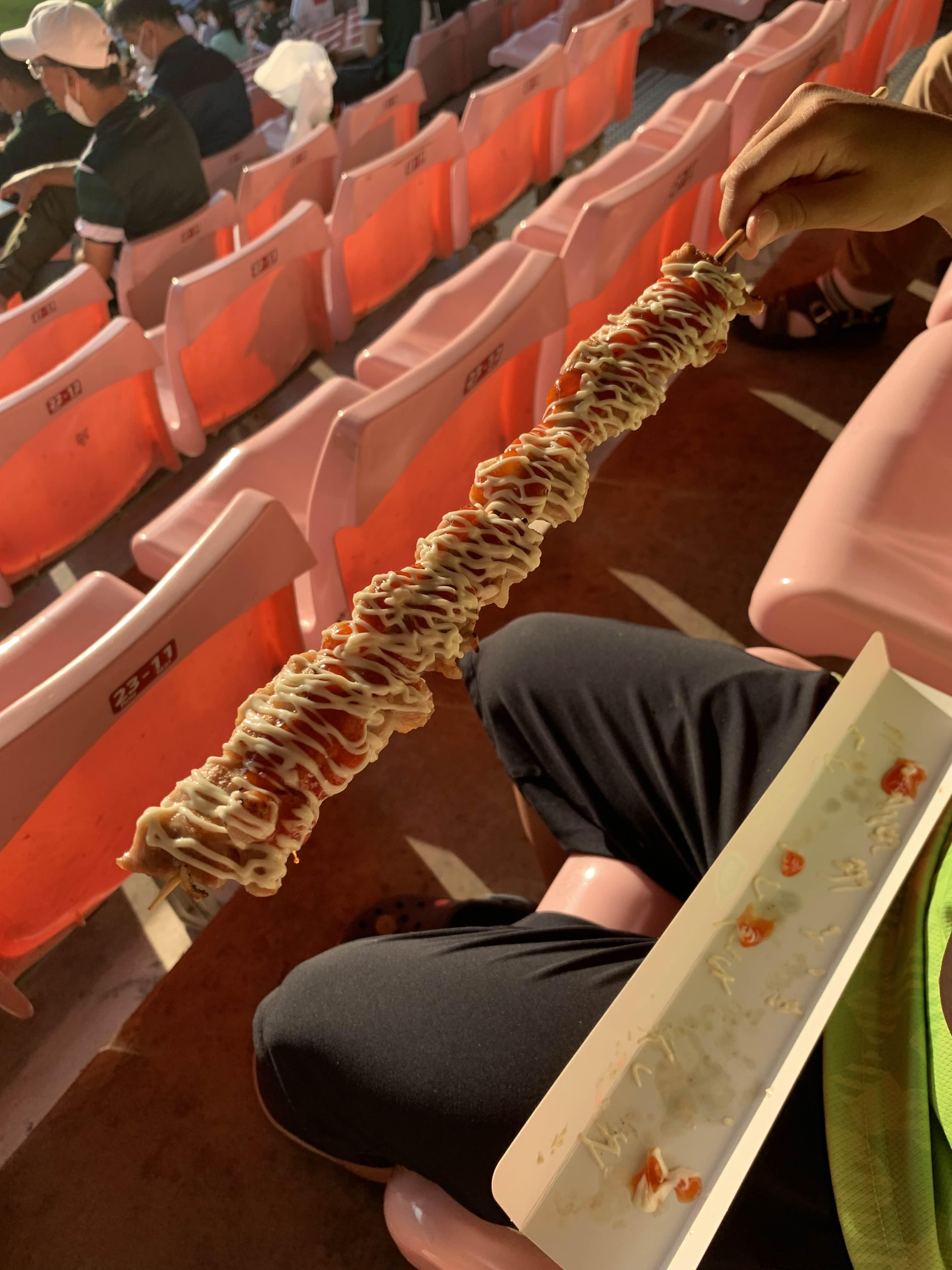 준비된 닭꼬치를 들고서 경기장으로~~~ 매콤한 닭꼬치는 그렇게 매콤하게 느껴지지는 않더군요. 겉에 뿌려진 마요네즈? 소스 덕분에 그리 매콤하게 느껴지지 않았나..... 겉의 하얀 소스를 빼고, 안에 빨간 소스만 된 부분을 맛보니... 헐헐!!! 매콤하네요.ㅎㅎ