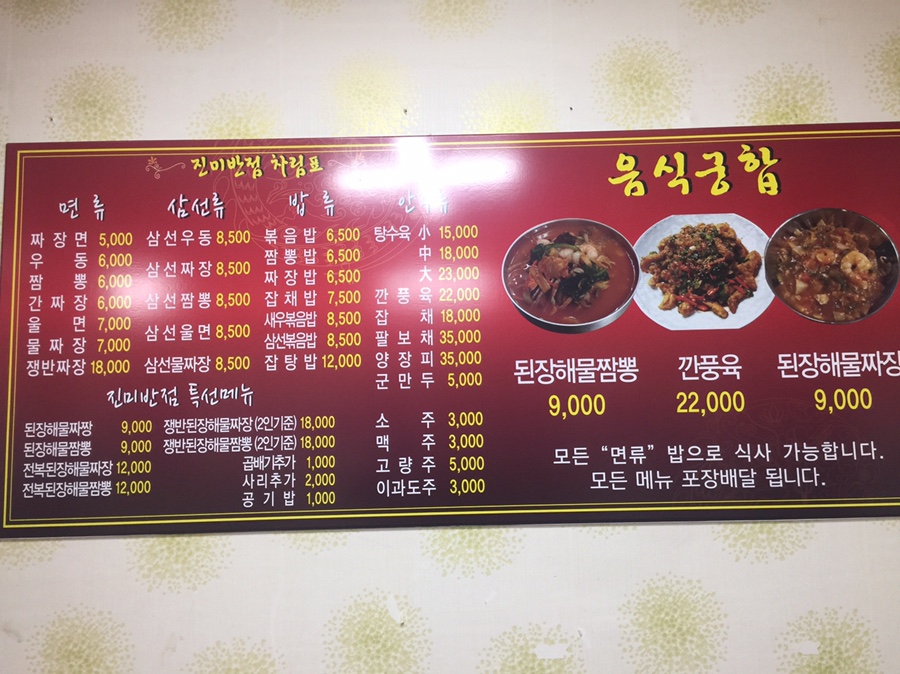 짜장면은 면발이 좀 퍼져 양념에 밥만 비벼서 아이들 주었네요. 탕수육은 아이들도 잘 안 먹어서... 제가 거의 다 먹었고. 얼큰한 짬뽕을 원하시는 분들이 진미반점은 비추입니다. 간이 약한 건강한 짬뽕? 을 원하시는 분들에게 좋을 거 같습니다. 음식을 남기고 말았네요. 기대를 너무 많이 해서 그런지 맛은 좀 별로였습니다. 된장 짬뽕은 6,000원 정도 한다면 재방문할까 말까 고민할 거 같네요.