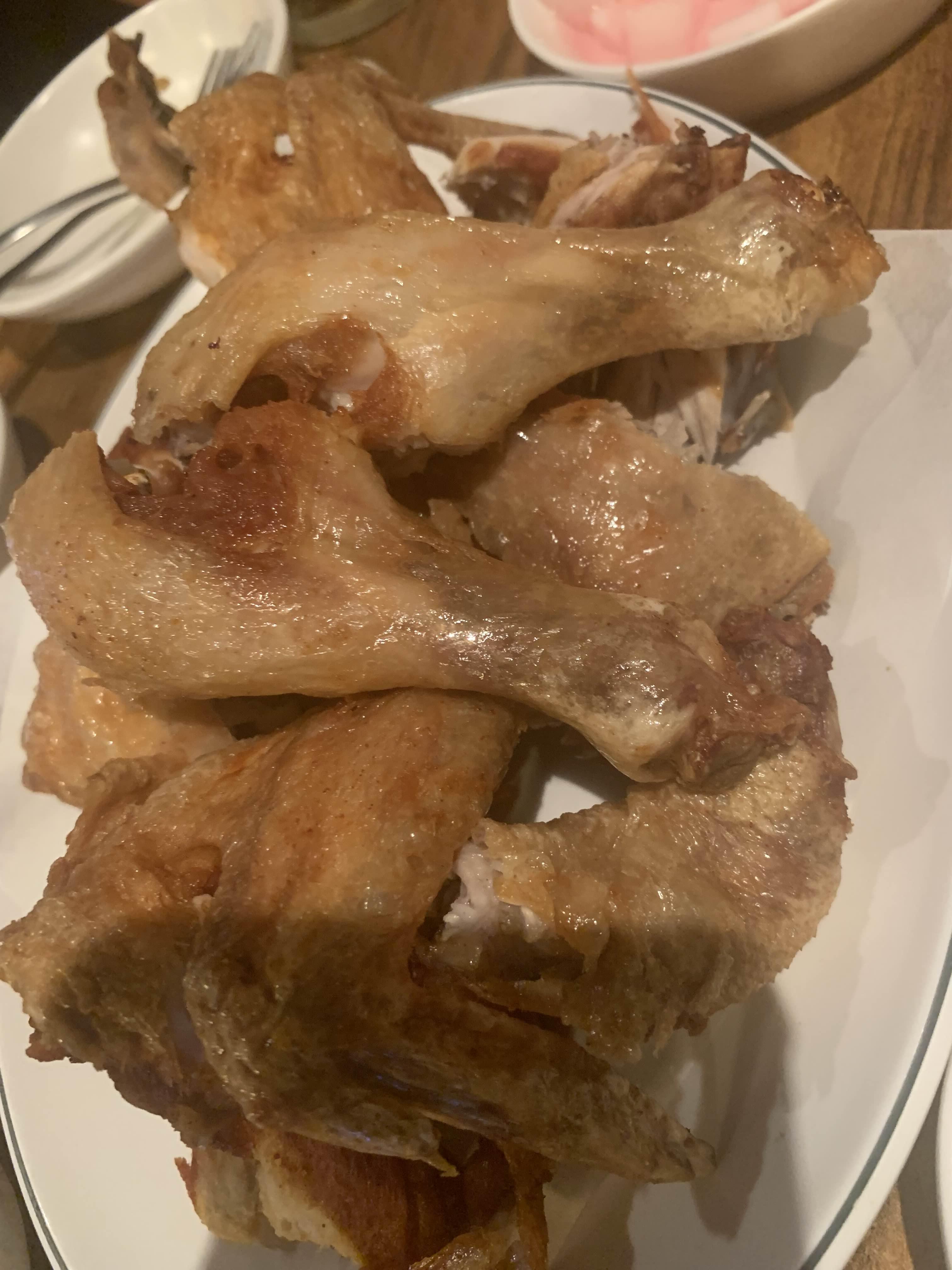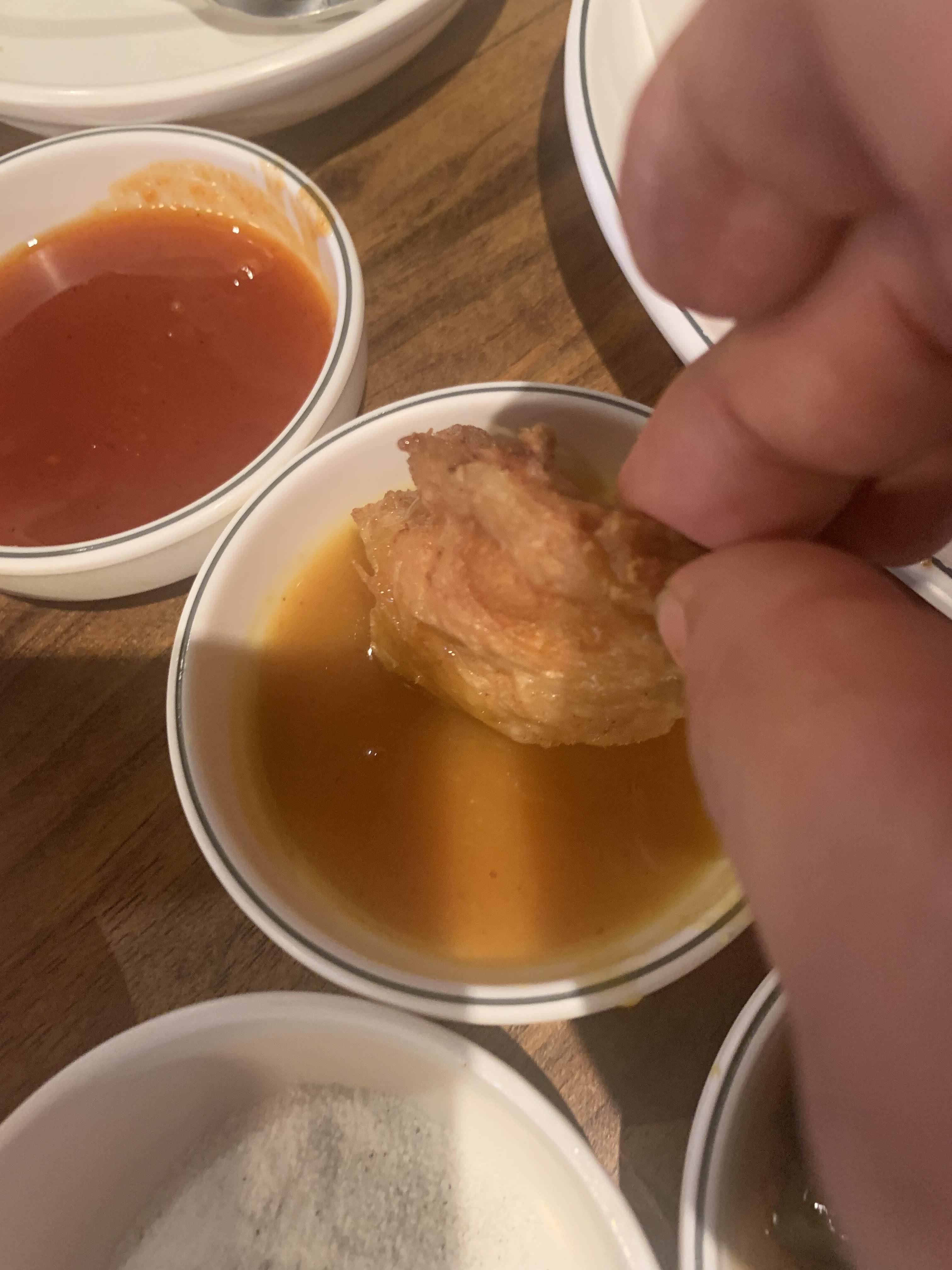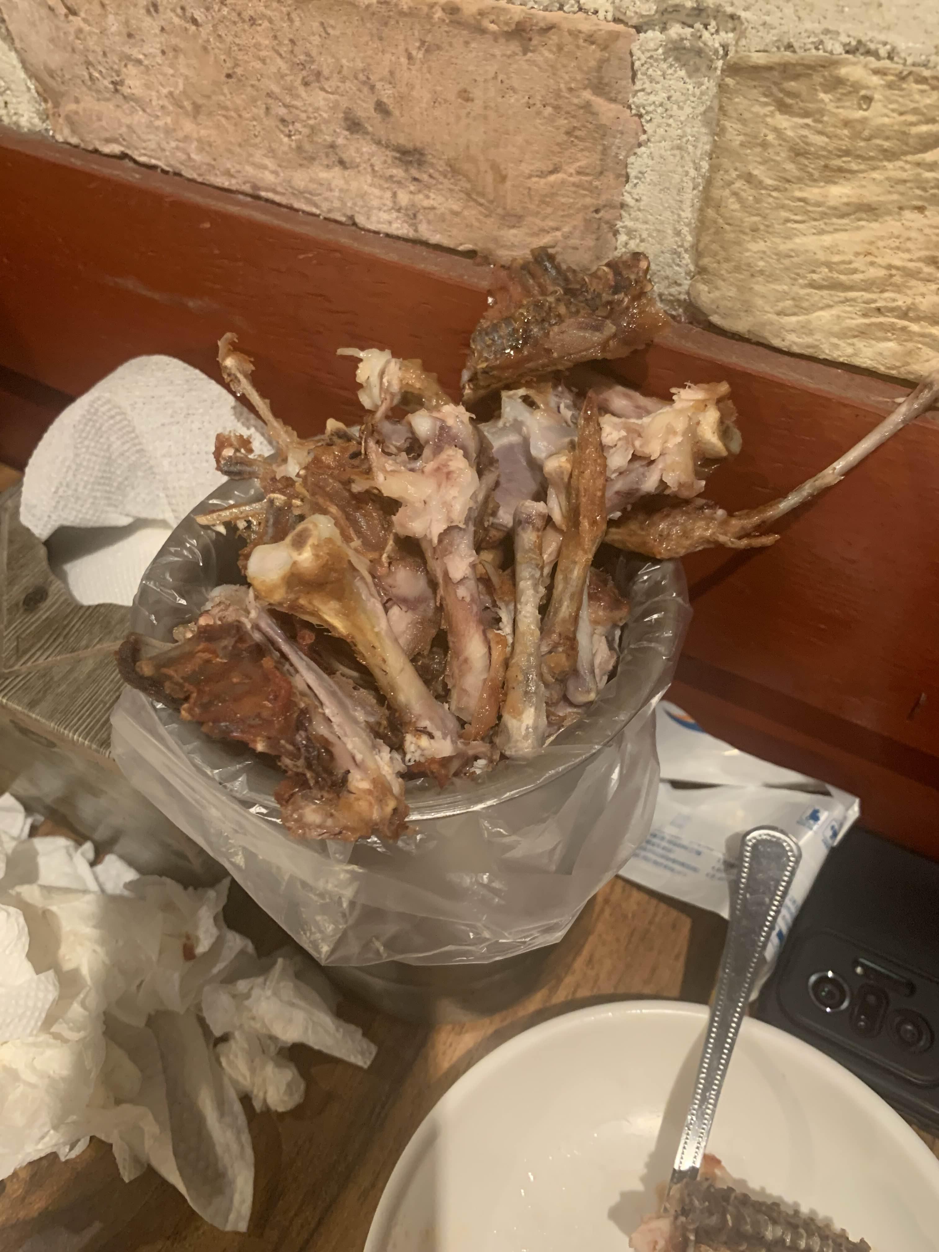 잔반 그릇에는 어느새... 치킨 뼈 산이 생겨버렸습니다. 3마리의 치킨을 소화하기에는 뼈통이 부담감이 었었나 봅니다. 잔반 그릇에 휴지도 들어가니.ㅎㅎ 치킨을 맛보는데, 양념치킨 소스보다는 겨자소스에 찍어먹으니 치킨 맛이 더 좋더군요.