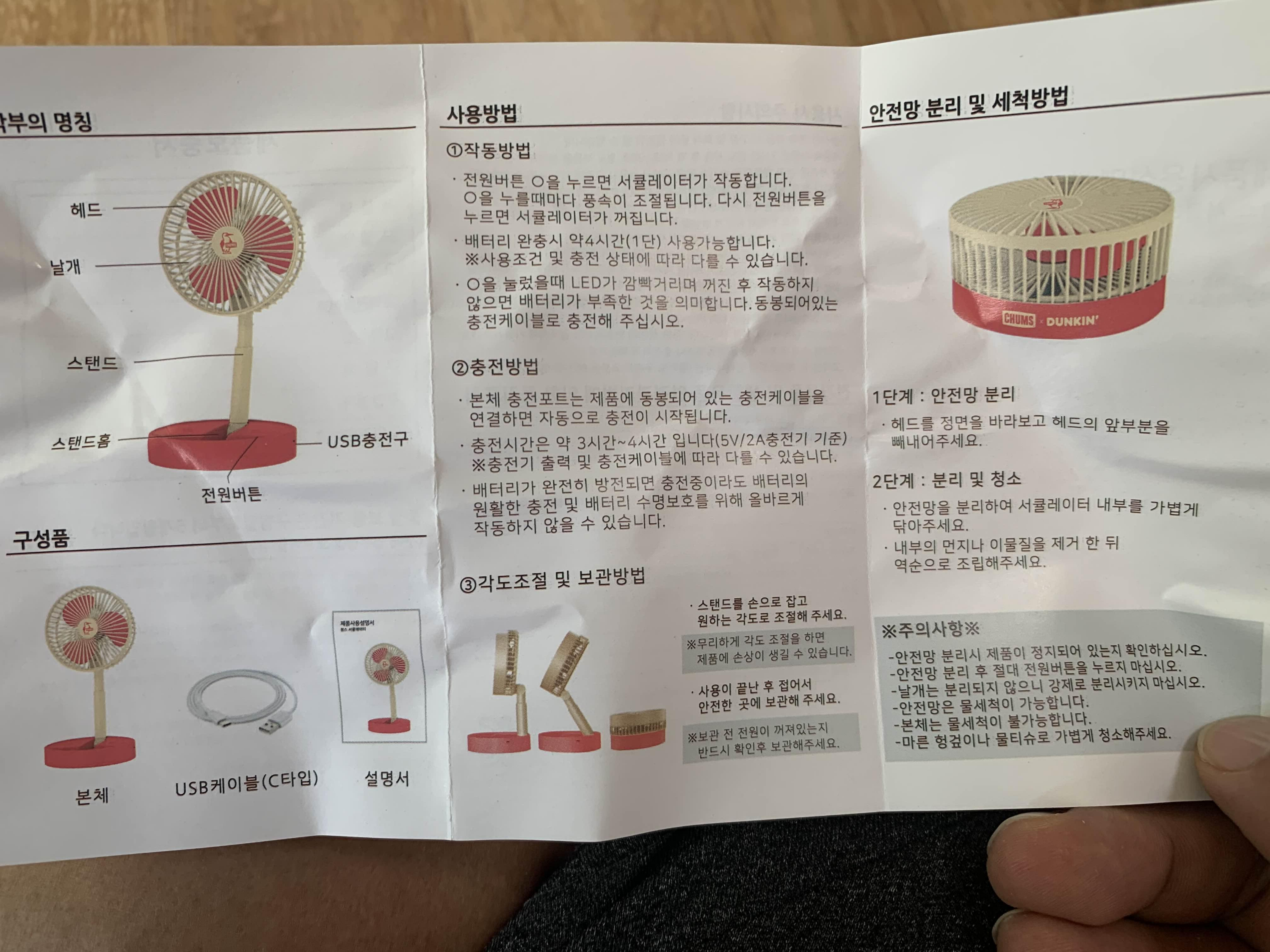 아내가 휴대용 선풍기를 구매했습니다. 던킨도너츠에서 12,000원 이상 구매 시 증정용으로 지급하는 선풍기가 아닌!!! 일정 금액 구매한 고객을 상대로 선풍기를 구매할 수 있다 하여 구매했다고 하더군요.ㅎㅎ
