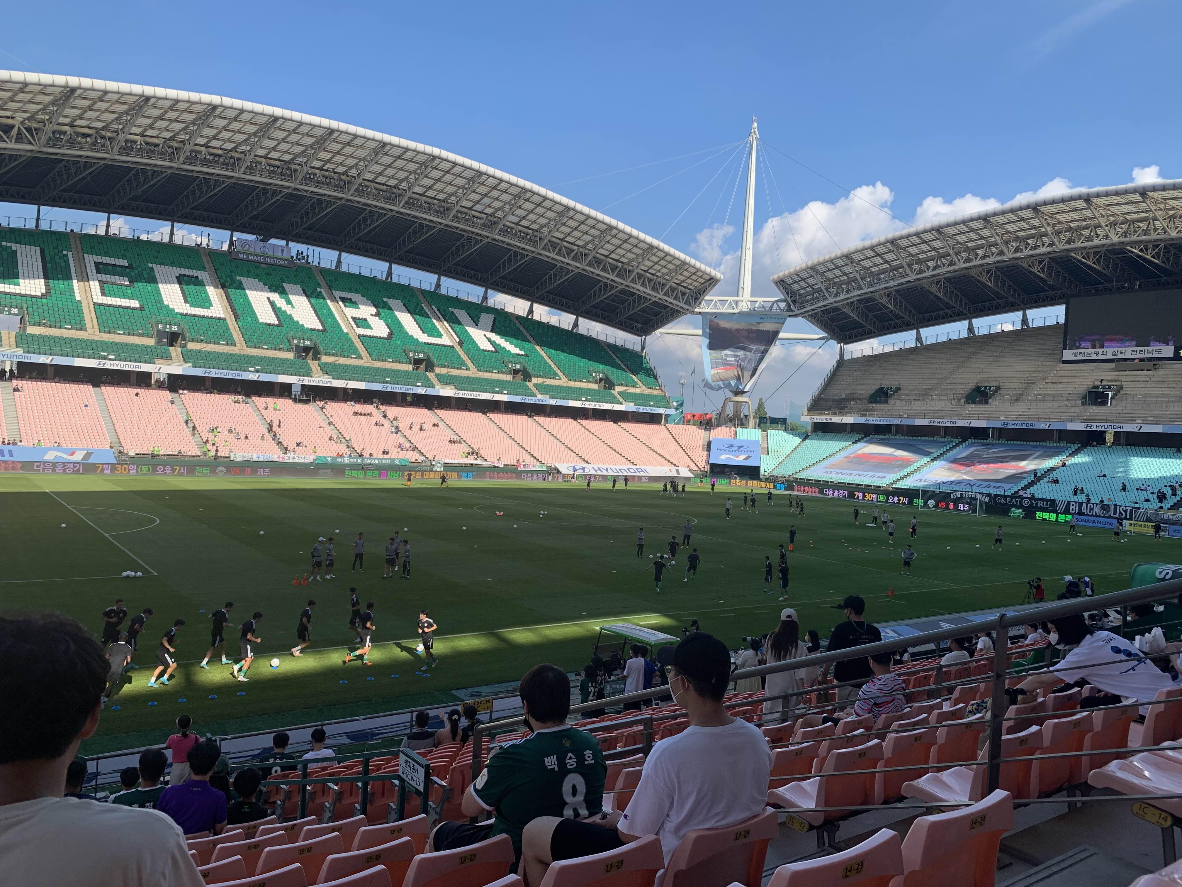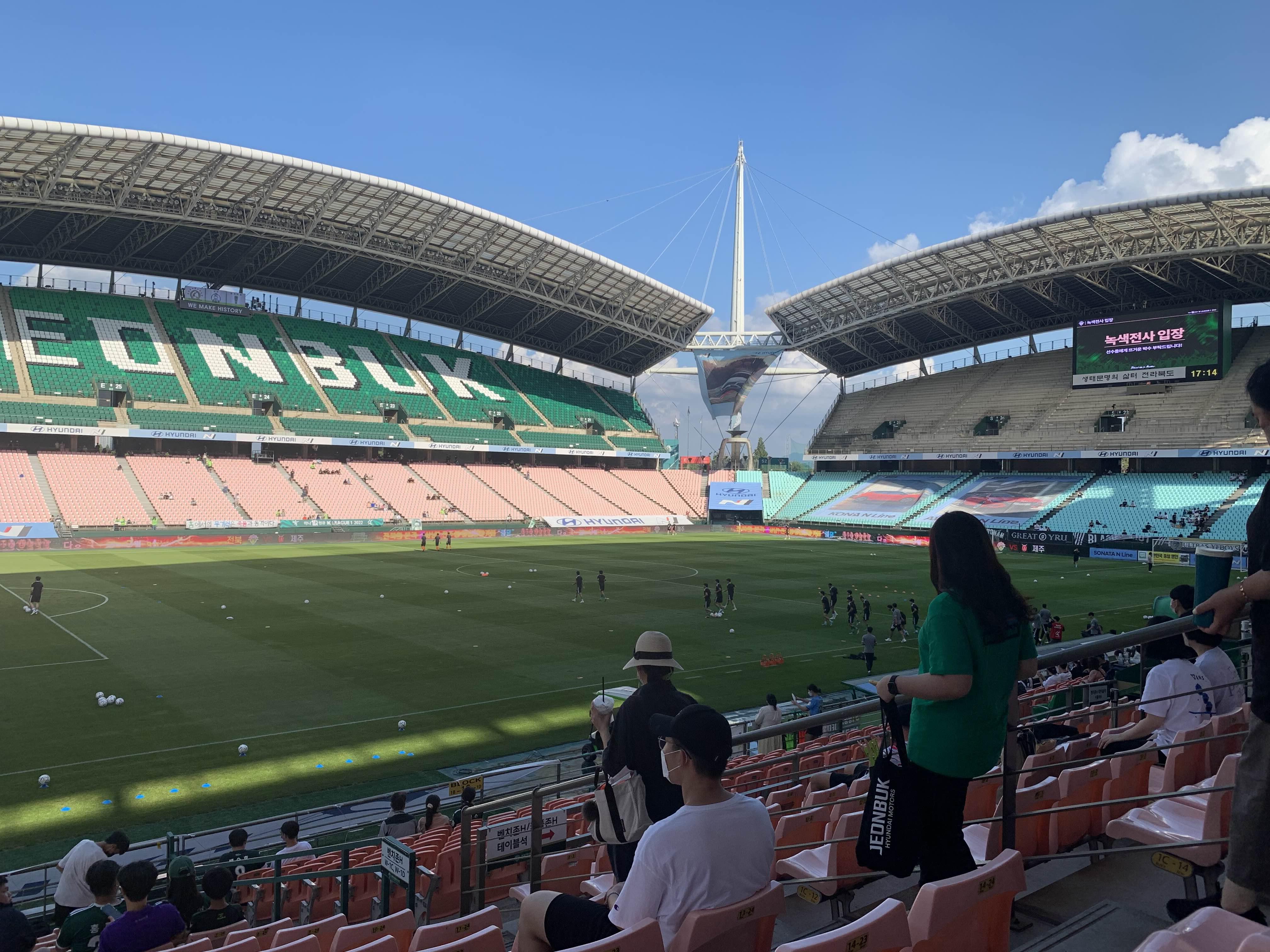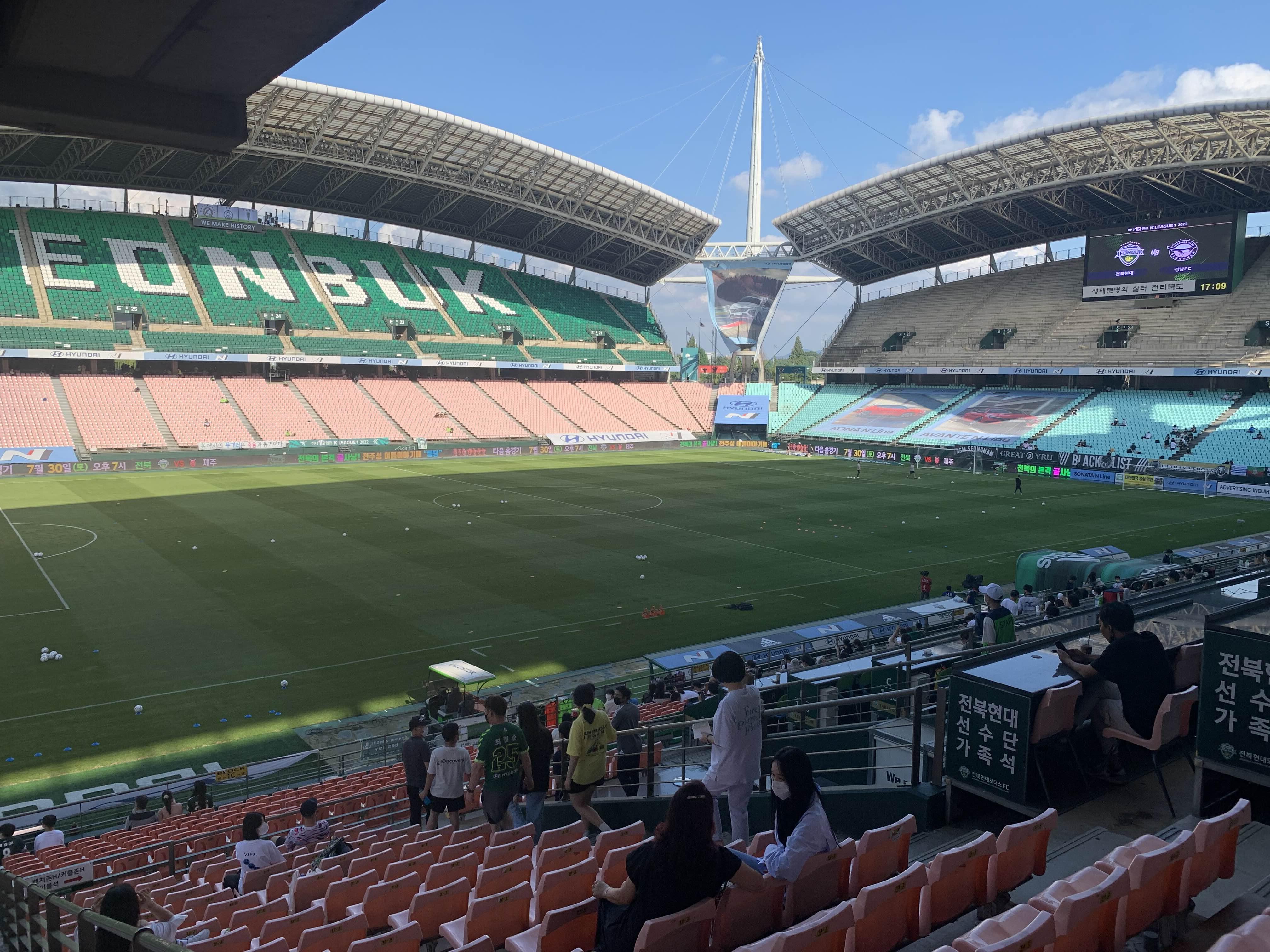 전주 월드컵경기장 홈경기 좌석은 N석 중앙에 자리를 예약하고 방문합니다. 오늘은 작은아이 에스코트가 있어서, W석으로 향했습니다. W석에서 기다리고 있으니... 선수를 몸 푸는 모습이 잘 보여서 좋기는 하더군요. 더욱이 무더운 여름! 햇볕이 안 들어와서 덜 덥더군요.ㅎㅎ