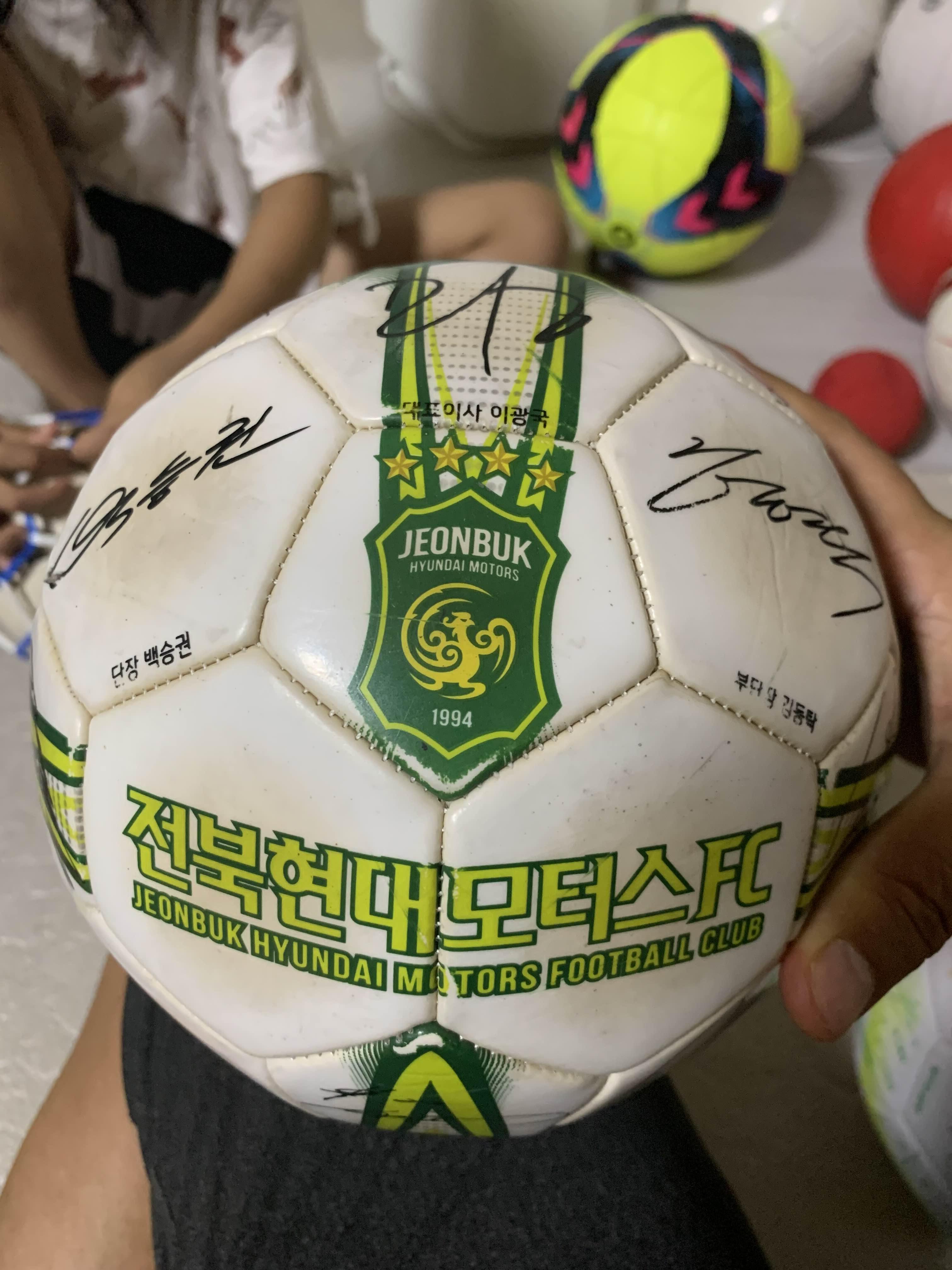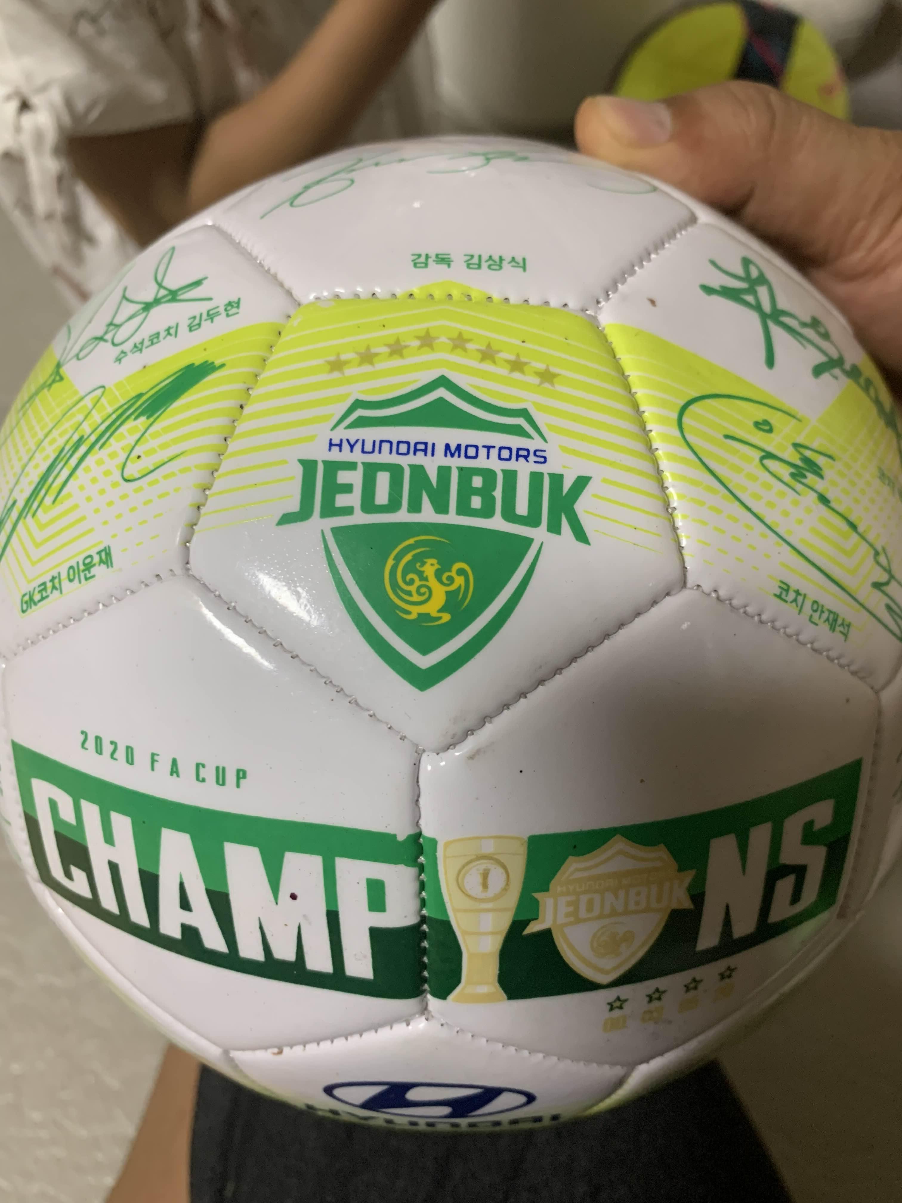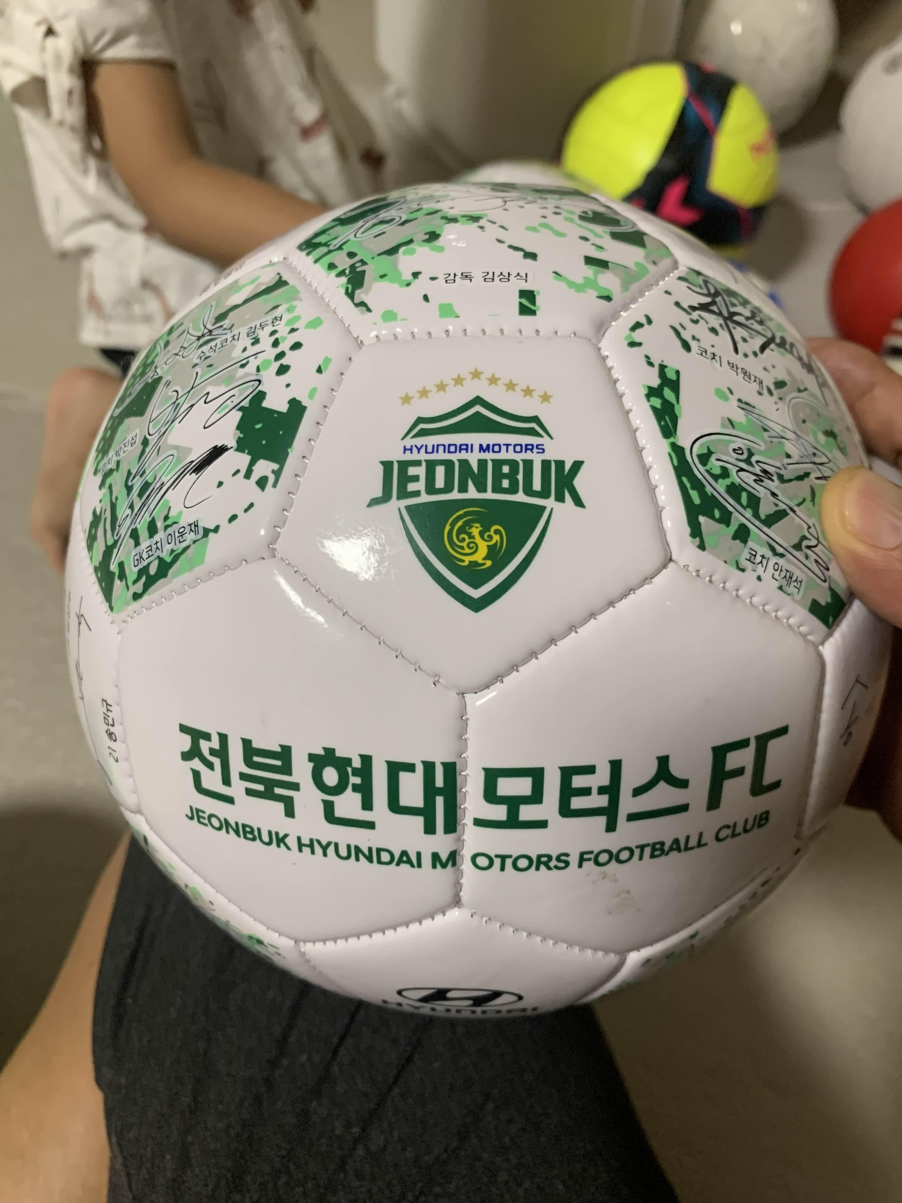전주 월드컵경기장에 전북 현대 홈경기가 있으면 자주 방문합니다. 아이가 그린스쿨 축구교실을 다니고부터.... 2017년도부터 주~~ 다니기 시작했네요. 이제 어느덧 6년 차 축구장을 다녔네요.ㅎㅎ 축구장을 다니며 사인볼을 받았는데.... 오늘은 좀 특별하게 사인볼을 받아서 기분이 좋은 날이네요.ㅎㅎ
