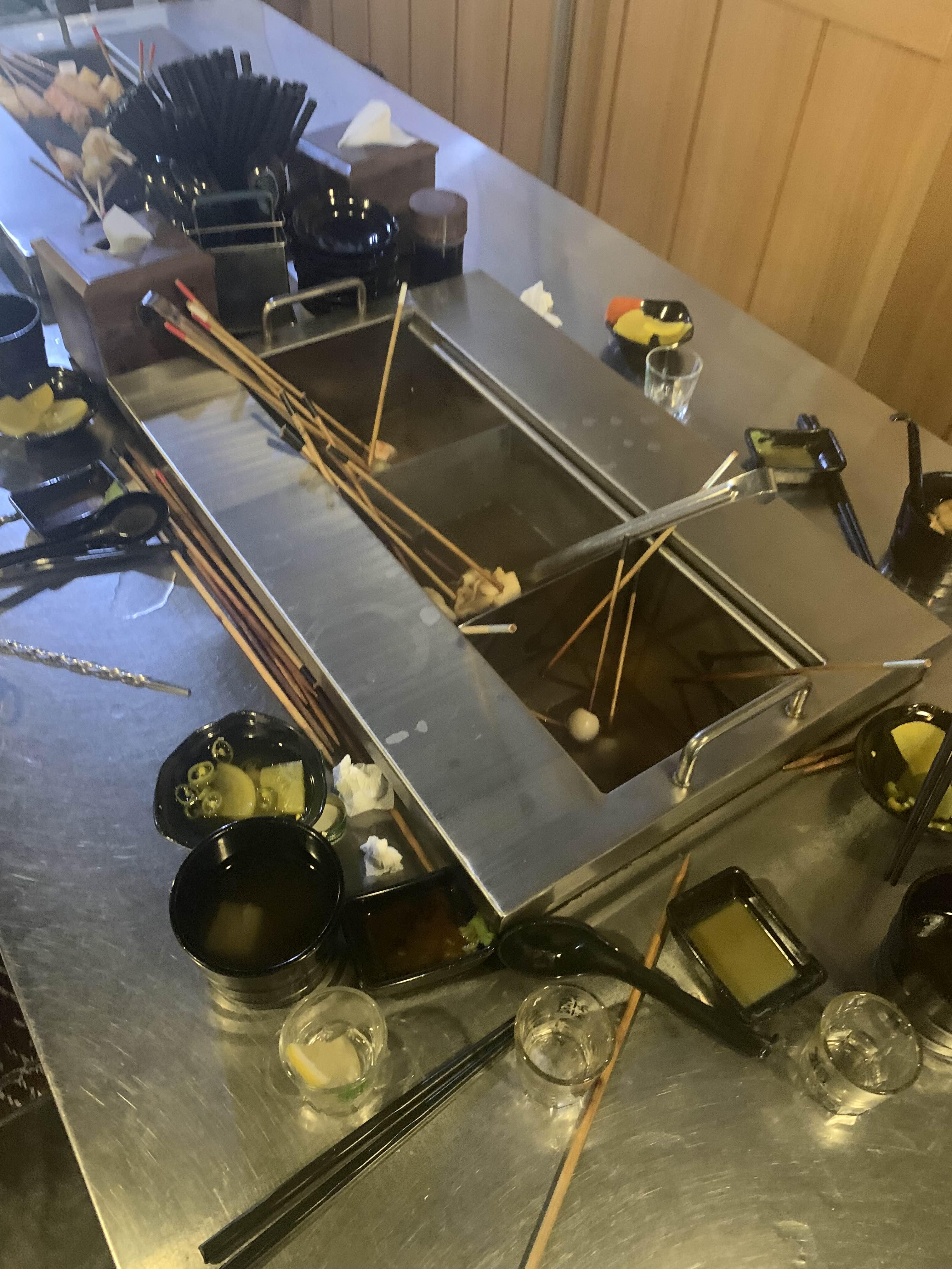 선술집의 의미에서 서서 먹는 스타일은 아니지만!!! 지금 서서 먹는 선술집이 있기나 하겠으나? 선술집에 방문하여 좌석아 앉아보았습니다. 좌석 앞에는 어묵이 있고, 어묵 꼬치 끝부분에는 검정, 빨강, 은색이 보이더군요. 어묵은 하나에 1,900원으로... 생각 없이 먹다나, 가격 폭탄이 나올 수도 있음.ㅎㅎㅎ