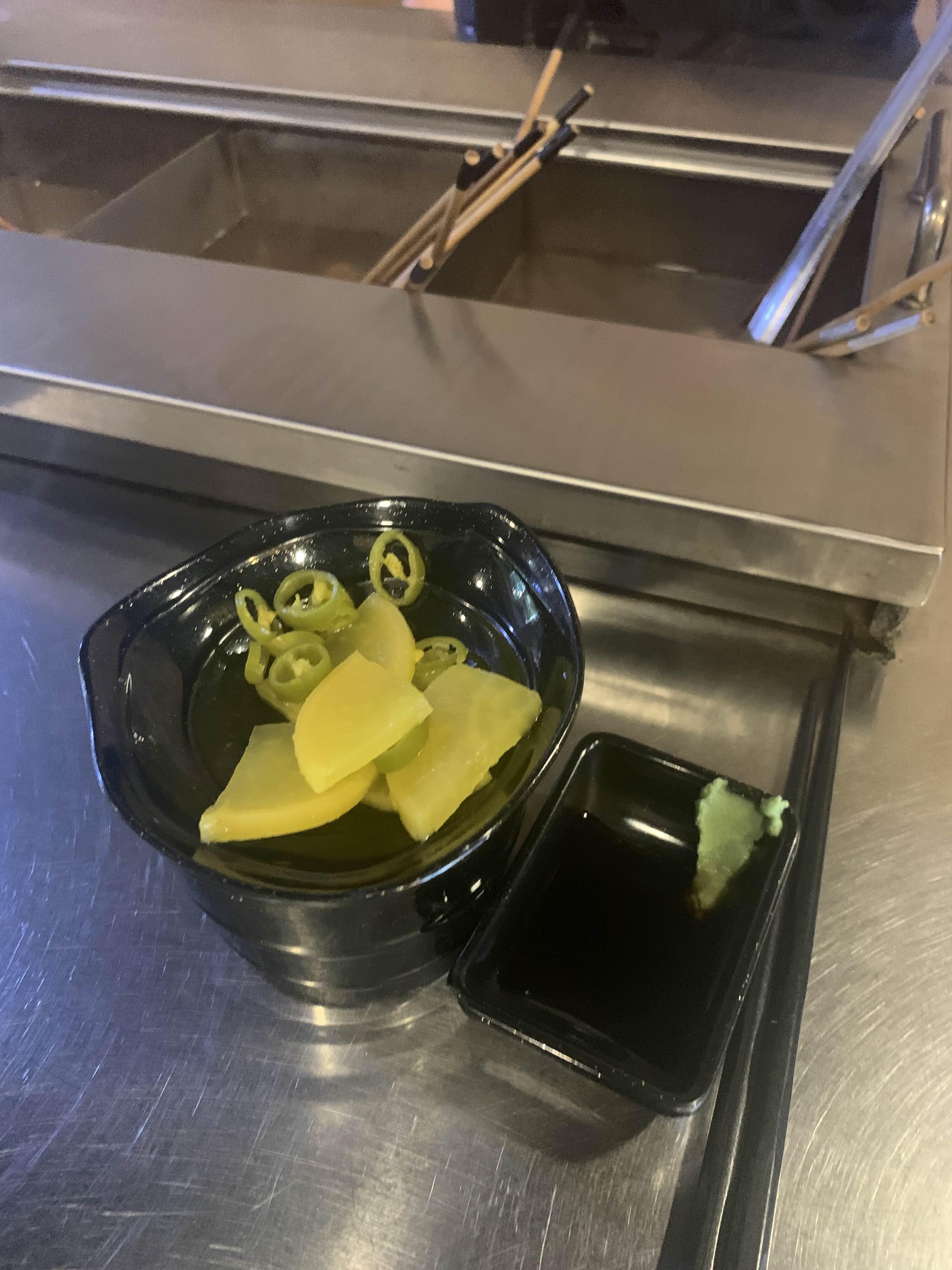 테이블에 앉으면 기본 세팅으로 고추 단무지(상당히 매콤함)와 간장+겨자가 기본으로 나옵니다. 그 외 모든 안주는 어묵!!! 다른 안주도 메뉴만에 많이 있으나... 주문하는 테이블은 없더군요. 메뉴판에 메뉴가 많기는 하더군요.ㅎㅎ