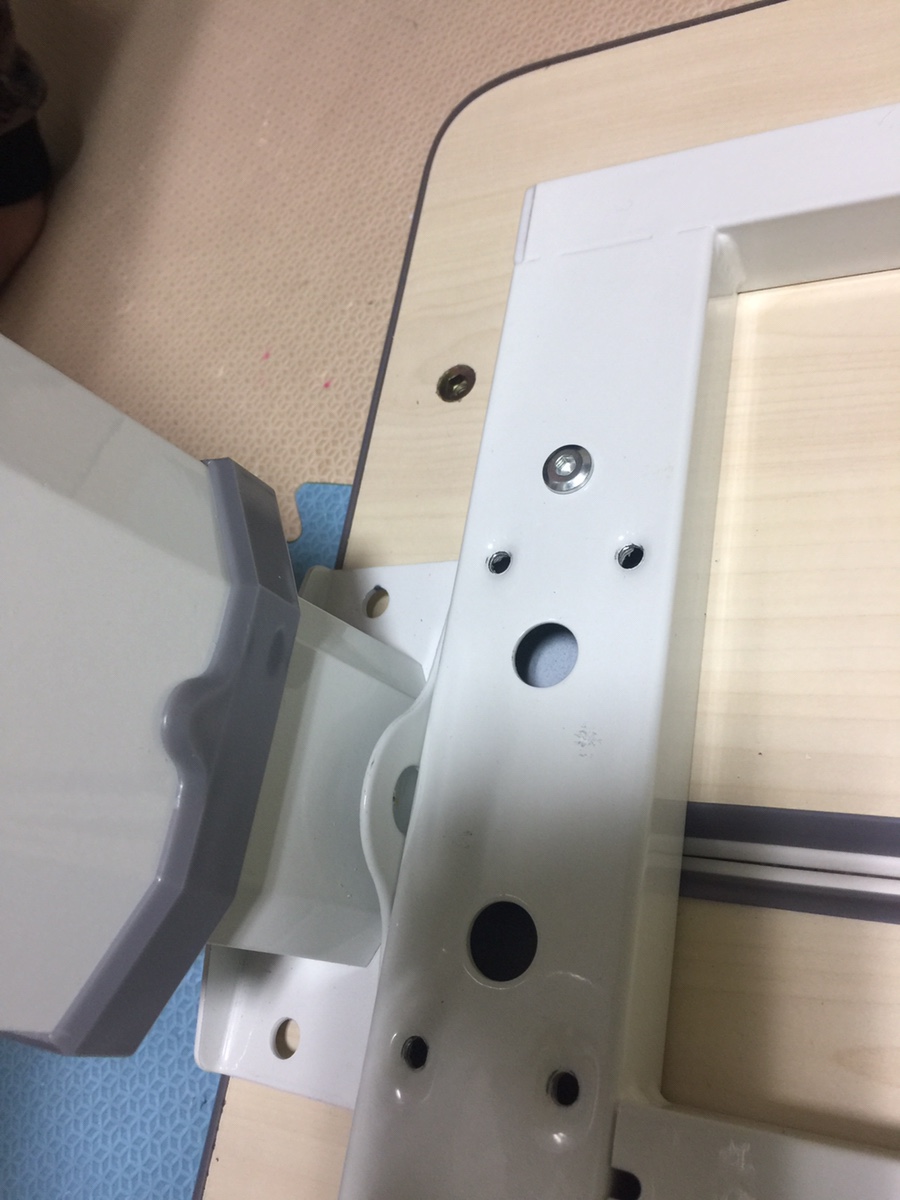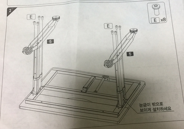 더 재미있는 건 책상과 다리를 고정하는 부분인데.... 설명서는 피스 4개를 삽입하도록 되어있어서 한쪽은 4개 삽입하여 정확히 고정하였는데, 다른 한쪽은 4개를 삽입할 수 있는 부분이..... 구멍이 2개만 있더군요... 헉!!! 더 이상 조립을 할 수가 없어서 조립 포기했습니다.