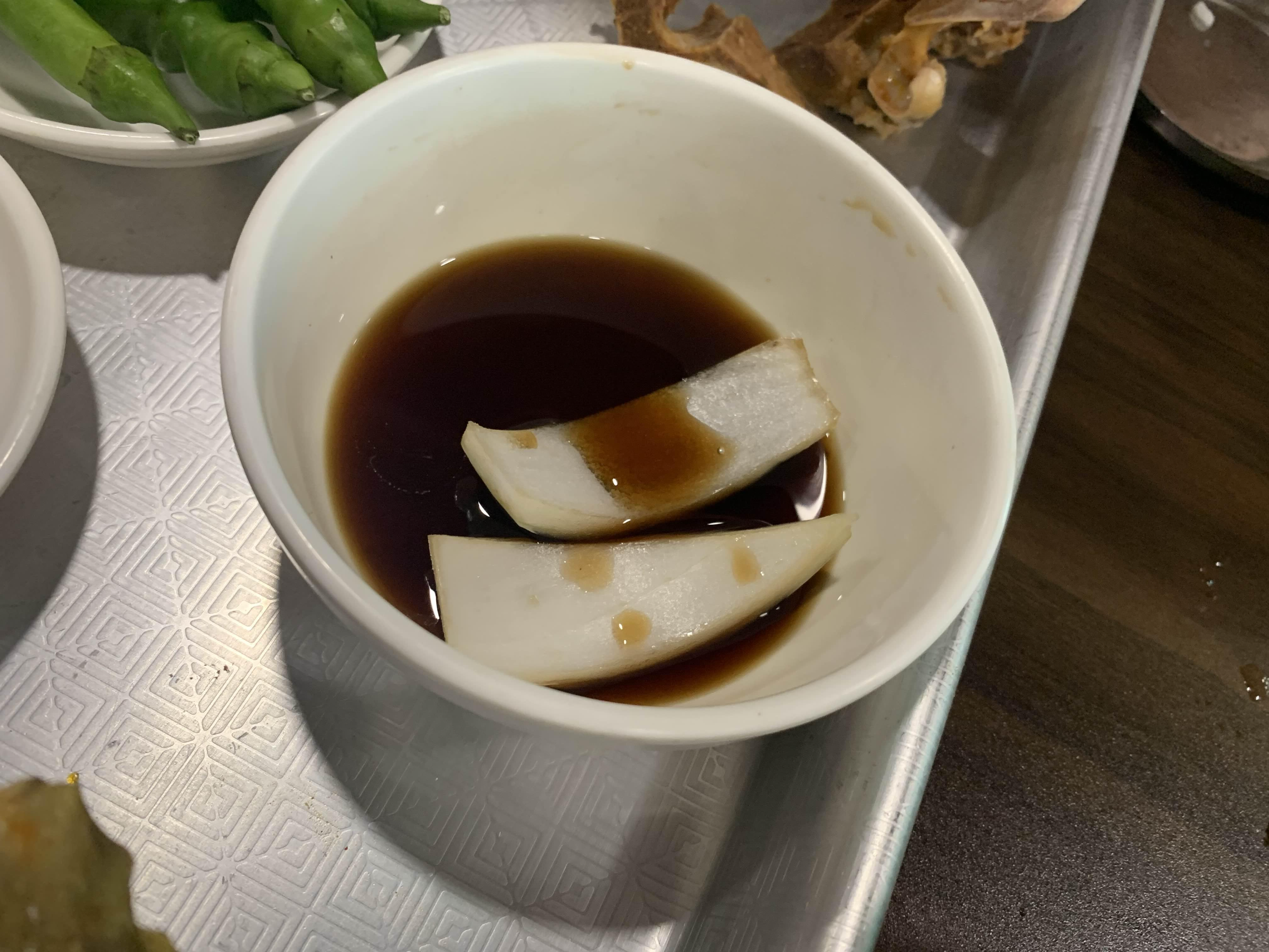 뼈해장국을 먹으며 초반에는 깍두기를 먹었는데.... 해장국을 먹으면 먹을수록, 양파!! 간장에 빠진 양파에 자주 손에 가더군요. 간장에 살짝 담가서 먹는 양파인데... 이게 뼈해장국 와 이렇게 잘 어울릴 거라는 생각은.... 누구도 못했을 거 같습니다.