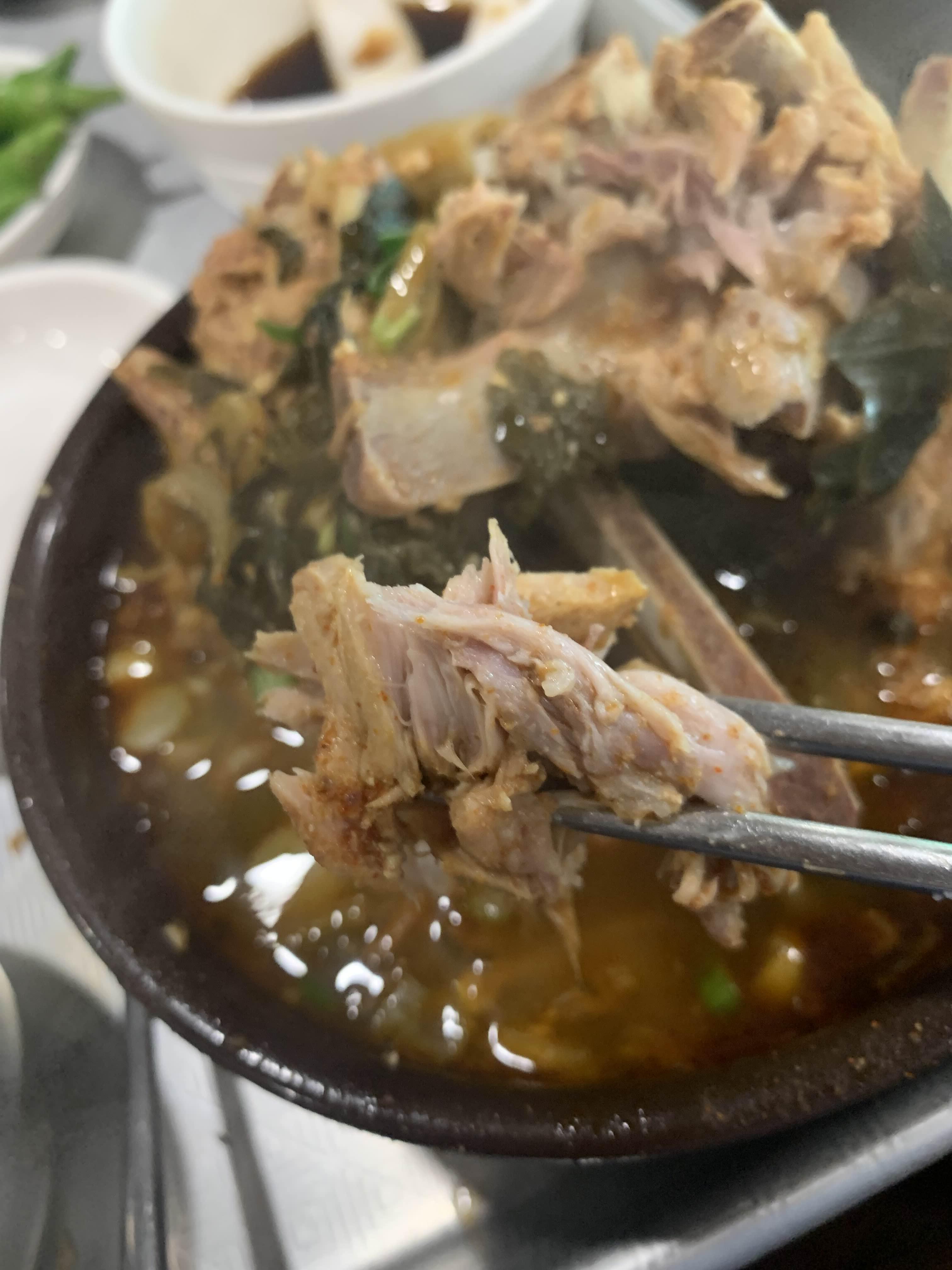 뼈해장국 국물은 나무랄 때 하나도 없는 깔끔하더군요. 몇몇 뼈해장국 국물은 한꺼번에 뼈를 삶아서.. 국물 맛이 둔탁한 맛이 있기도 하는데, 국물이 상당히 깔끔하게 떨어지더군요. 뼈에 붙은 고기도 적당히 삶아져... 입으로 후루룩 떨어질 정도의 식감을 유지해주더군요.