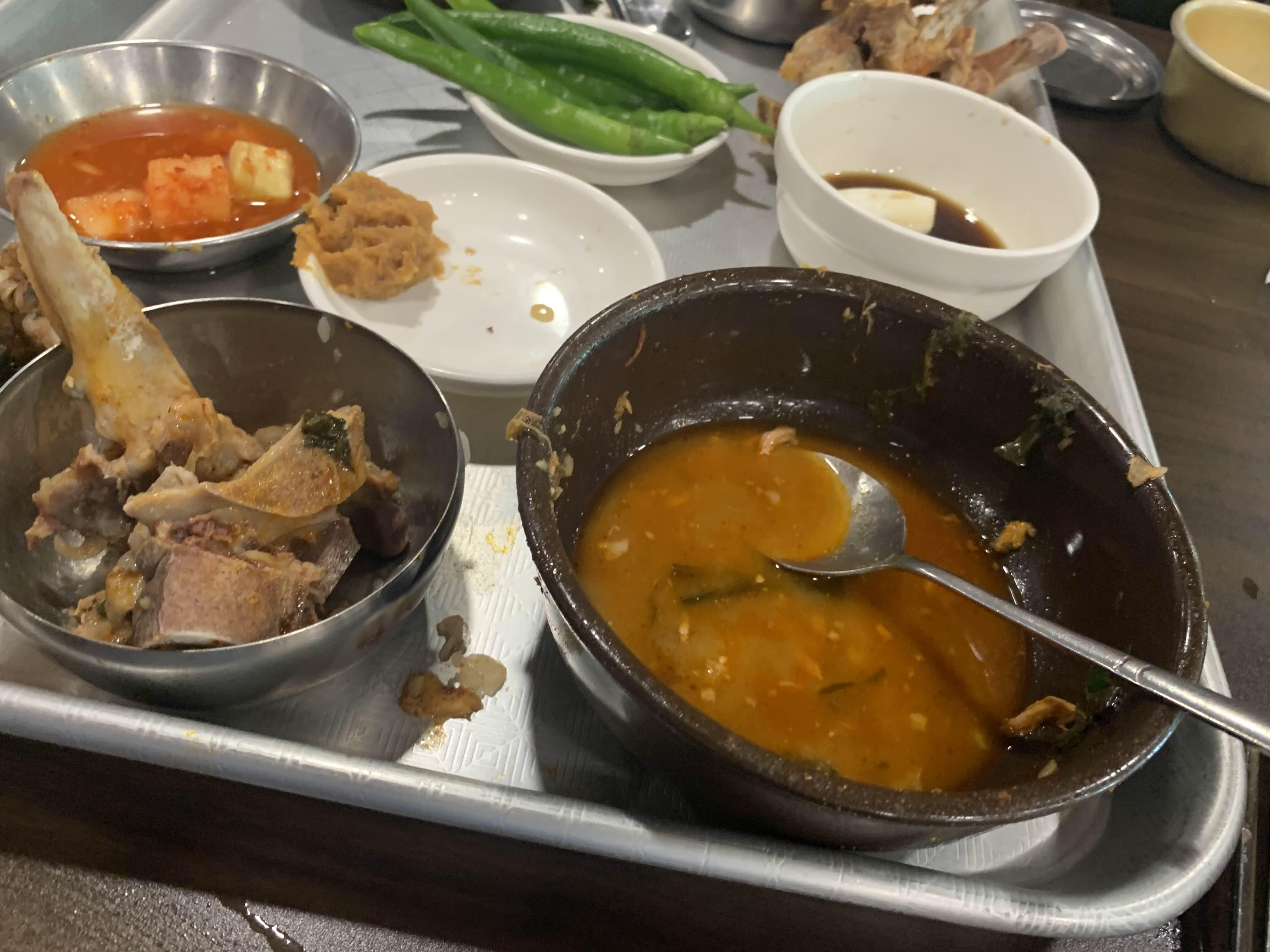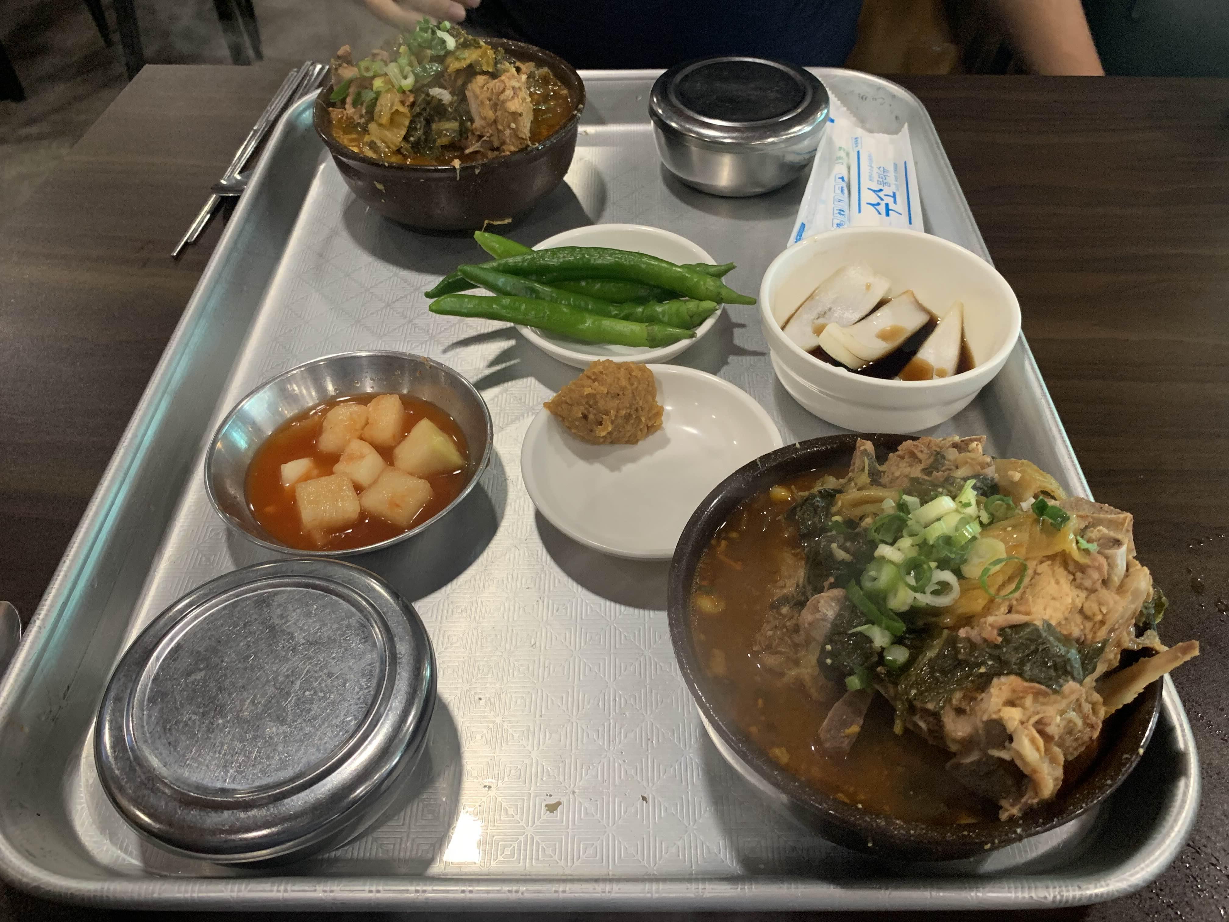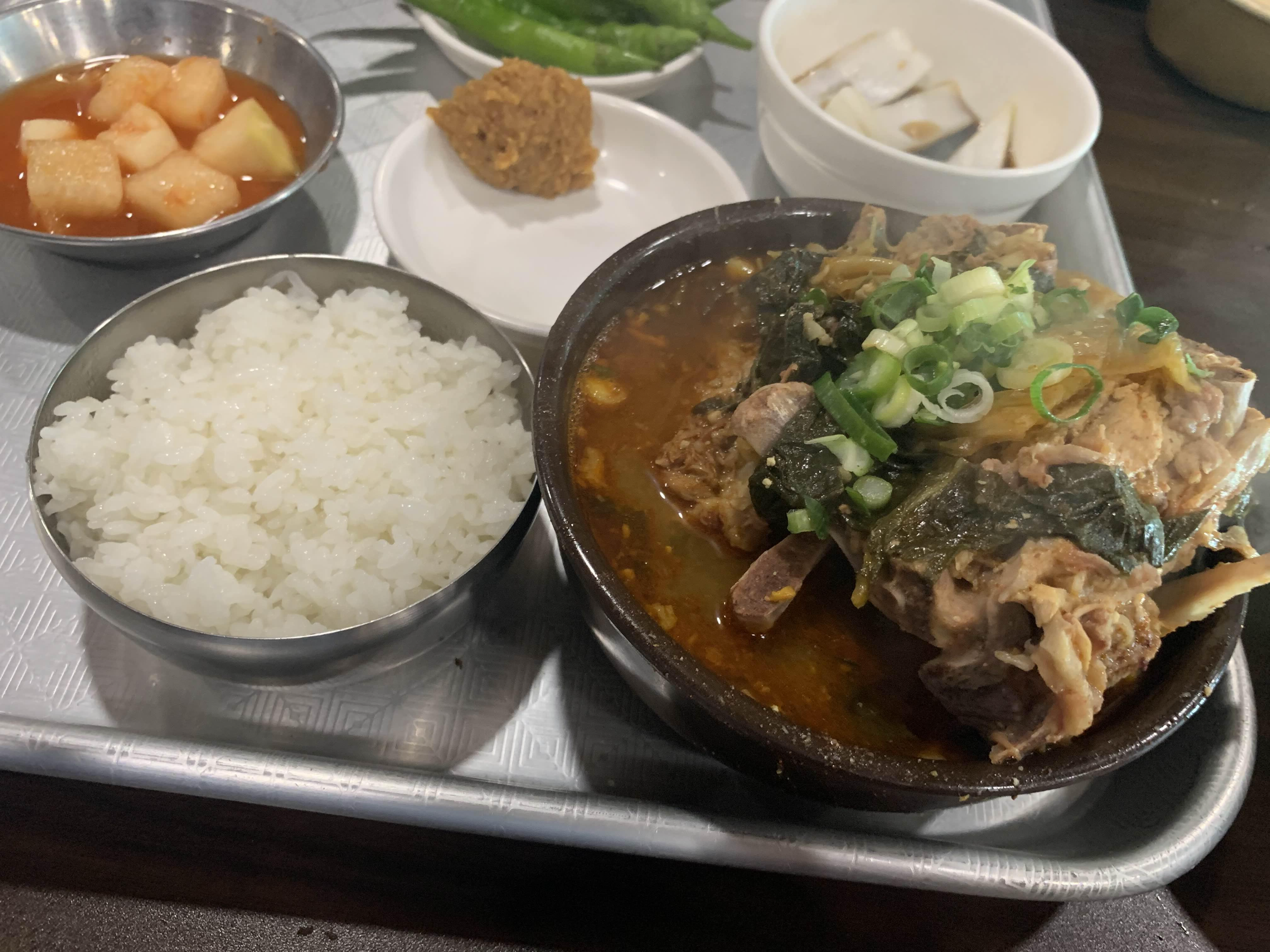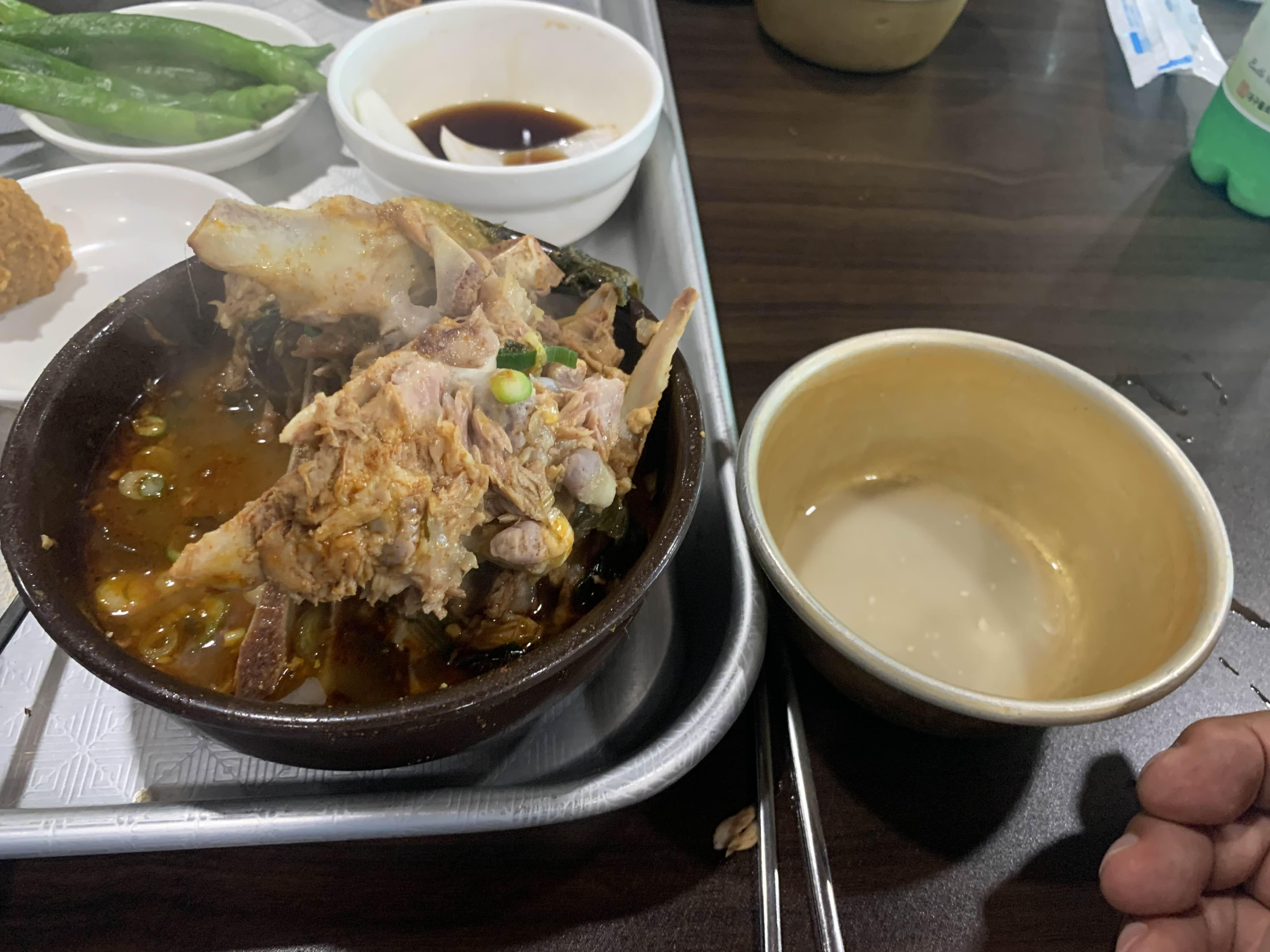 주문한 지 얼마 되지 않아... 주문했던? 자동 주문한 메뉴판의 "식사" 음식이 나왔습니다. 밑반찬으로 깍두기와 간장이 나오는데... 뼈해장국 와 어느 정도 궁합이 좋은 밑반찬으로 구성되어 있더군요. 특히 양파!!! 간장인지 간장에 물 타서 염도를 줄였는지는 모르겠으나... 이 간장에 빠진 양파가 느끼해질 수 있는 뼈해장국과 찰떡궁합을 이루더군요.