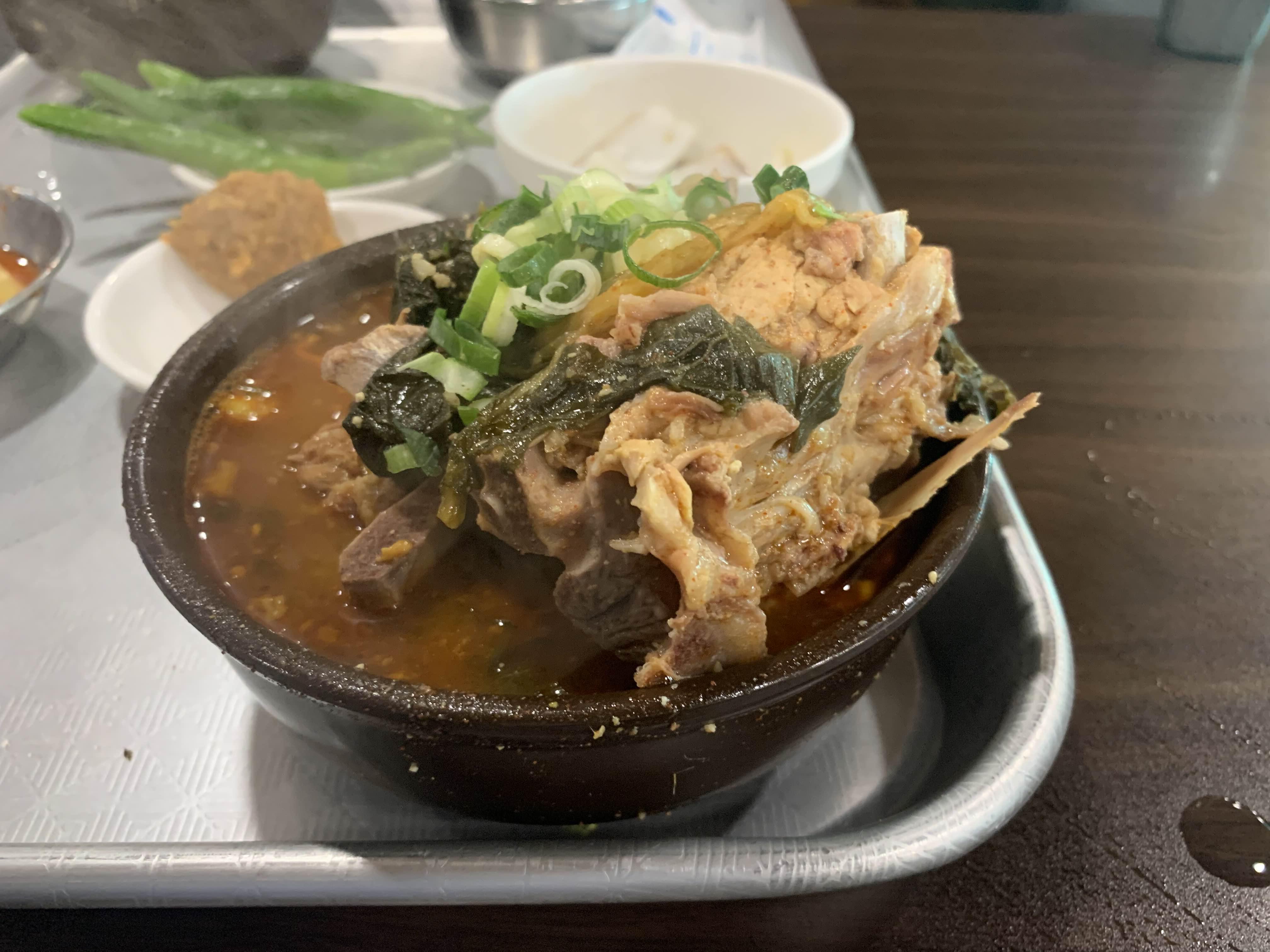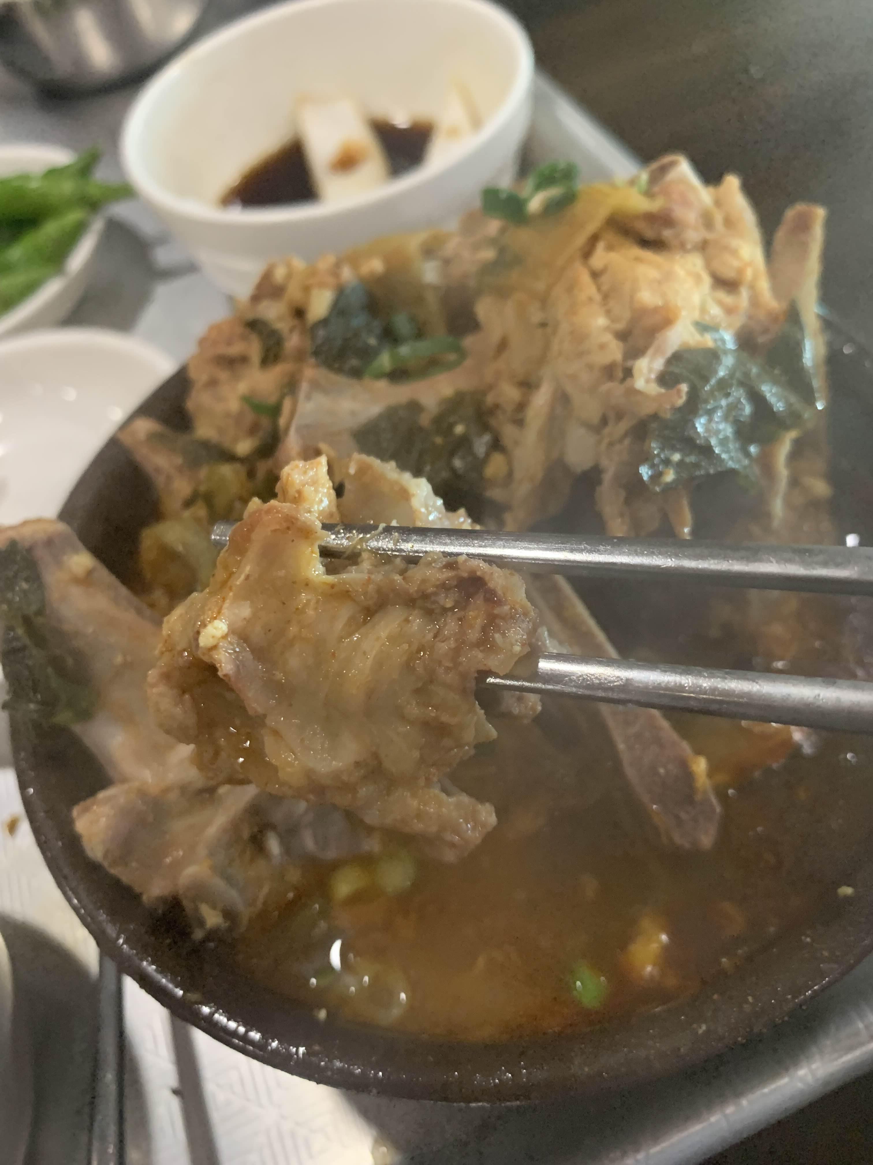 뼈해장국 뚝배기가 사진으로는 크게 보이는데.. 실물은 일반적으로 보았던 뚝배기보다는 좀 작은 사이즈입니다. 뚝배기 위 뼈가 알차게 쌓여있어서 비주얼은 꽤 그럴싸하게 보이네요. 뚝배기 사이즈만 볼 때, 양이 좀 적겠다는 생각이 들기도 했지만... 먹다 보면 적은 양은 아니더군요.