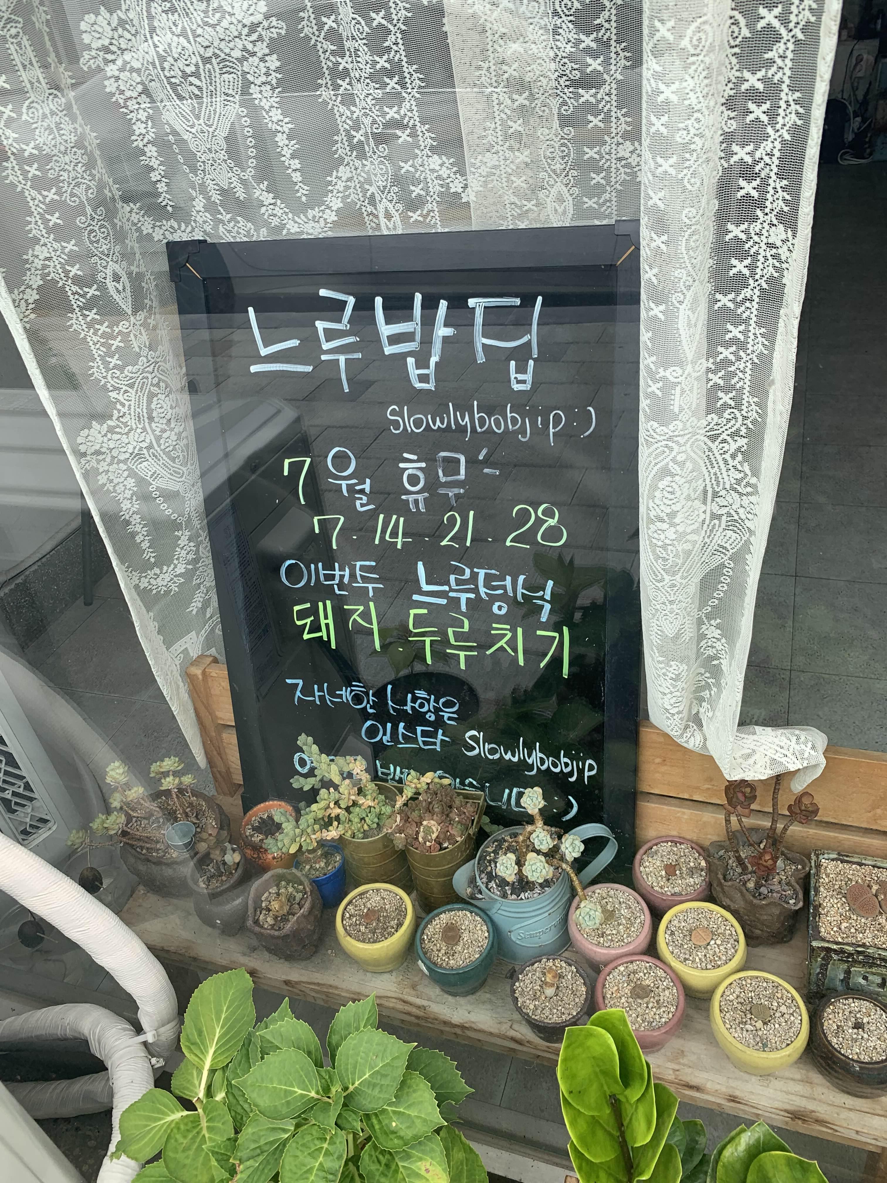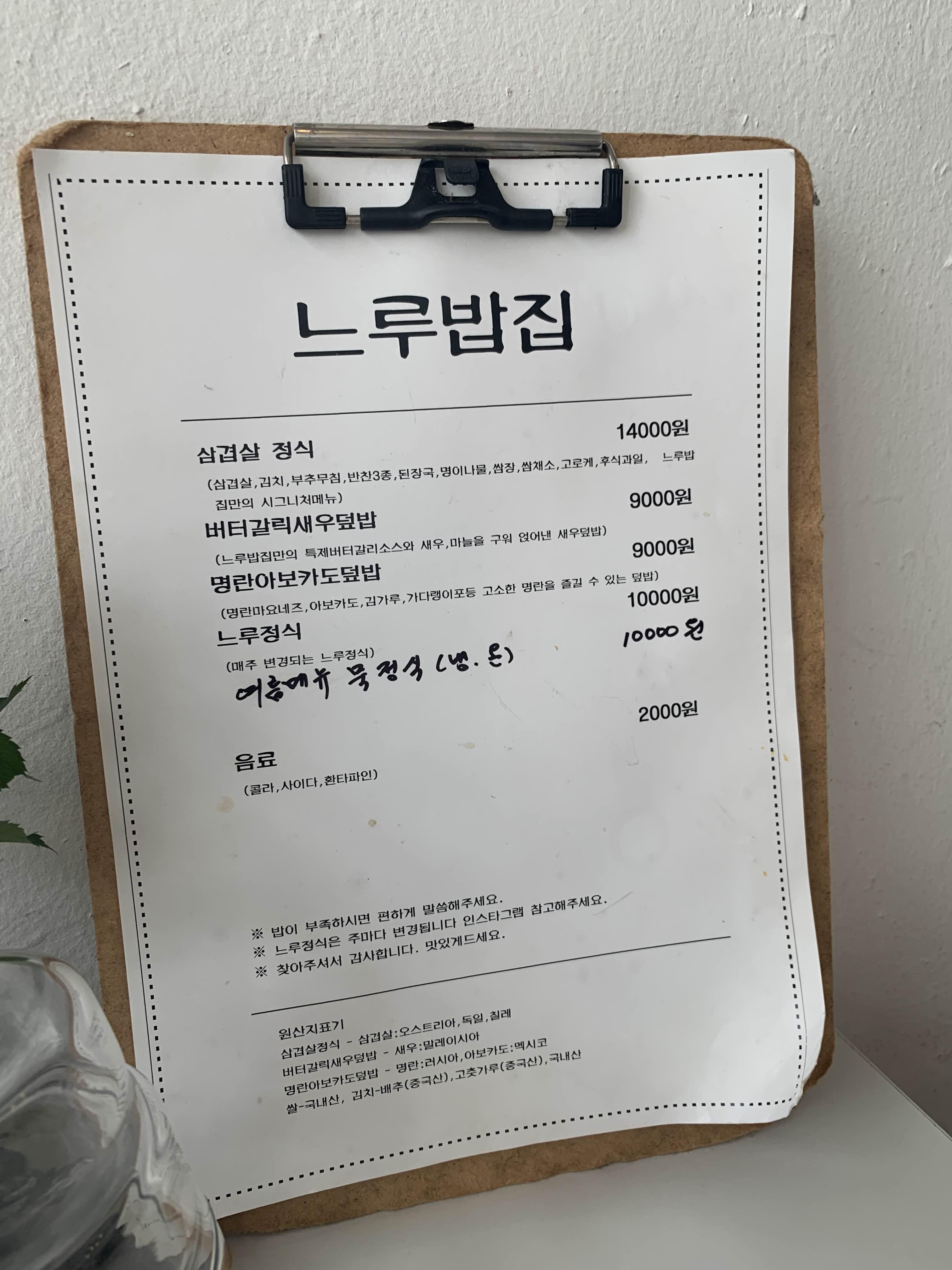 식당에 들어서며 보이던 안내판!!! 느루 정식 메뉴는 매주 변경되는 거 같더군요. 방문한 시기에는 돼지 두루치기가 정식으로 나오는 날이더군요. 돼지 두루치기를 평소 좋아하는 메뉴라!! 큰 고민 없이 주문했습니다. 1인 가격은 만원으로, 점심식사 가격으로는 좀 나가는 가격대이더군요.