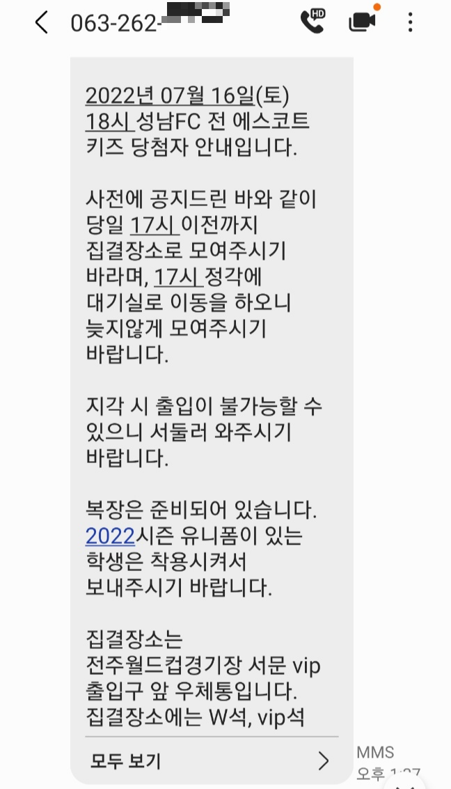 축구경기 약 1시간 전 전주 월드컵경기장 우체통에 모여서 안내를 받고.. 아이들은 축구경기장으로 들어갑니다. 에스코트 키즈 담당자분께서는 부모님들에게 추가 설명을 해주고 해산!!! 에스코트 키즈가 끝나고... 만나는 장소가 모였던 장소가 아닌 W-1 입장하는 매점 쪽에서 해산하시더군요. 예전에는 모였던 장소에서 해산을 했었는데^^