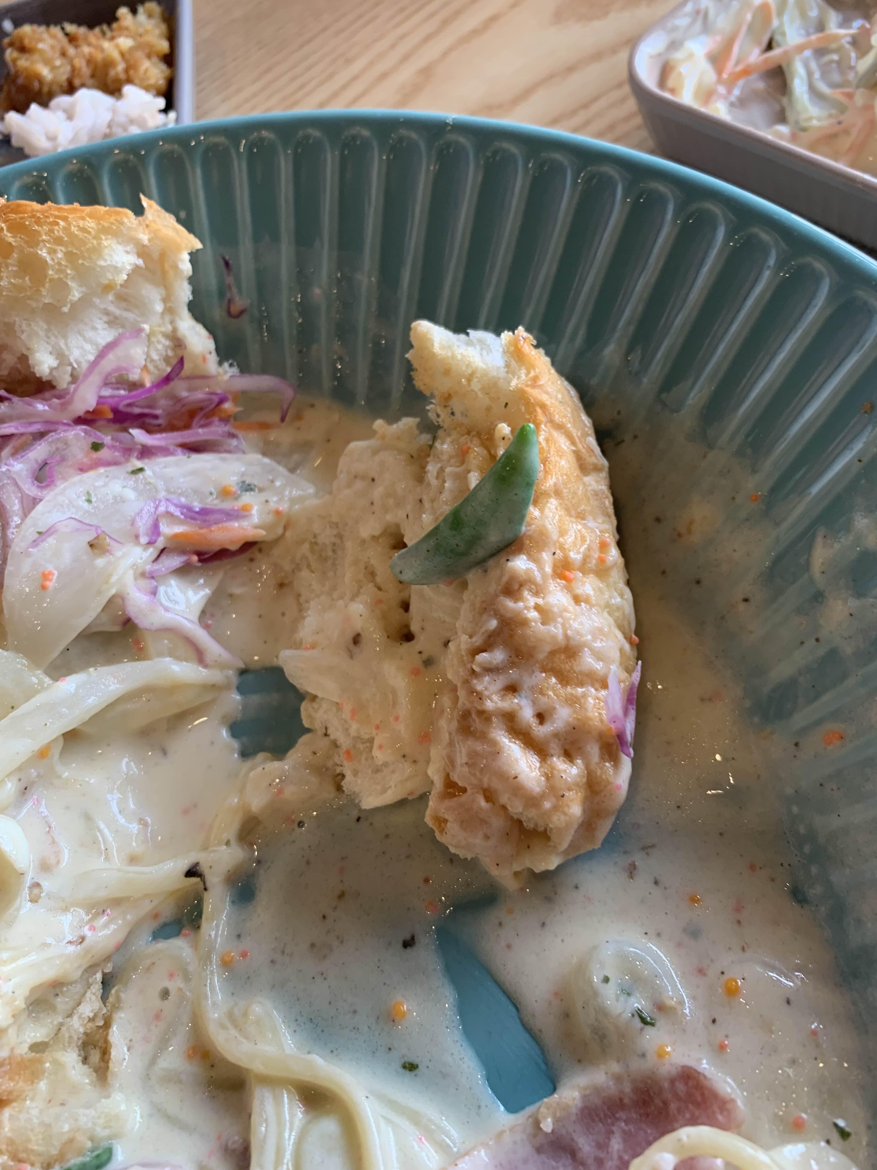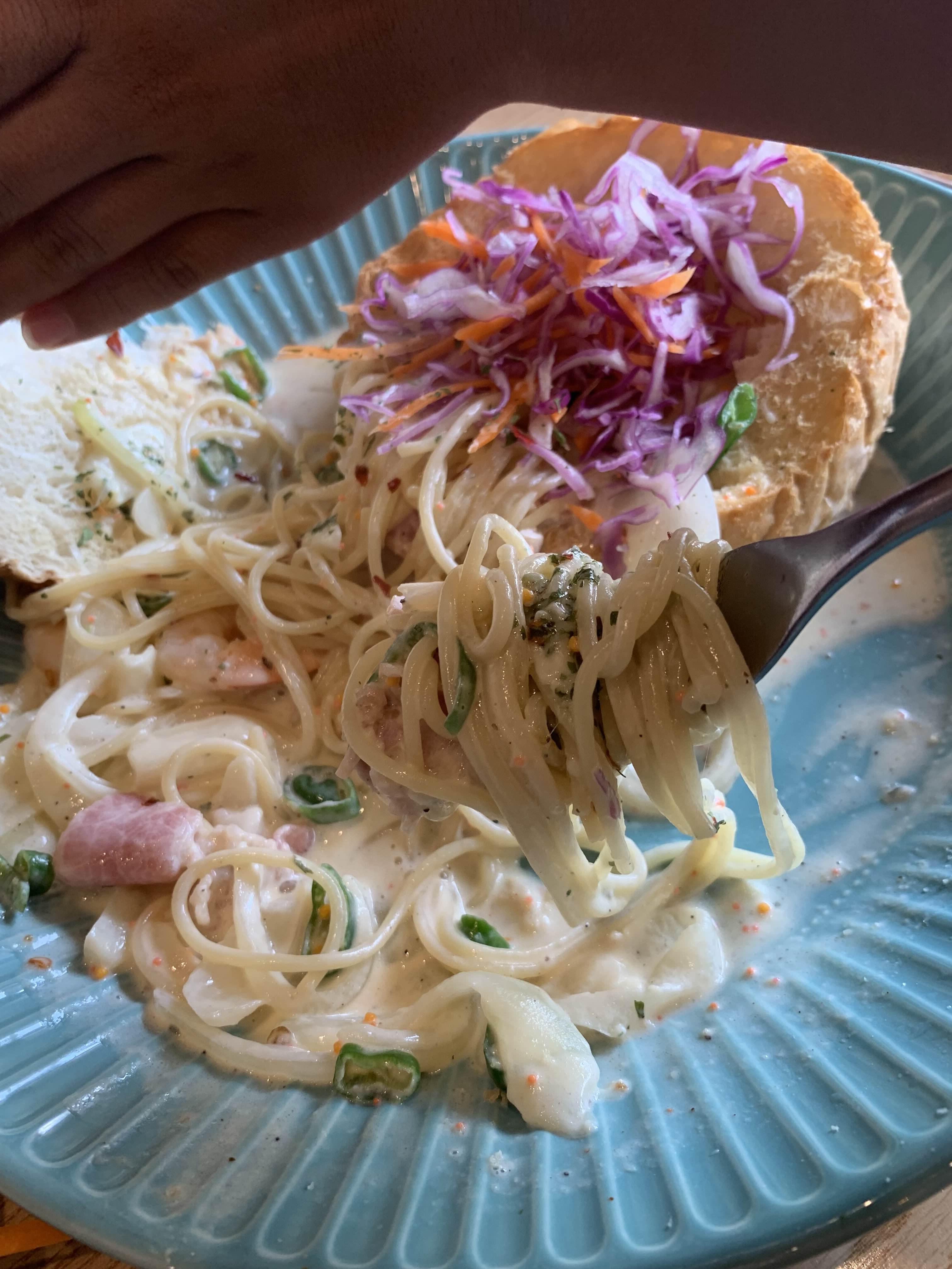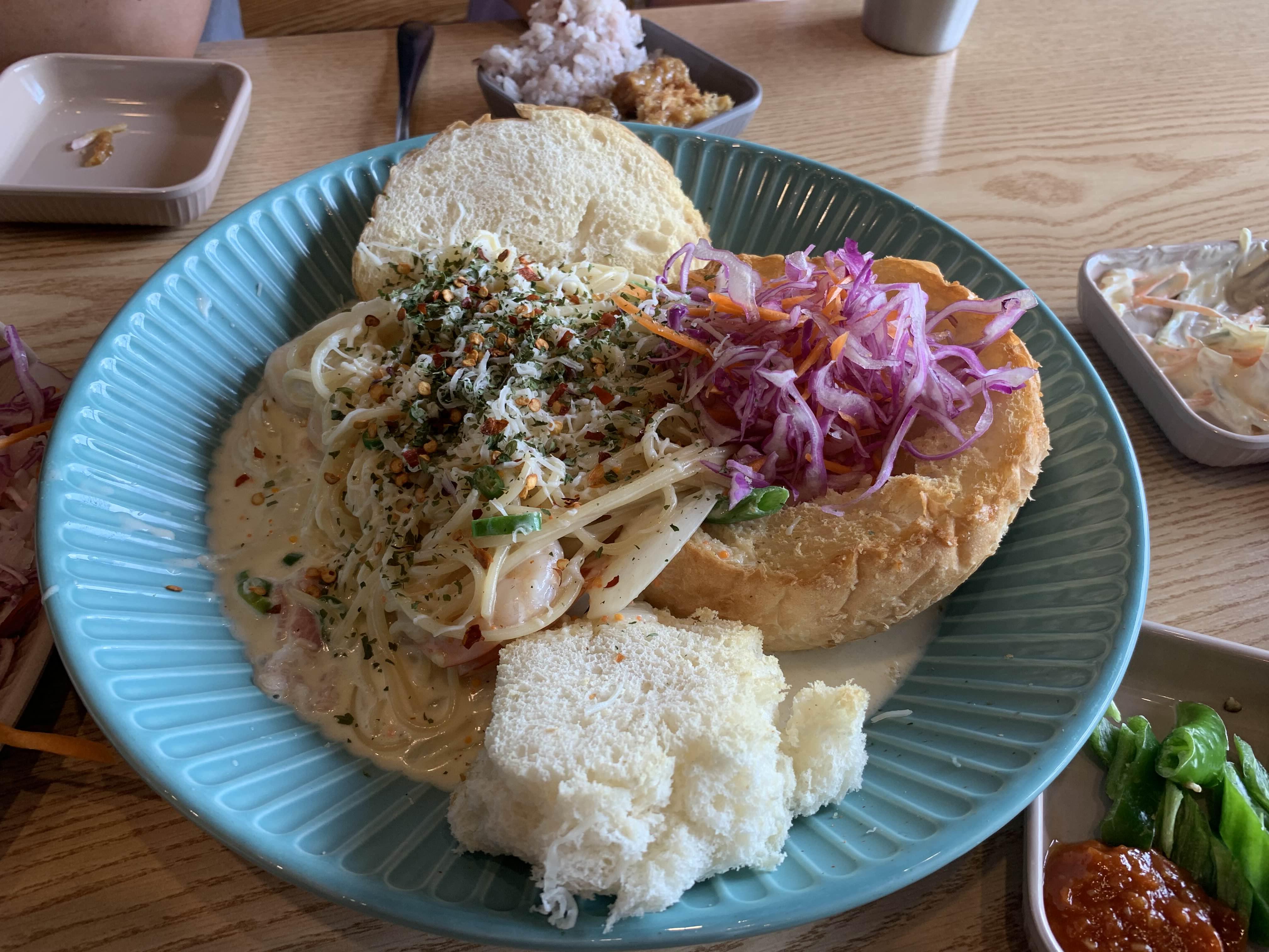 그리고 우리 가족에서 호불호가 갈렸던... 빵 안에 들어있던 양배추?! 나는 식감이랑 향이 무지 좋았는데... 아내와 큰 아이는 무지 싫어하더군요. 파스타의 호불호가 없던 빵!!! 고추가 들어간 알싸한 맛이 느껴지는 크림소스! 정말 최근에 맛본 파스타 중 최고였습니다.