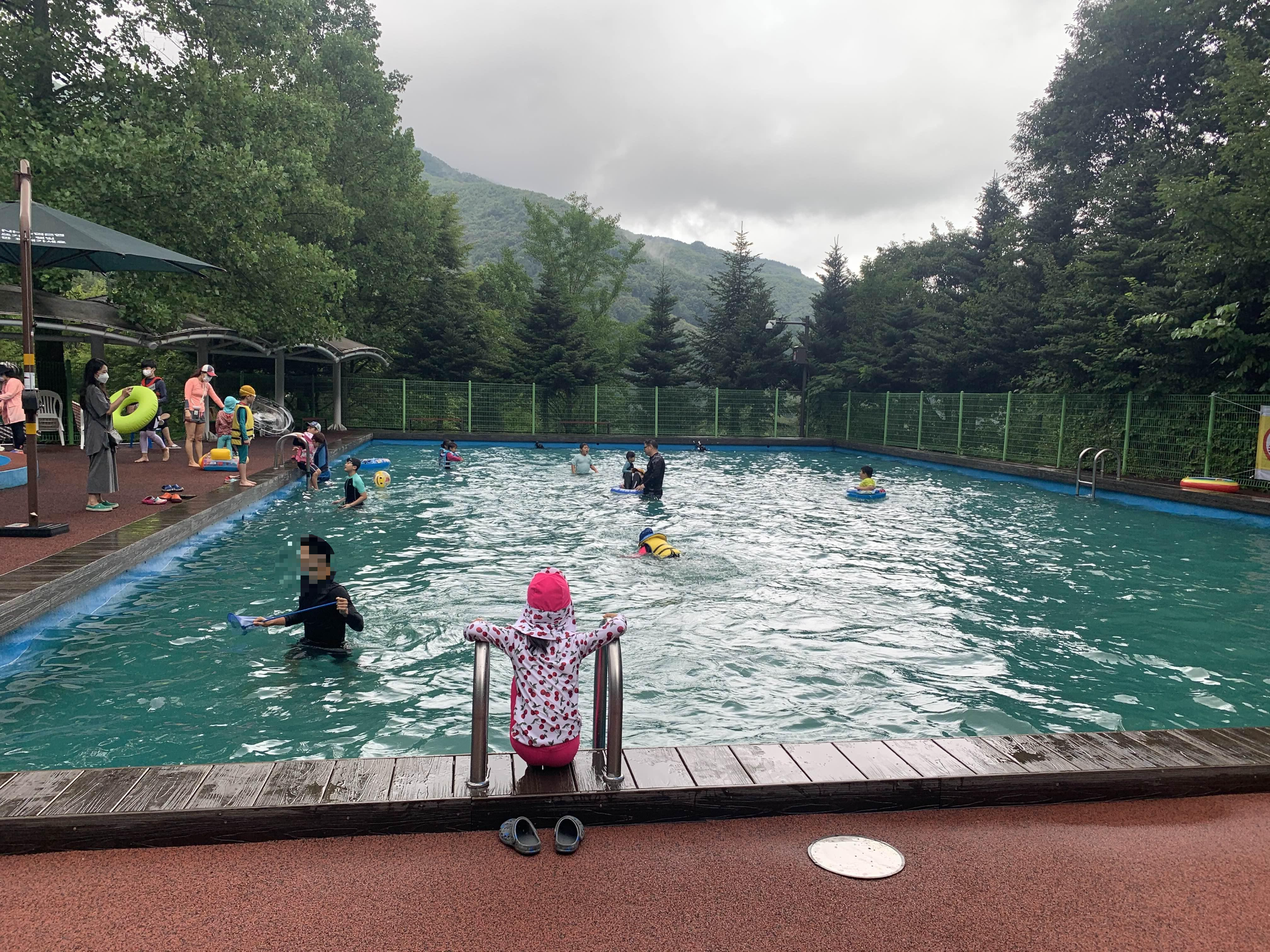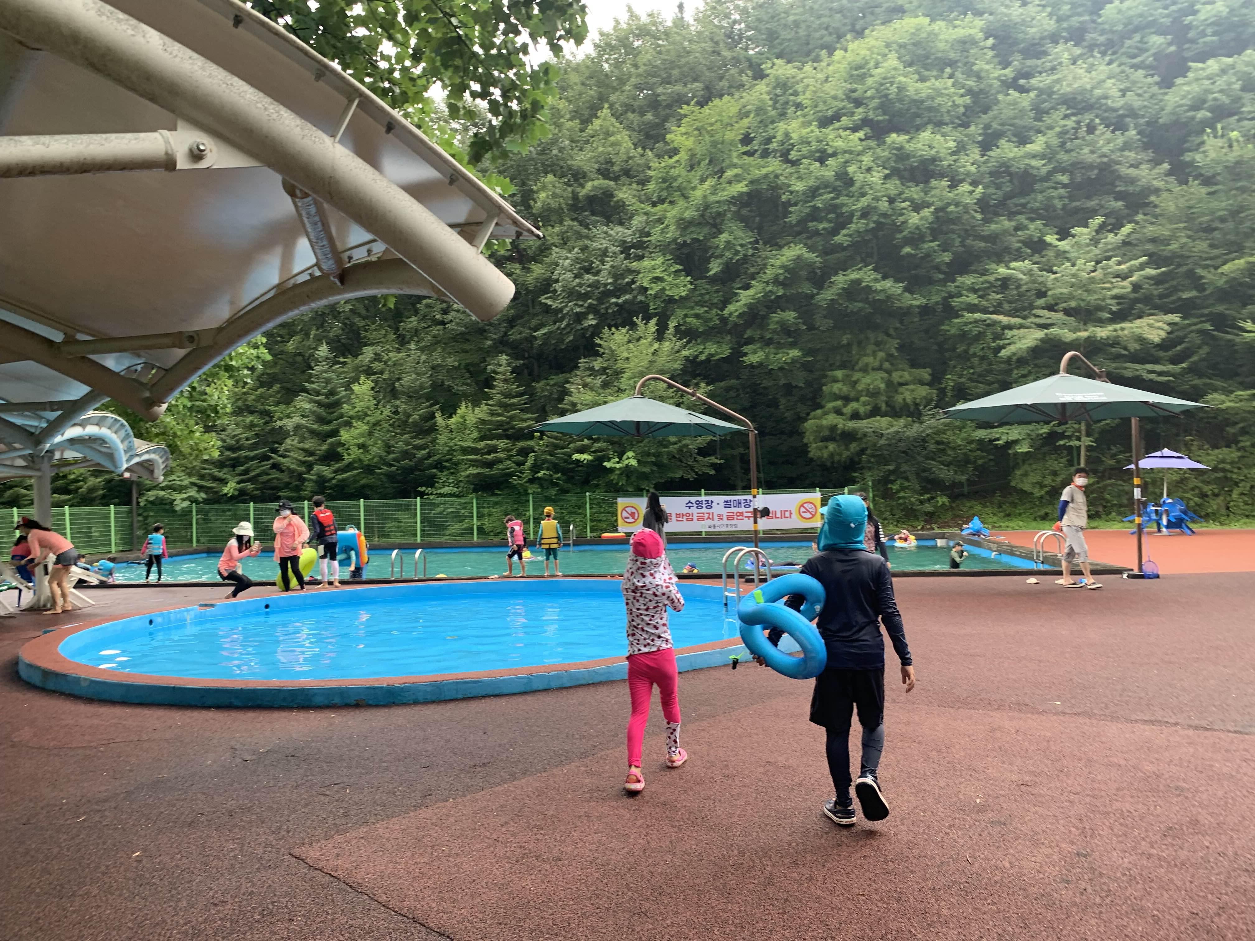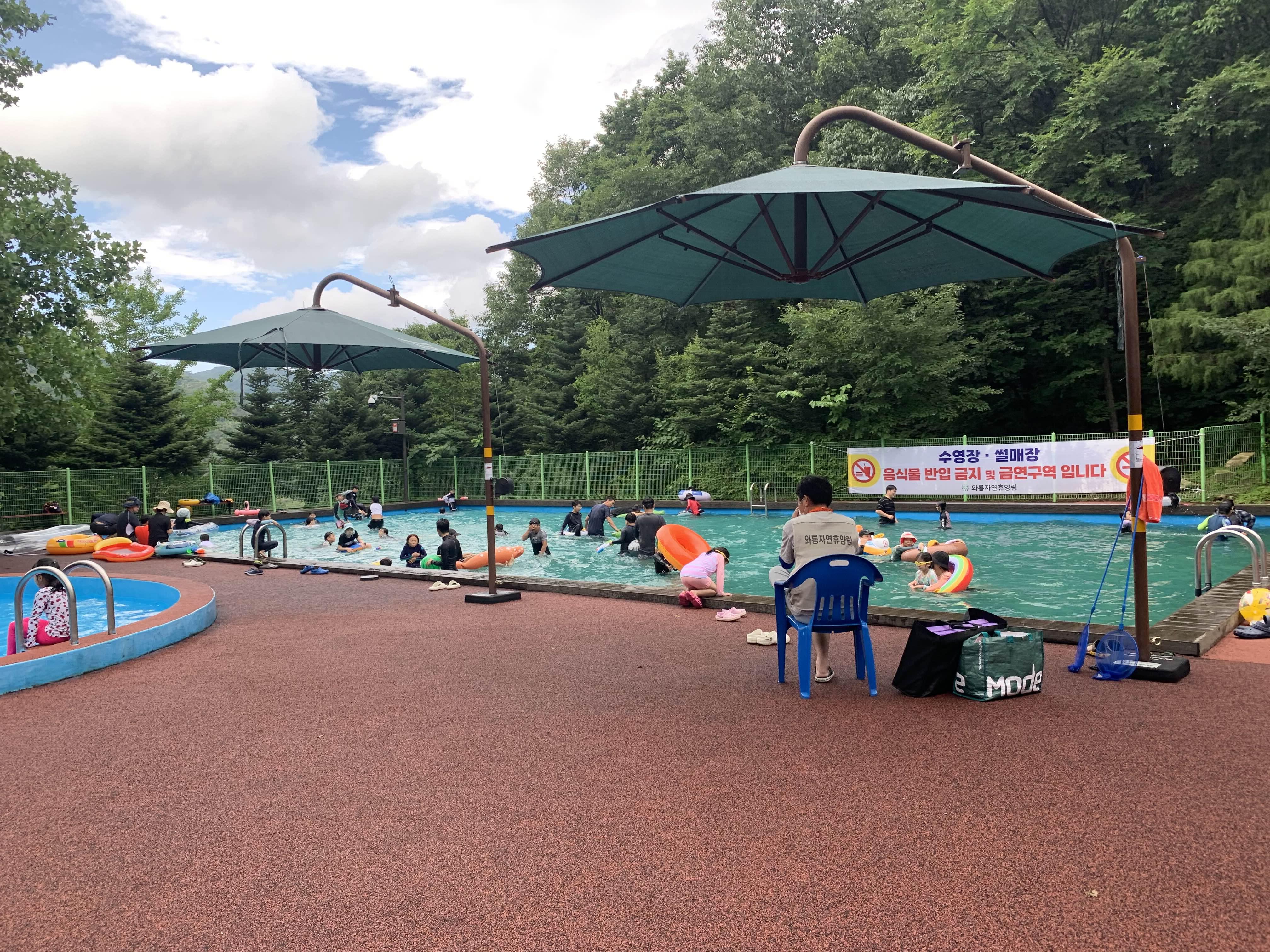장수 와룡 자연휴양림의 수영장을 이용하기 위해서는 휴양림의 시설(숙박, 캠핑 태그, 평상 등) 이용해야 합니다. 이런 시설을 이용하지 않은 나로서는.... 평상대여를 안내소에서 이야기해주시더군요. 평상 있는 곳에 자리를 잡으면, 안내원이 결재를 해주신다고. 평상의 여유가 있는지 물어보니.... 많이 있다고 하더군요. 비가 이렇게 오니.ㅋㅋㅋ 사람들이 왔을 리가 없겠죠?ㅎㅎ
