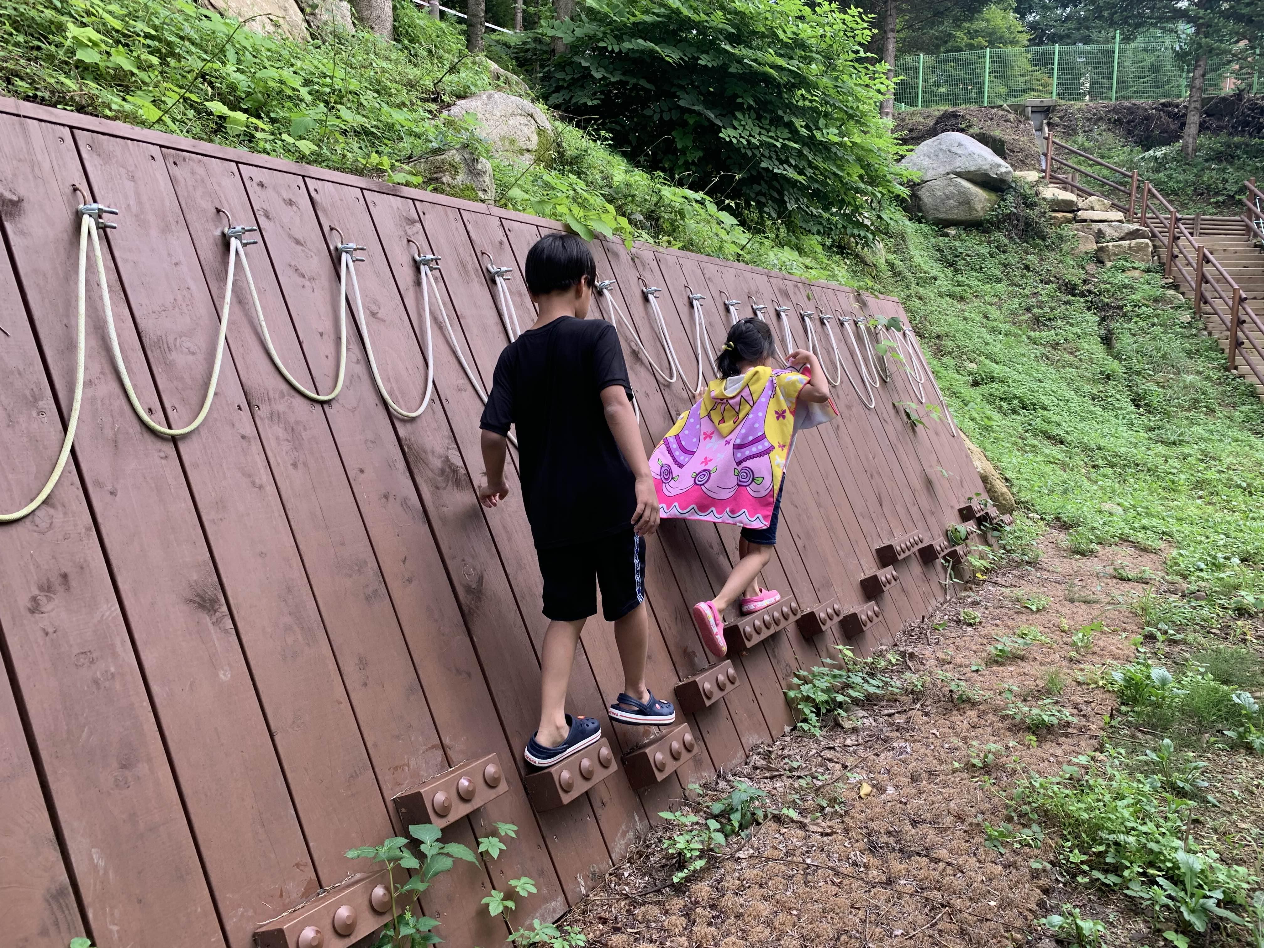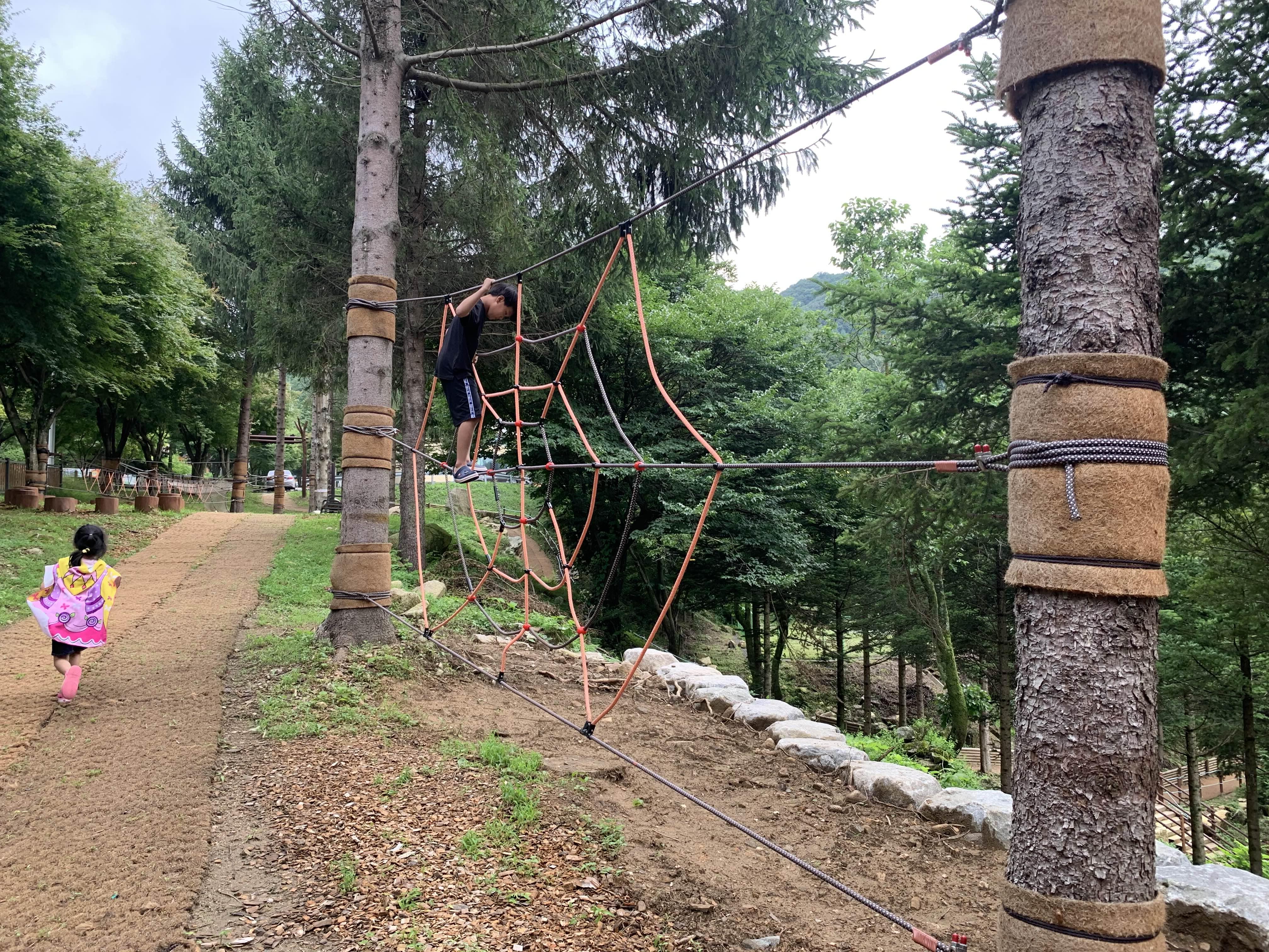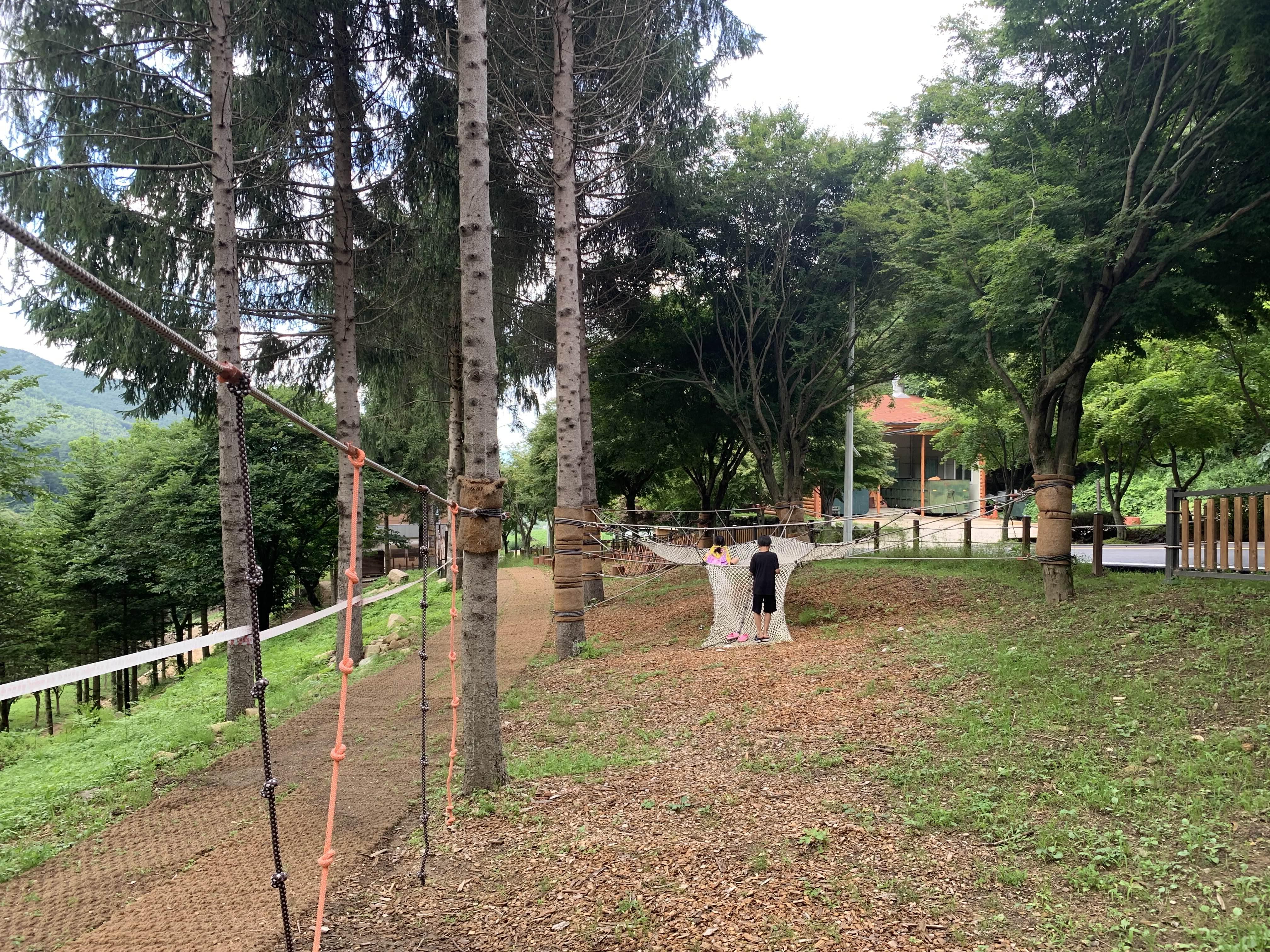 다시 수영장을 이용~~ 날씨가 너무 추워서 중간에 집으로 복귀하려 했지만.... 밥 먹는 사이 무더워진 날씨에, 오후 마감시간까지 물놀이를 즐기고 퇴장했습니다. 집으로 복귀하던 길!!! 자연휴양림 집 구 쪽에 모험놀이터가 준비되어 있더군요.