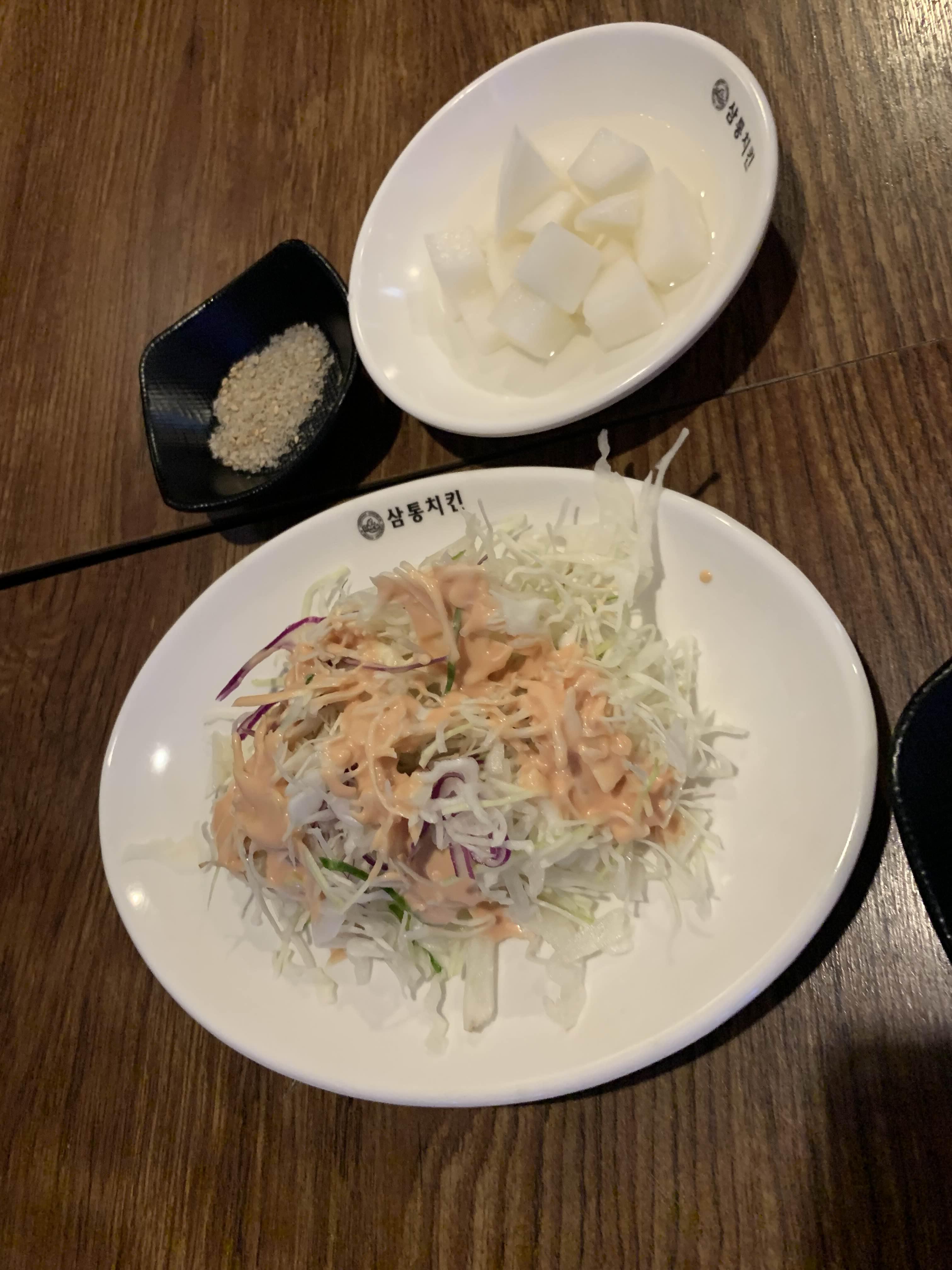 치킨을 주문하면 샐러드로 양배추에 마요 케첩 소스를 뿌려서 나오더군요. 이런 샐러드는 예전에 많이 나오는 방식인데... 오랜만에 만나니 반갑네요.ㅎ